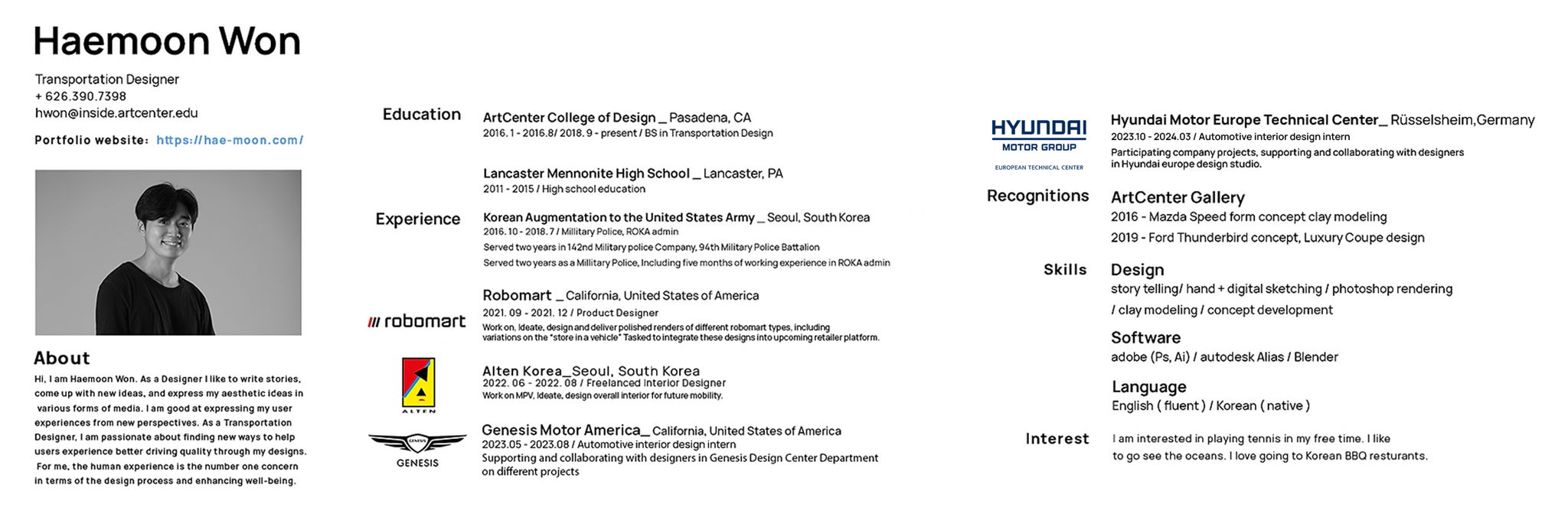 I like to write stories, come up with new ideas, and express my aesthetic ideas in various forms of media. I am passionate about finding new ways to help users experience better driving quality through my designs. For me, the human experience is the number one concern in terms of the design process and enhancing well-being.