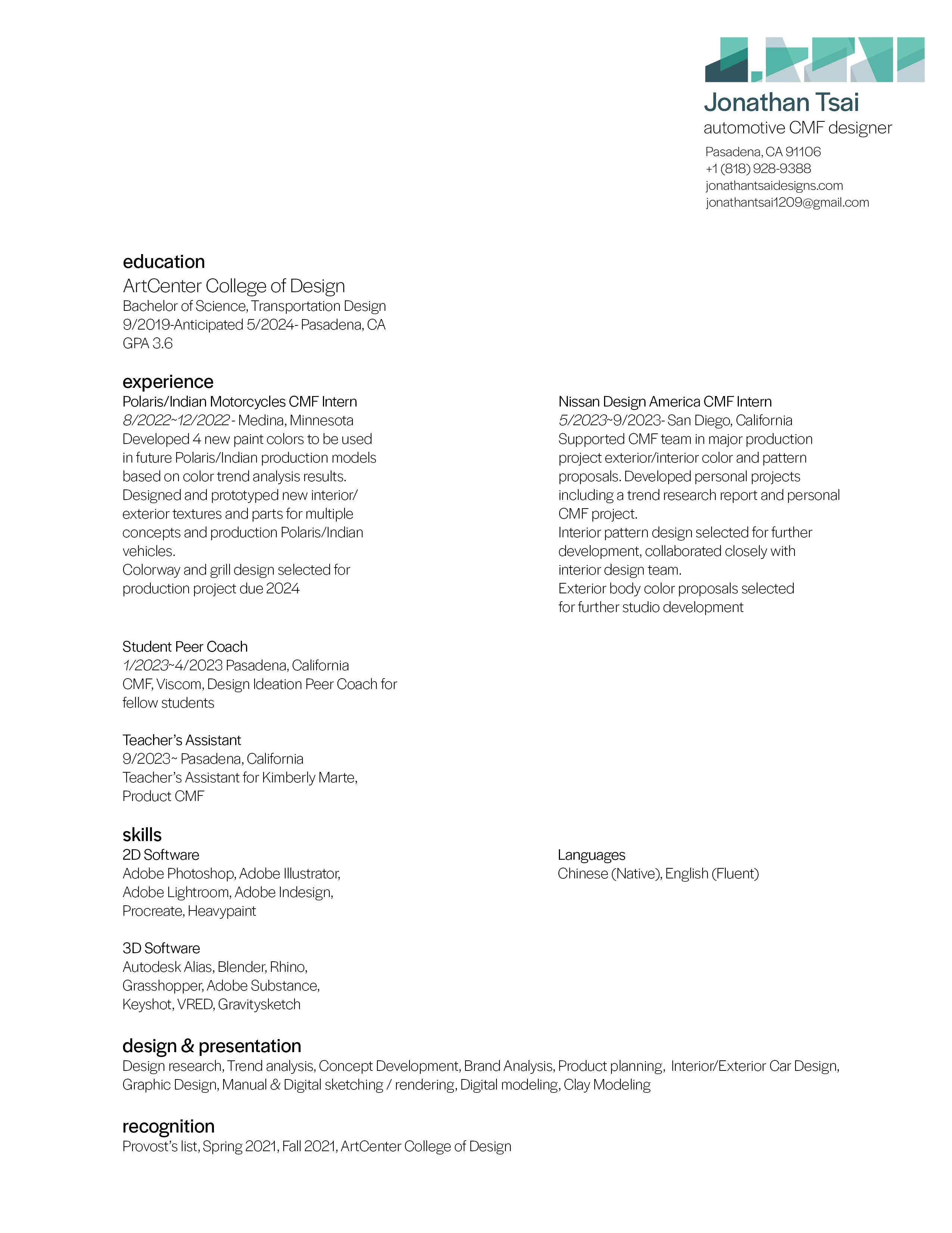 My passion and understanding for the way cars are designed and manufactured continues to influence my designs as I explore and dedicate myself in Automotive CMF Design. As a Taiwanese growing up in Shanghai and educated in an International environment, my multicultural background shapes my work and helps me view the world with a colorful, diverse, and unique perspective.