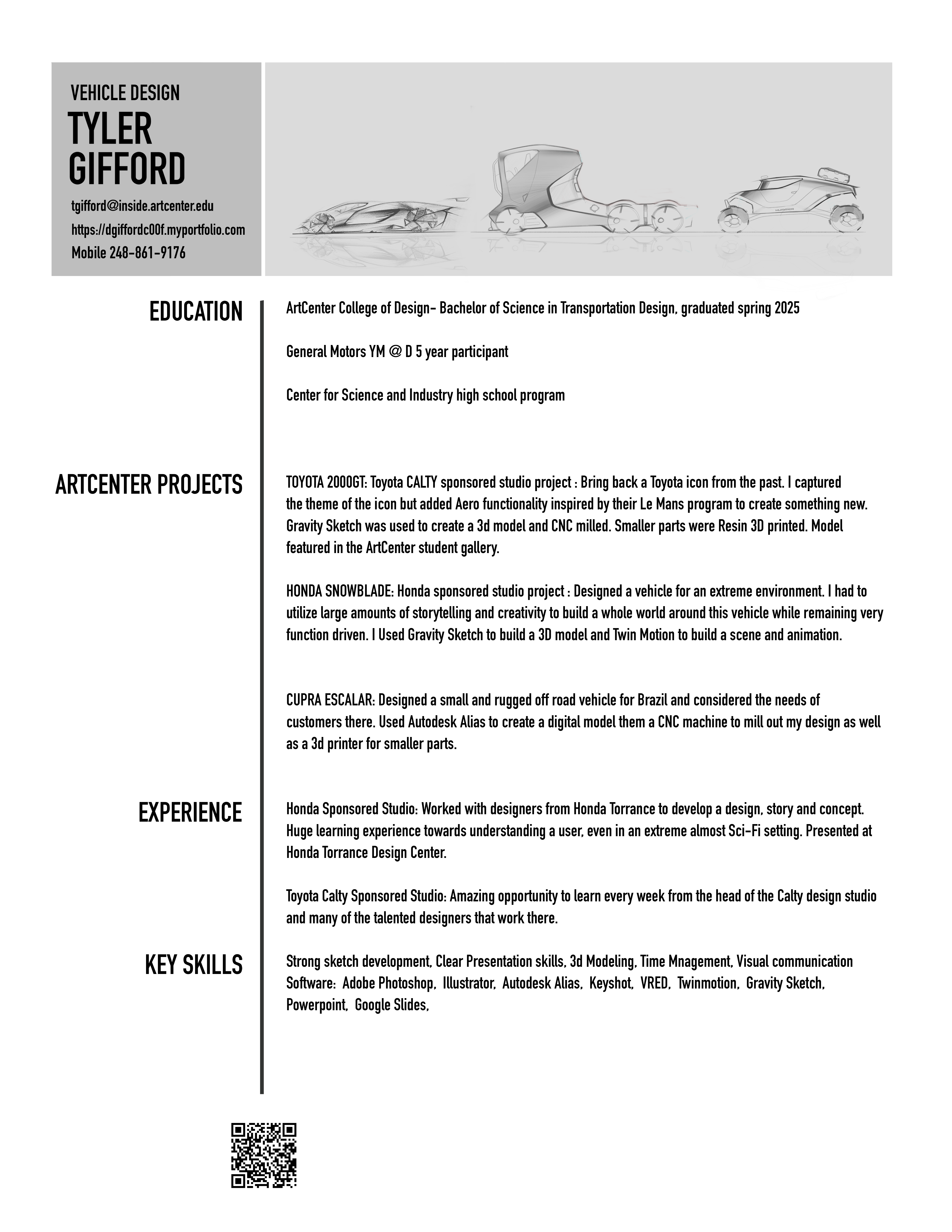 My name is Tyler Gifford. I am from Michigan and from a very young age, cars have been my primary passion in life. As I have grown older, Vehicles and design in general continues to captivate me, especially the old school sketching phase. I know that design will always be a major part of my life!