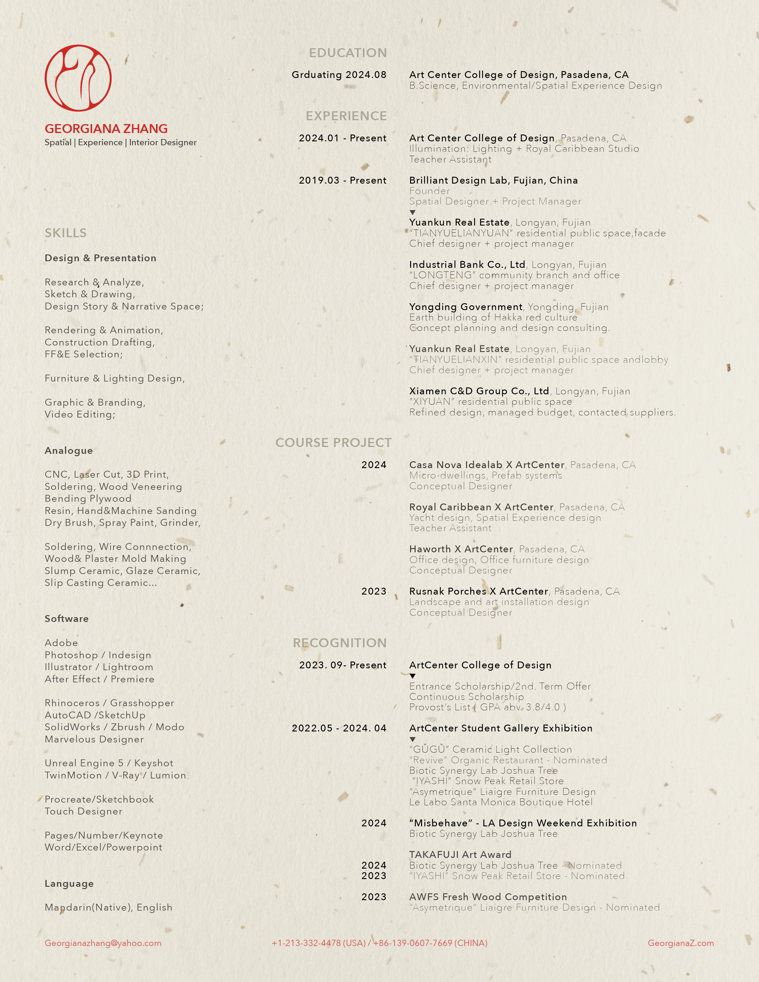 A spatial experience/interior designer influenced by traditional Chinese culture. She pursues an aesthetic philosophy of spirituality and elegance.