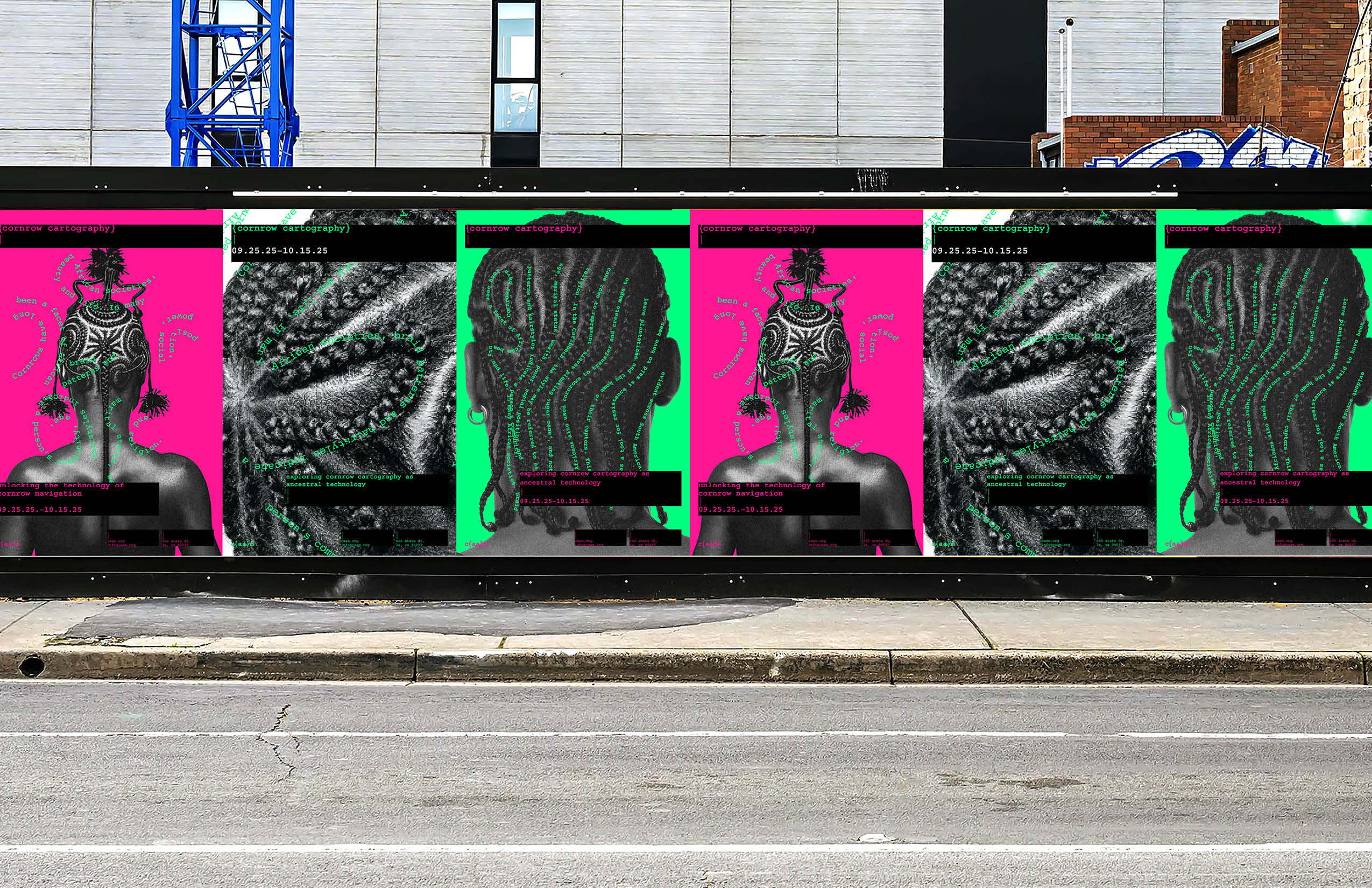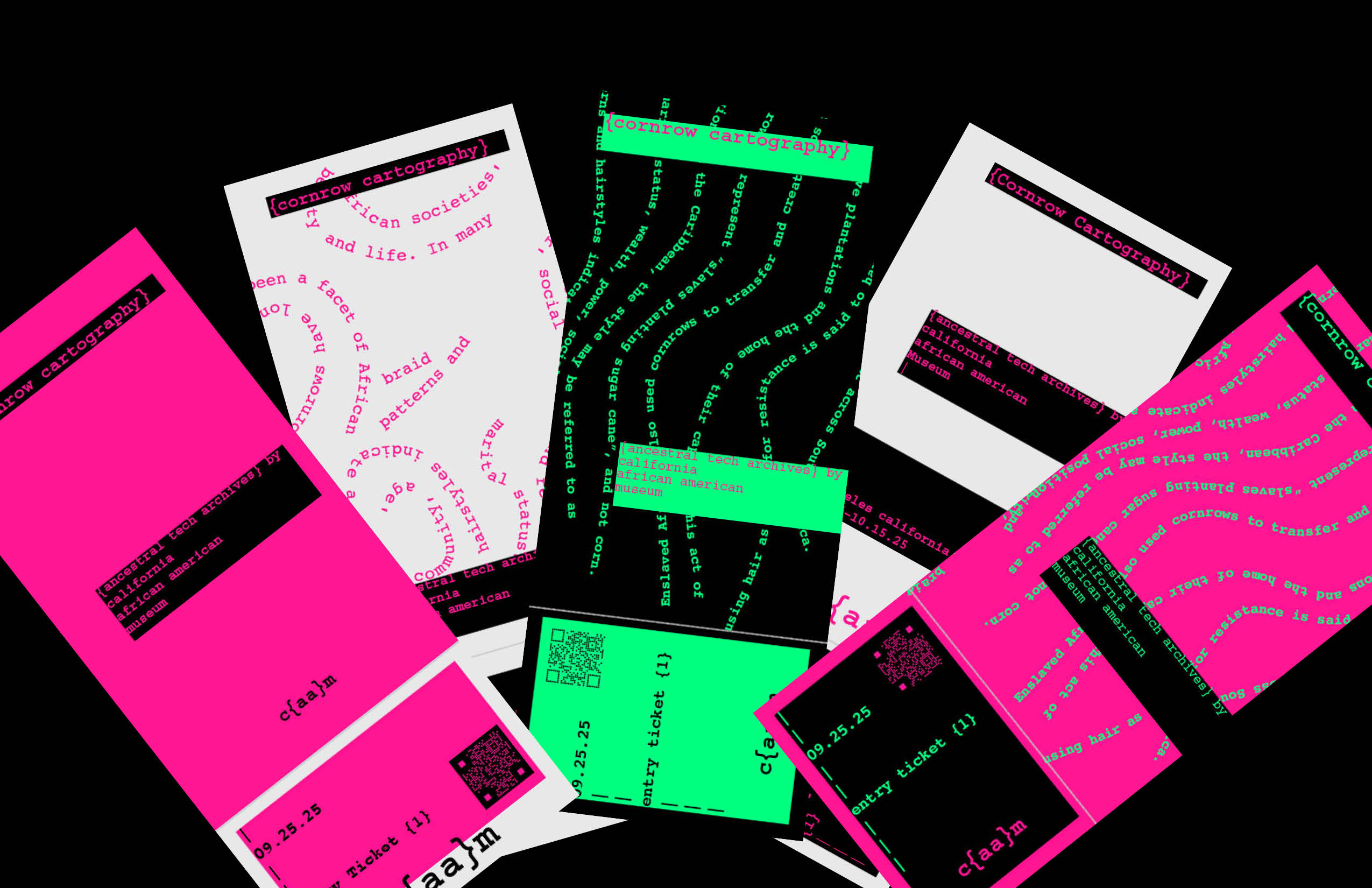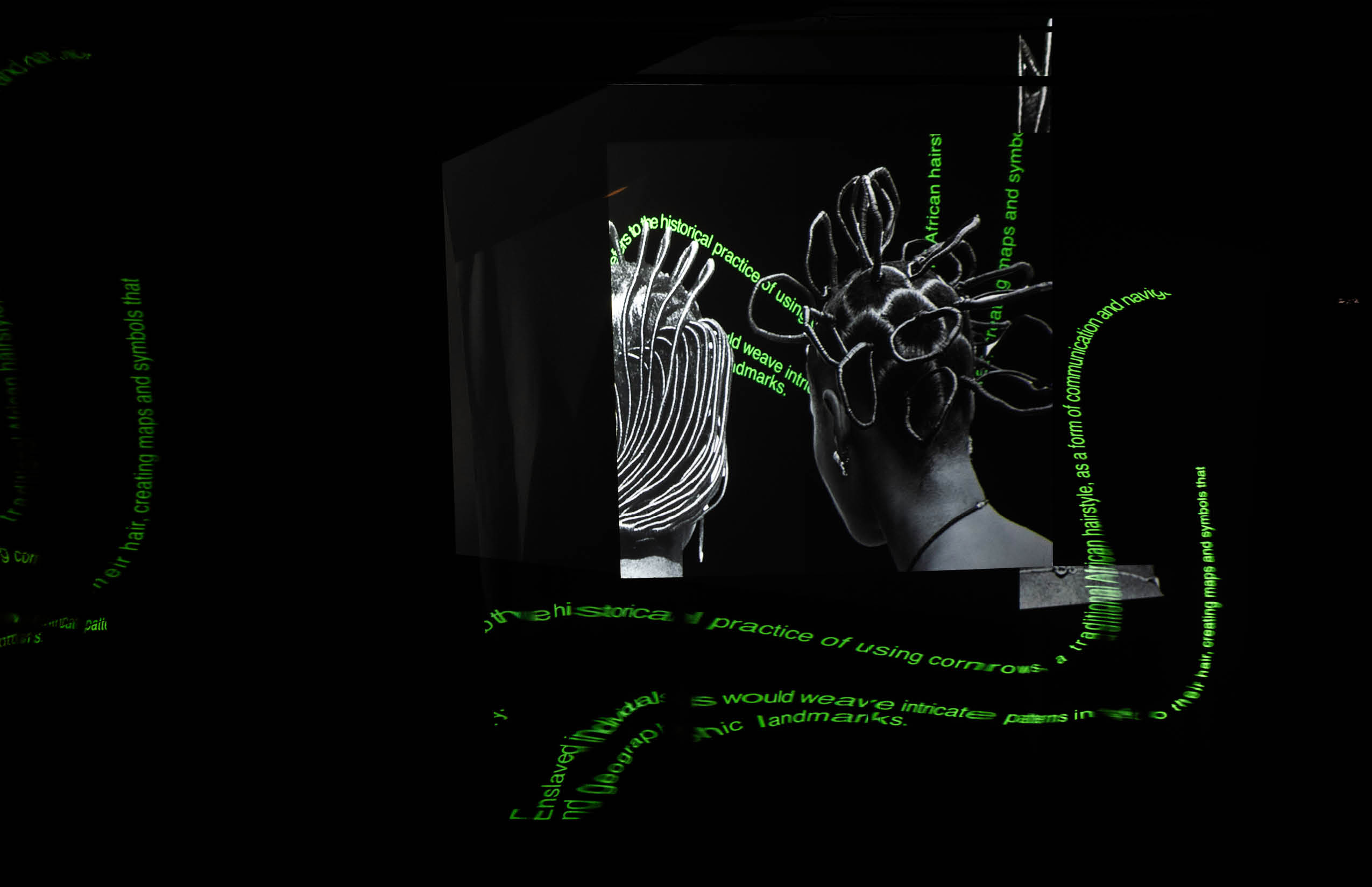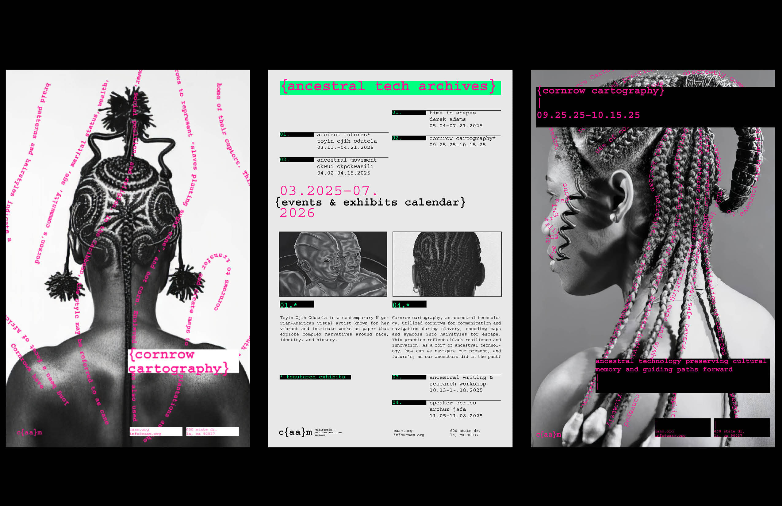 Cornrow Cartography is a featured exhibition at the California African American Museum, part of the Ancestral Tech Archive. In this exhibition, I conceptualize cornrows as a form of navigation. It invites the audience to engage with a familiar cultural tradition—braiding cornrows—and explores the knowledge embedded within them.