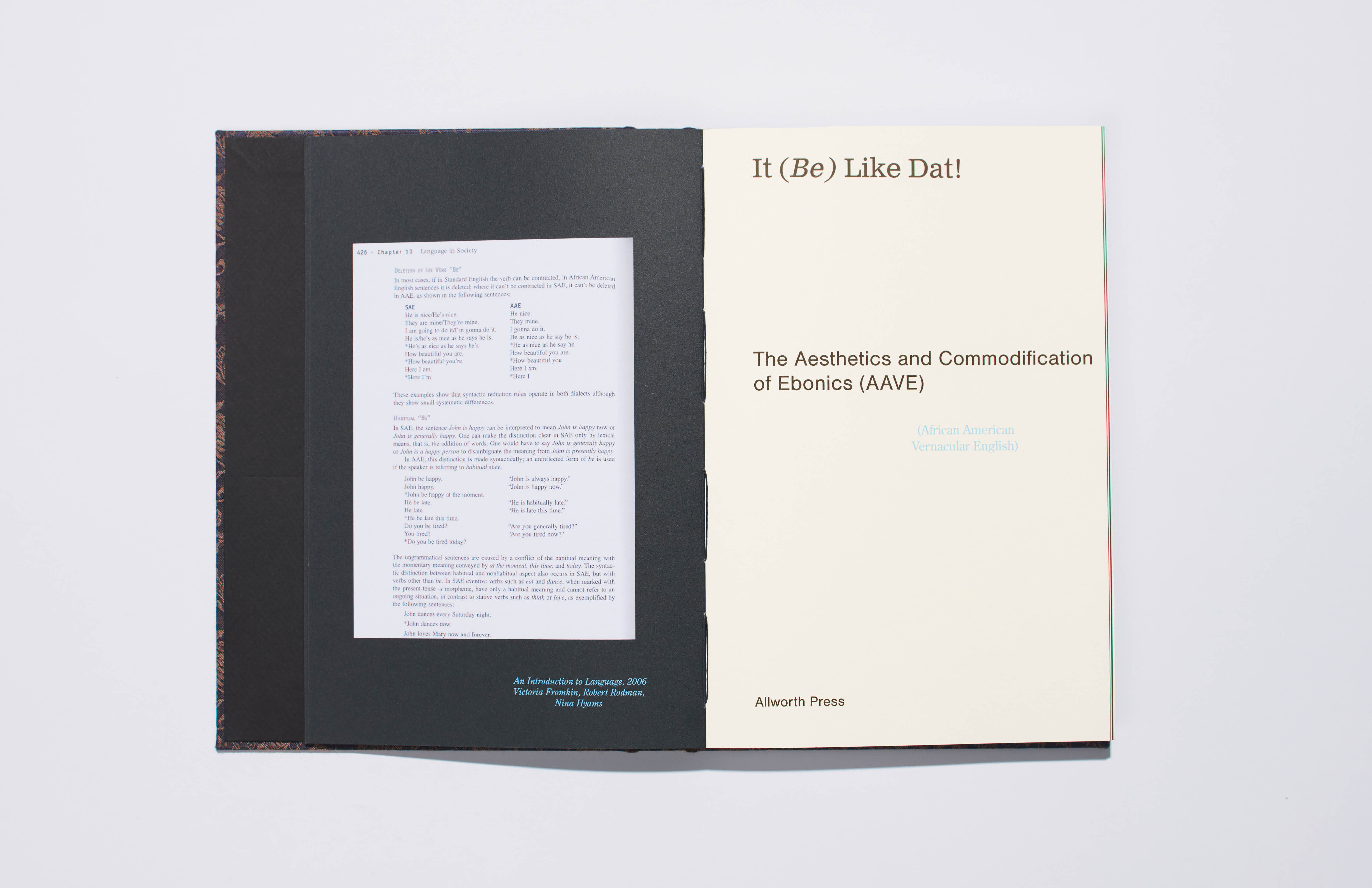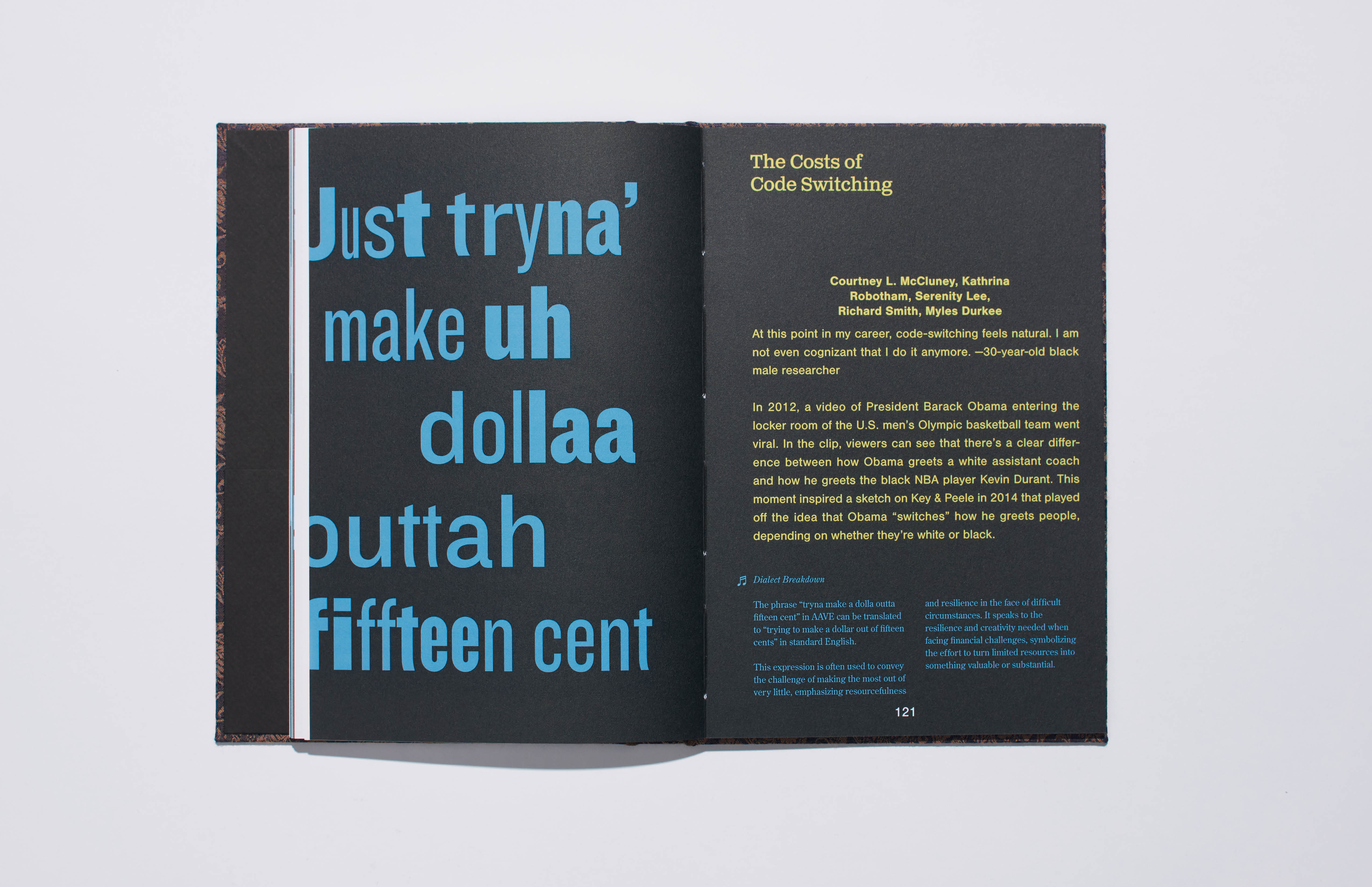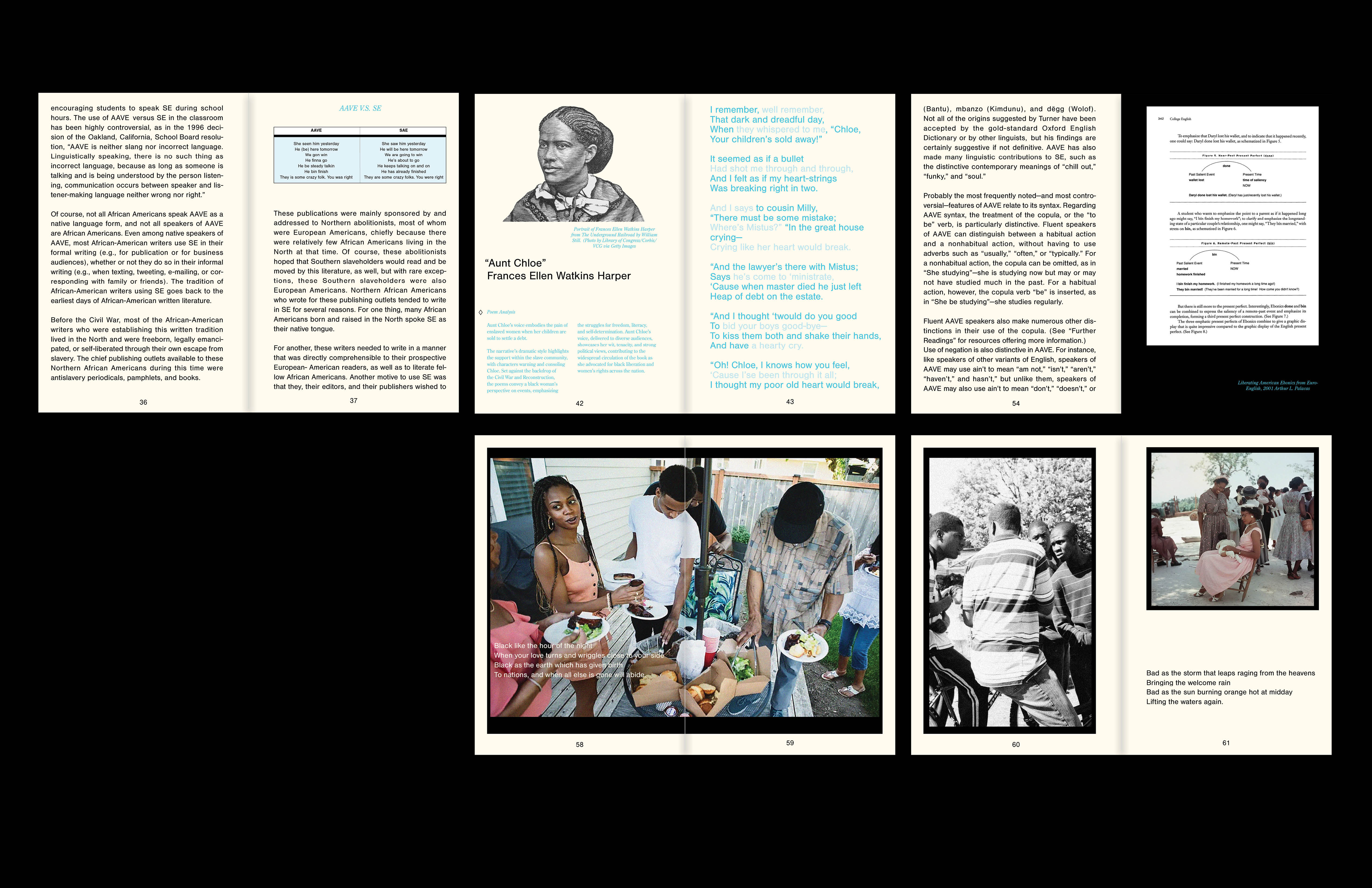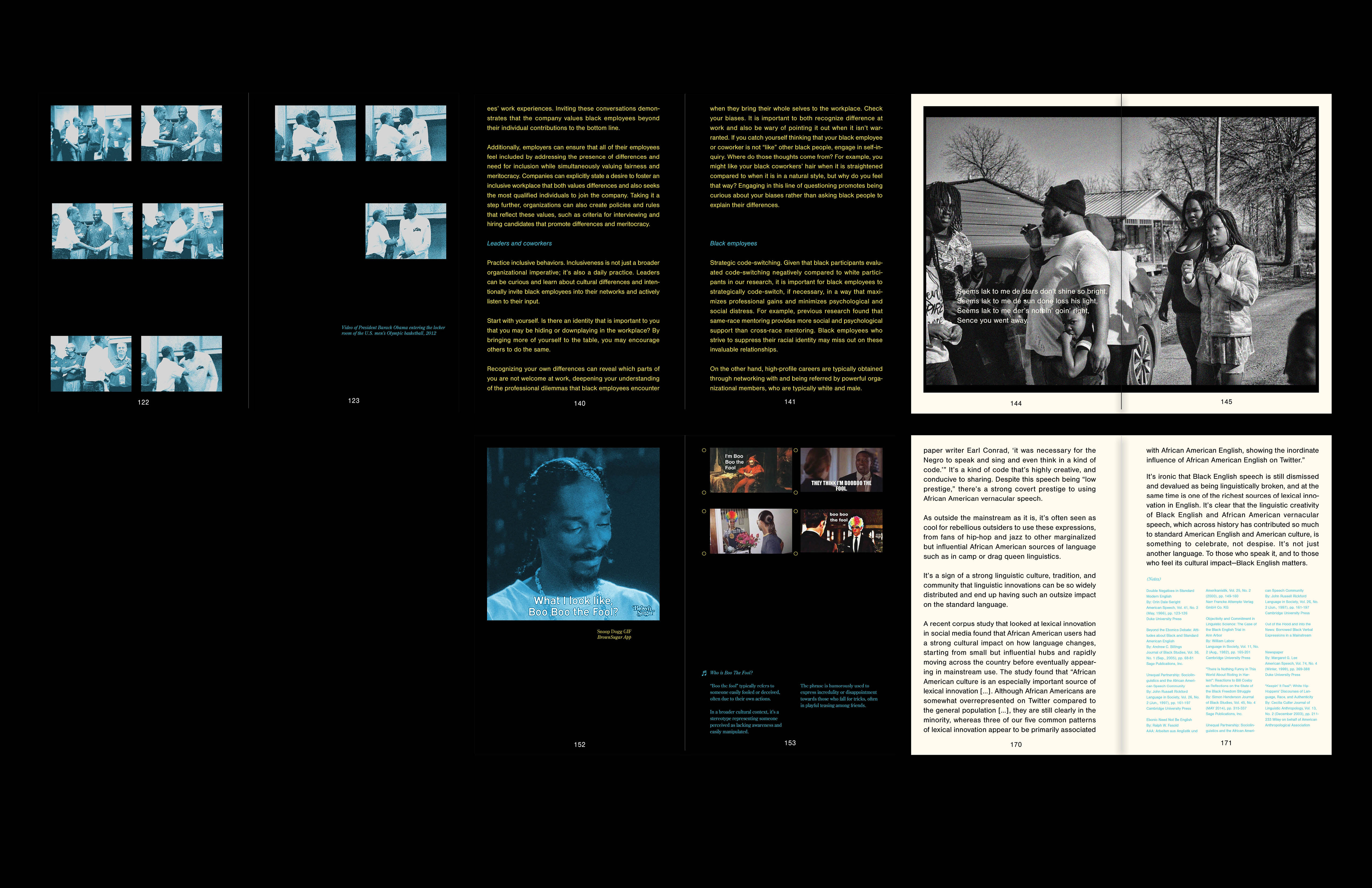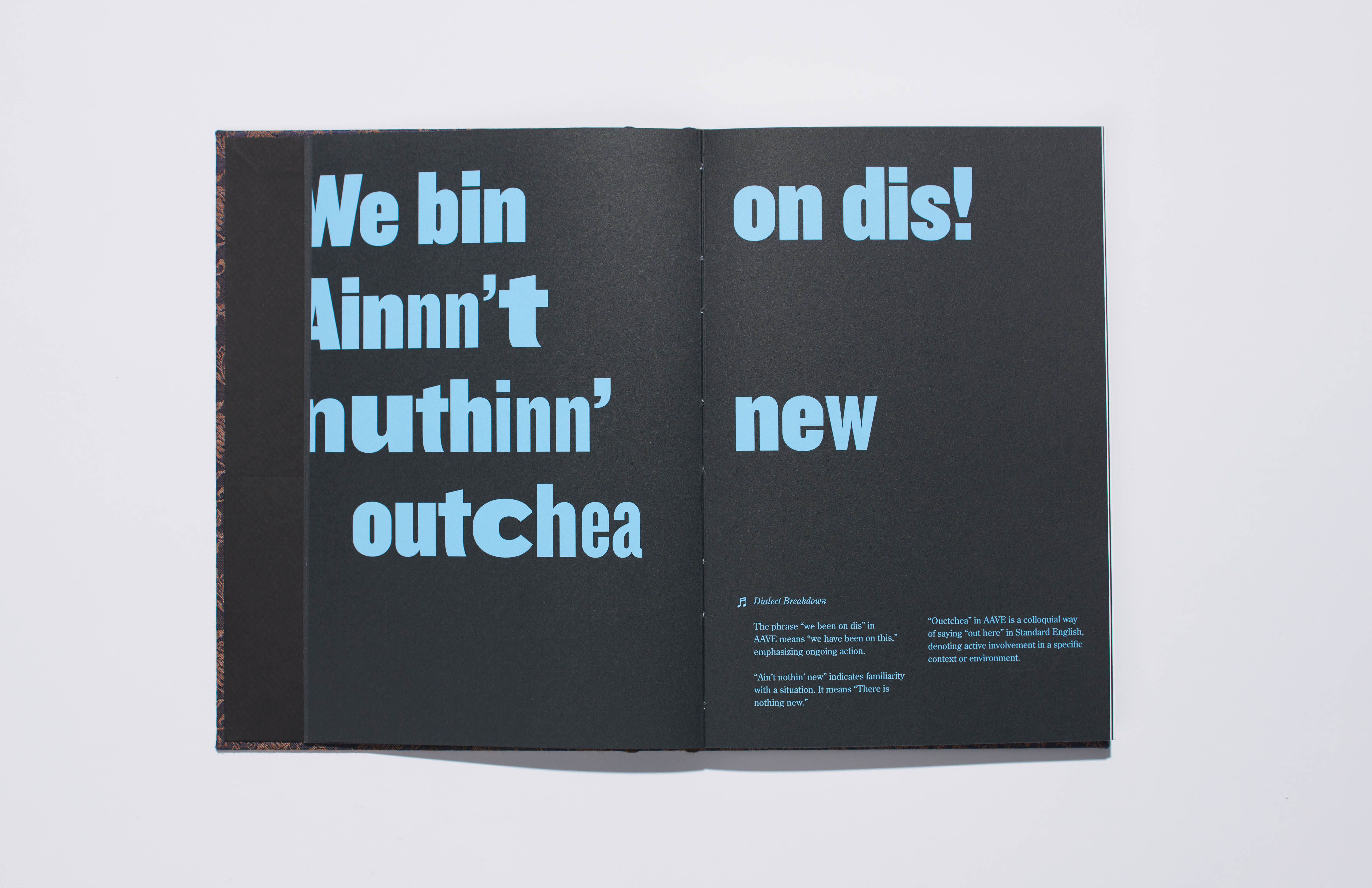It Be Like Dat! The Aesthetics and Commodification of Ebonics is my publication design that seeks to drive social discussion. Through meticulous research, I explore social, political, and cultural issues, and visually communicate the challenges encountered. This book acts as a narrative and a tribute to Ebonics, delving deep into its history, culture, and community artistry. By utilizing typography and archival imagery, I was passionate about honoring and preserving the essence of Ebonics.