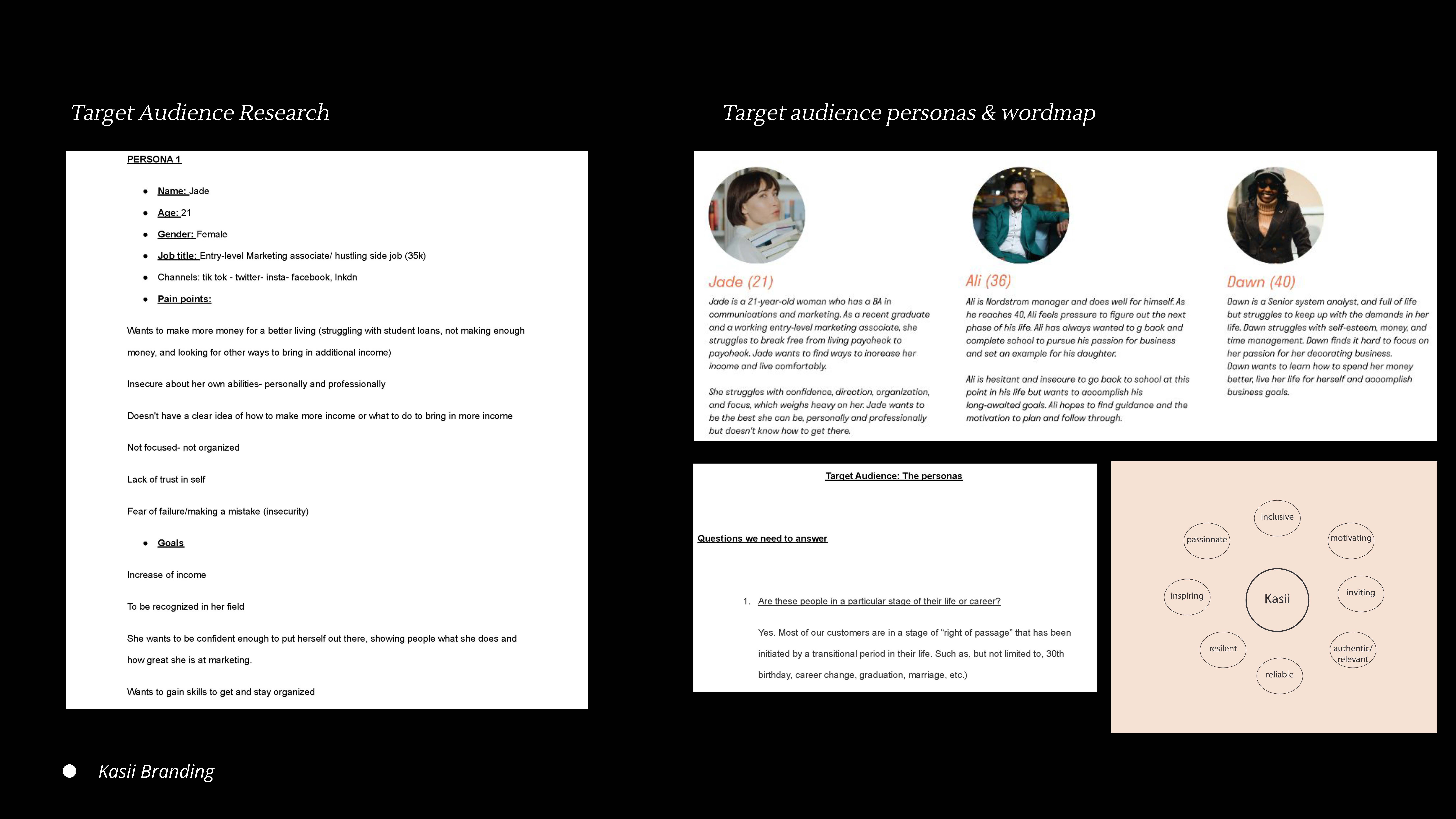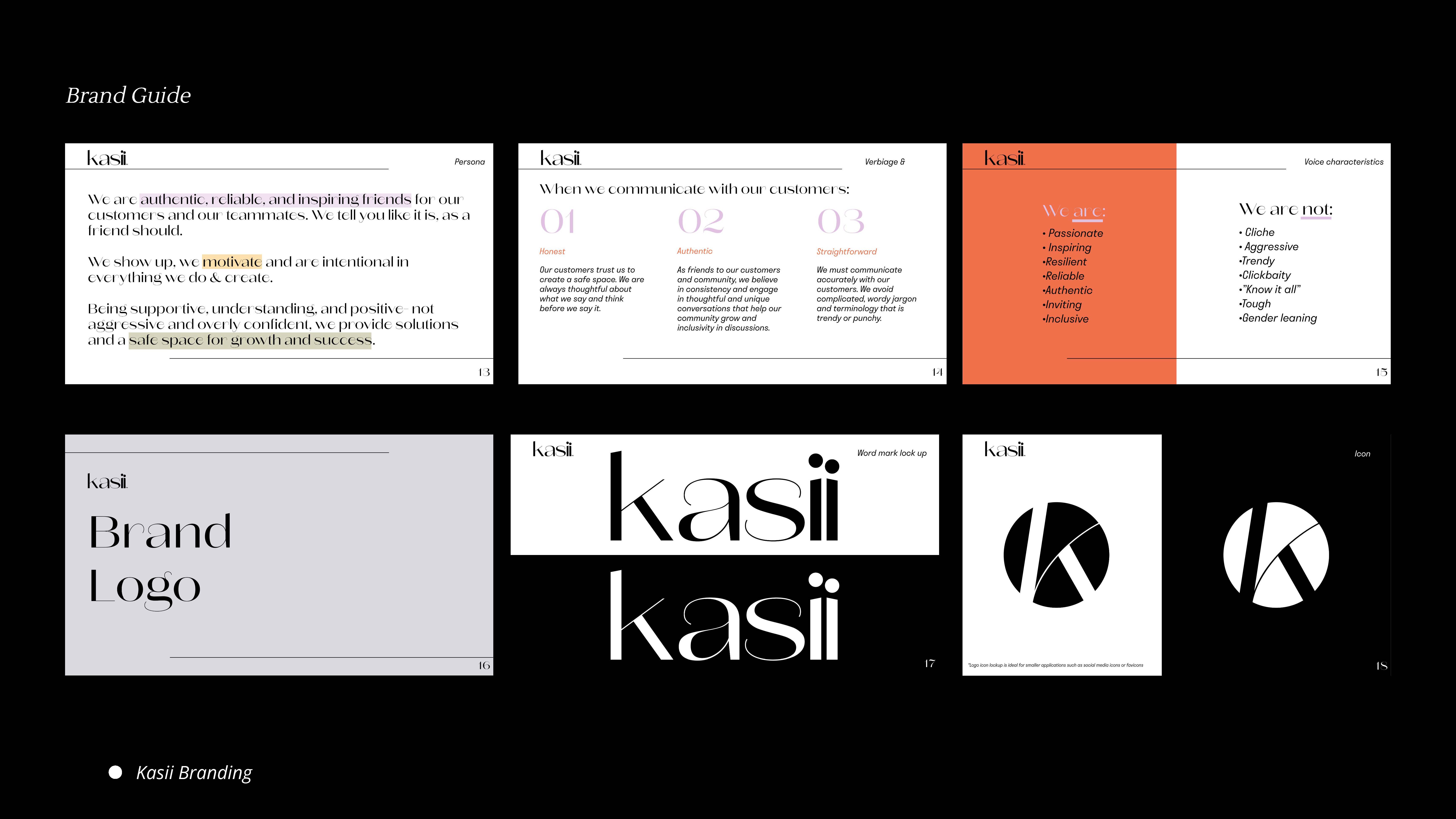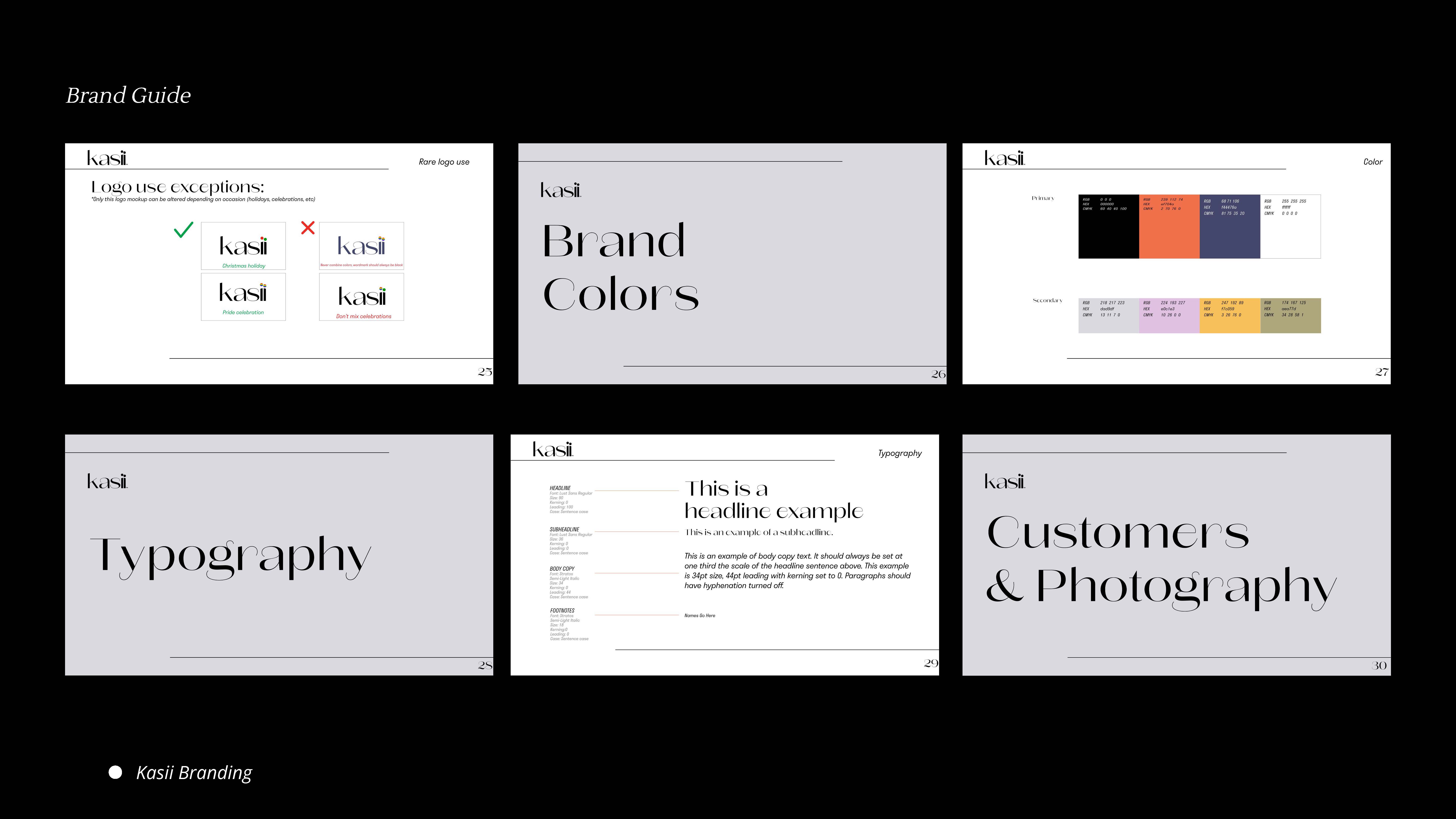 It was a learning experience not only to be the graphic designer but also the creative director and strategist to bring Kasii to life for the client. I learned project management, how to make important documents like contracts, and how to research markets and audiences I understood the importance of knowing how to explain and validate my design decisions that were understandable to my client. Branding design requires in-depth research and a unique perspective to differentiate from other brands.