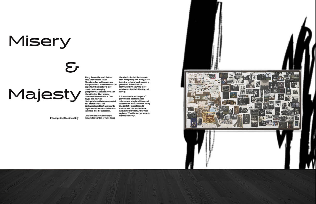 In exploring 'blackness,' I honed my skills to shape ideas into tangible expressions. Curating "Misery & Majesty" nurtured significant growth across diverse art aspects—discovery, narrative, art direction, and more. This immersive process fused conceptual thinking, storytelling, and visual design to prompt profound contemplation on the complexities within the black experience.