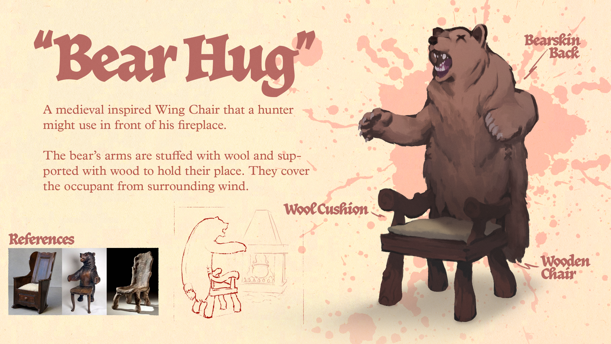 Furniture design illustration based on the prompt to create a Wing Chair. Wing Chairs are designed with the "wings" in mind to block the sitter from wind hitting the sides as well as creating a sense of privacy. My design was inspired by cabin style furniture, taxidermy and the idea of a teddy bear to create a cozy and eccentric wing chair.