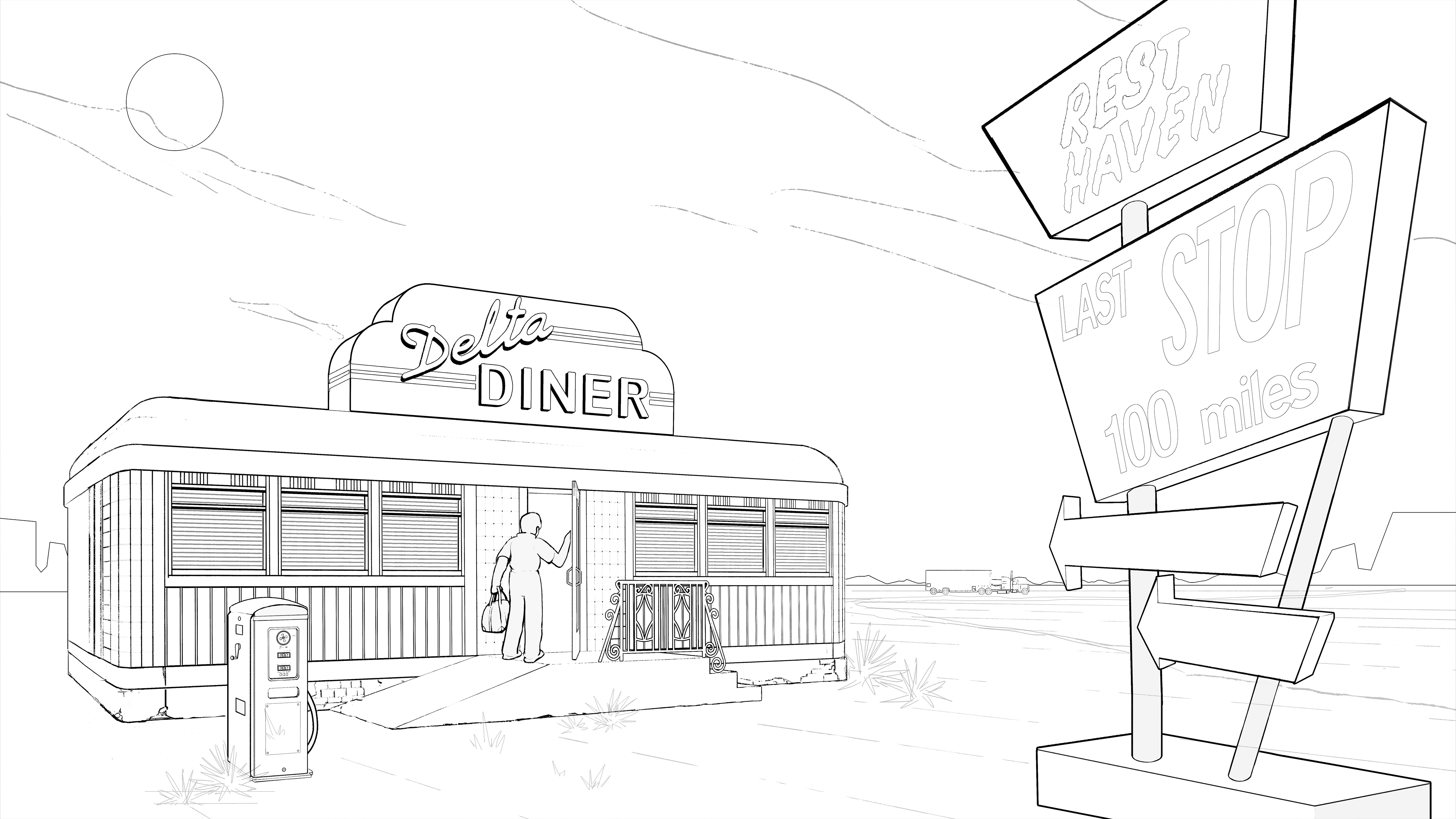 Background painting of a 1960s haunted diner inspired by the song Phantom 309 by Red Sovine. A hitchhiker approaches the diner in the middle of the desert, after being dropped off by the truck Phantom 309, not knowing that the driver was said to have passed away a long time ago.