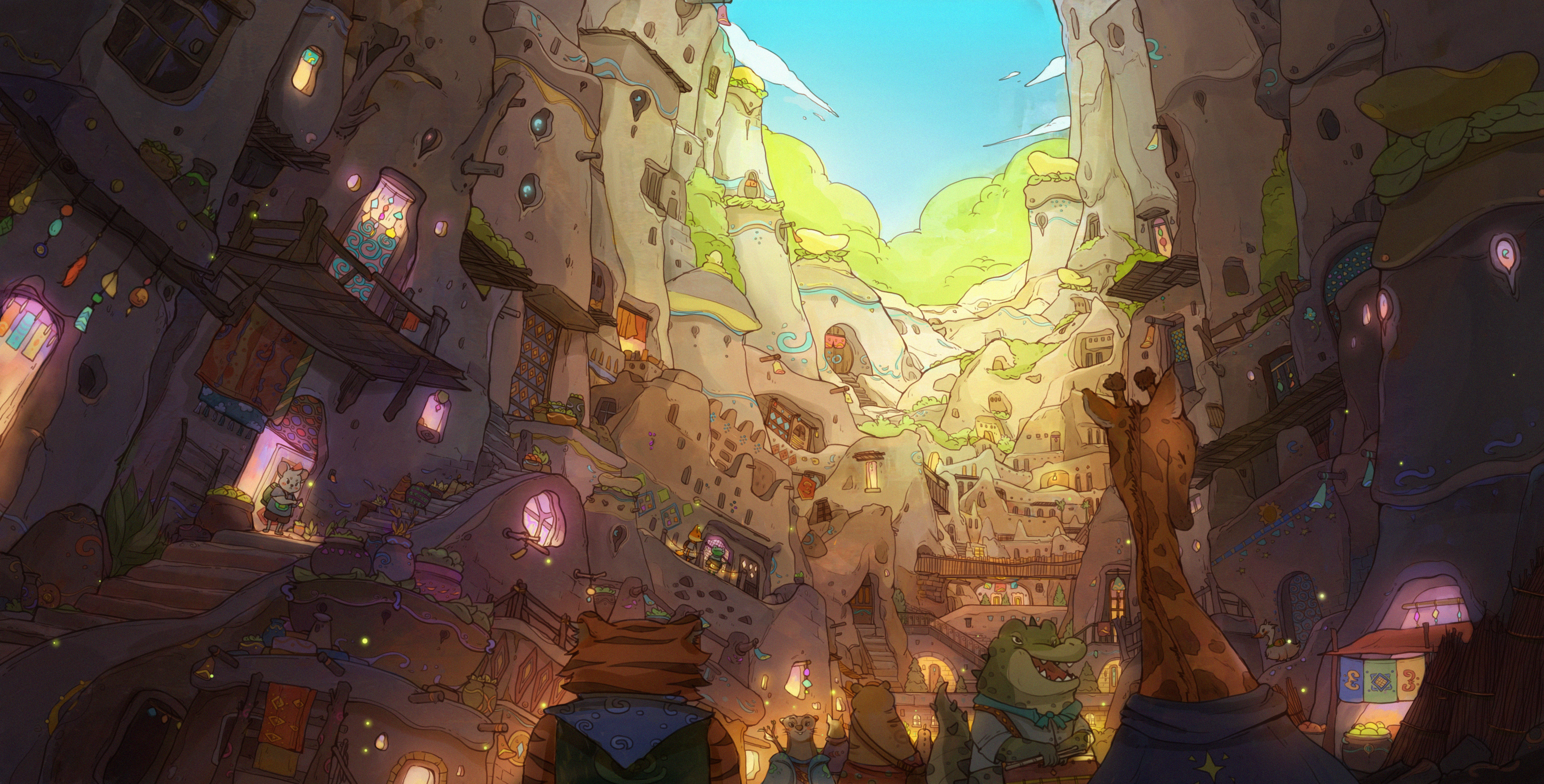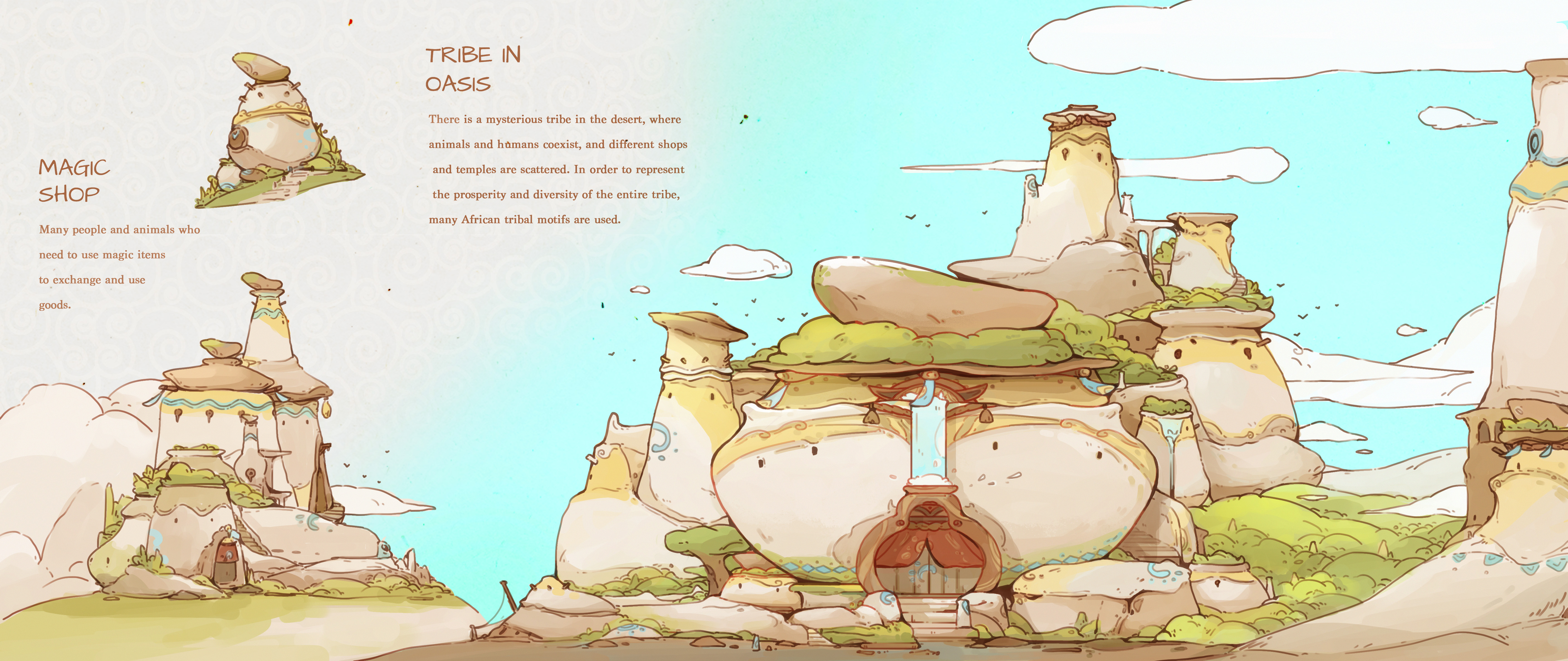 Deep in the endless desert lies a miraculous oasis. This oasis is a utopia where humans and animals live together. The architecture in the oasis is based on a unique stone shape and built against the mountain, inspired by traditional african architectural styles.