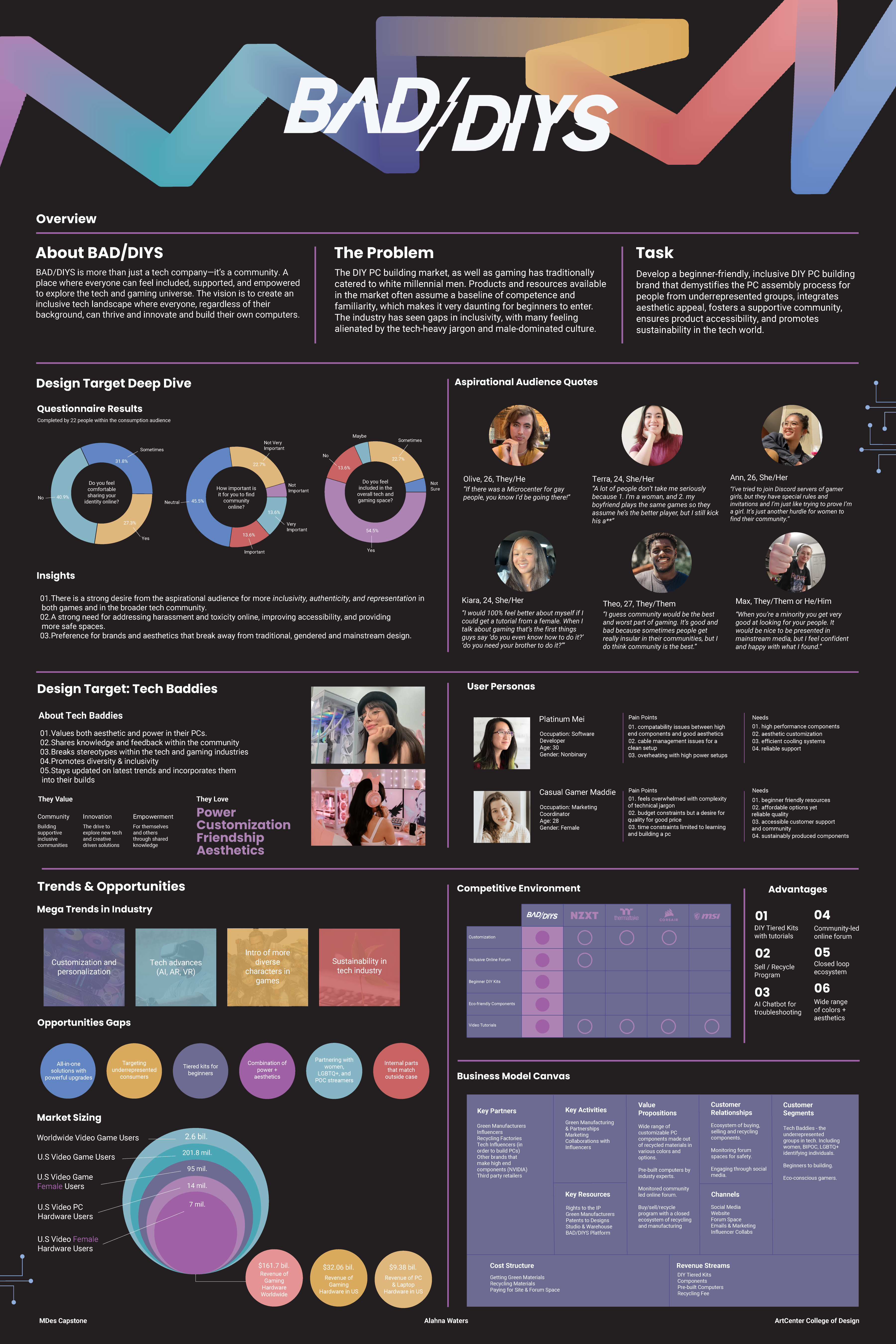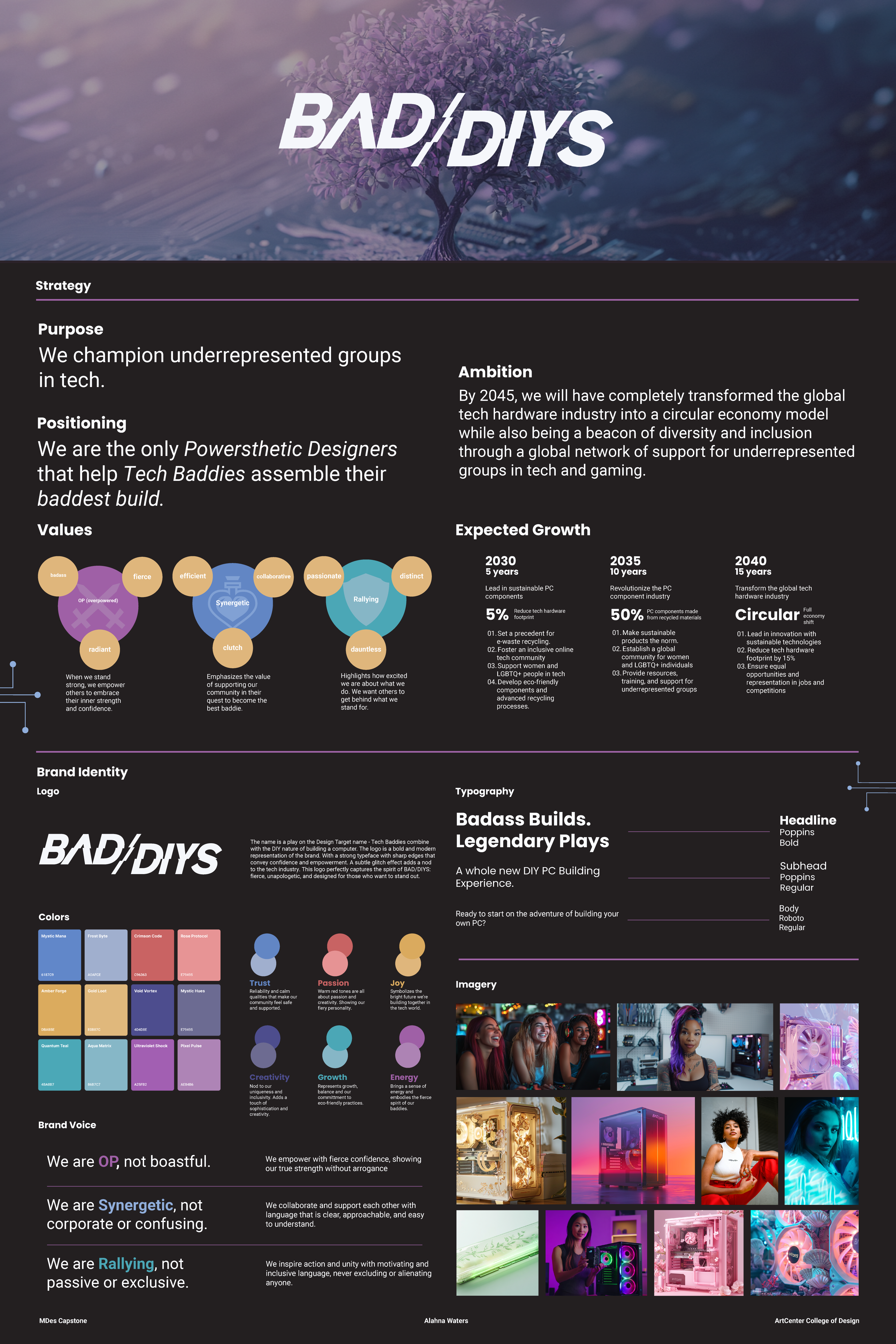 BAD/DIYS is project that explores and builds a brand centered around a very inspirational design target 'Tech Baddies.' This design target comprises of individuals not often represented in the tech industry, particularly in gaming. This would include, women, LGBTQ+ individuals and people of color. I developed a new and innovative brand that aligns with their values, and what things these groups would want to see in a tech brand that focuses on being inclusive to everyone.