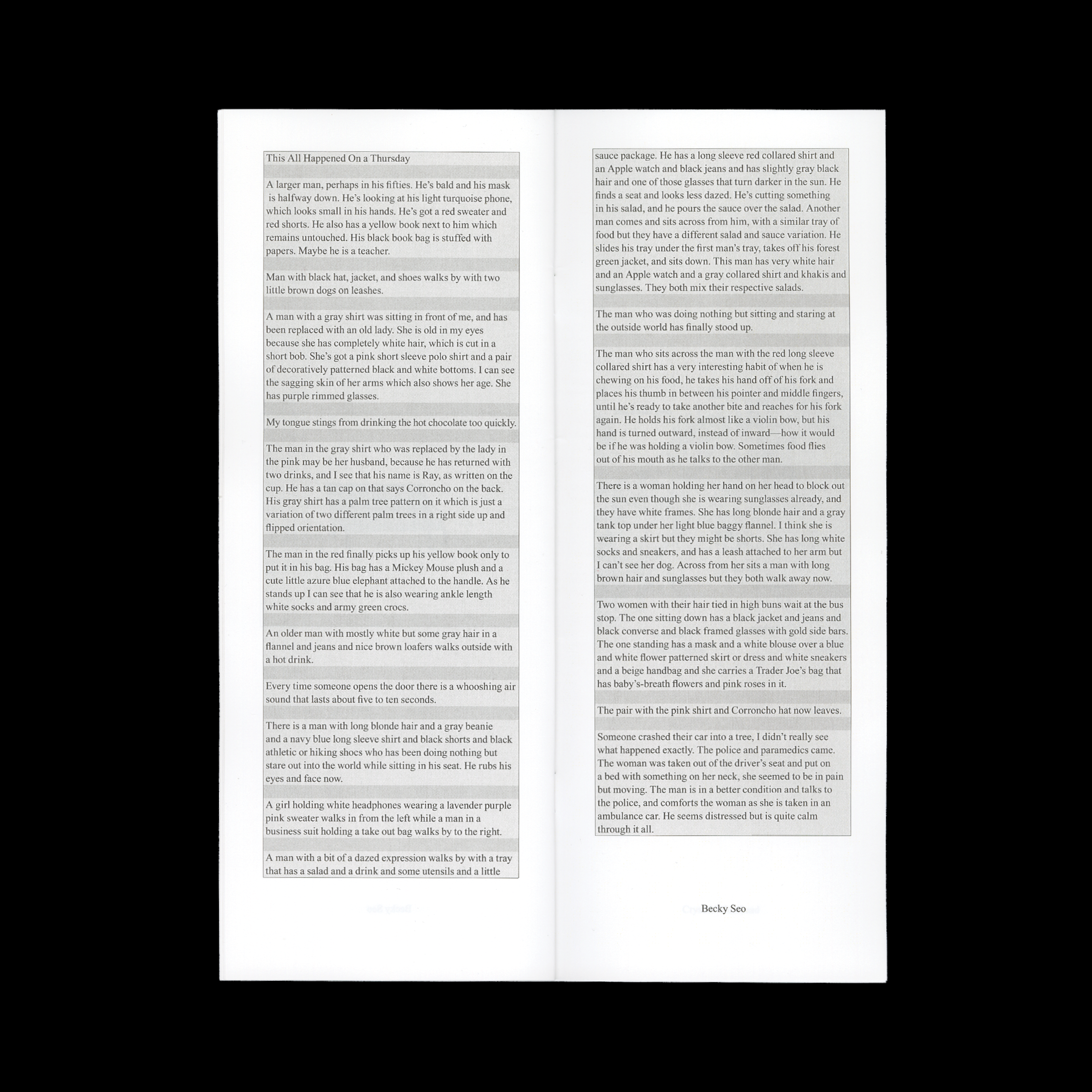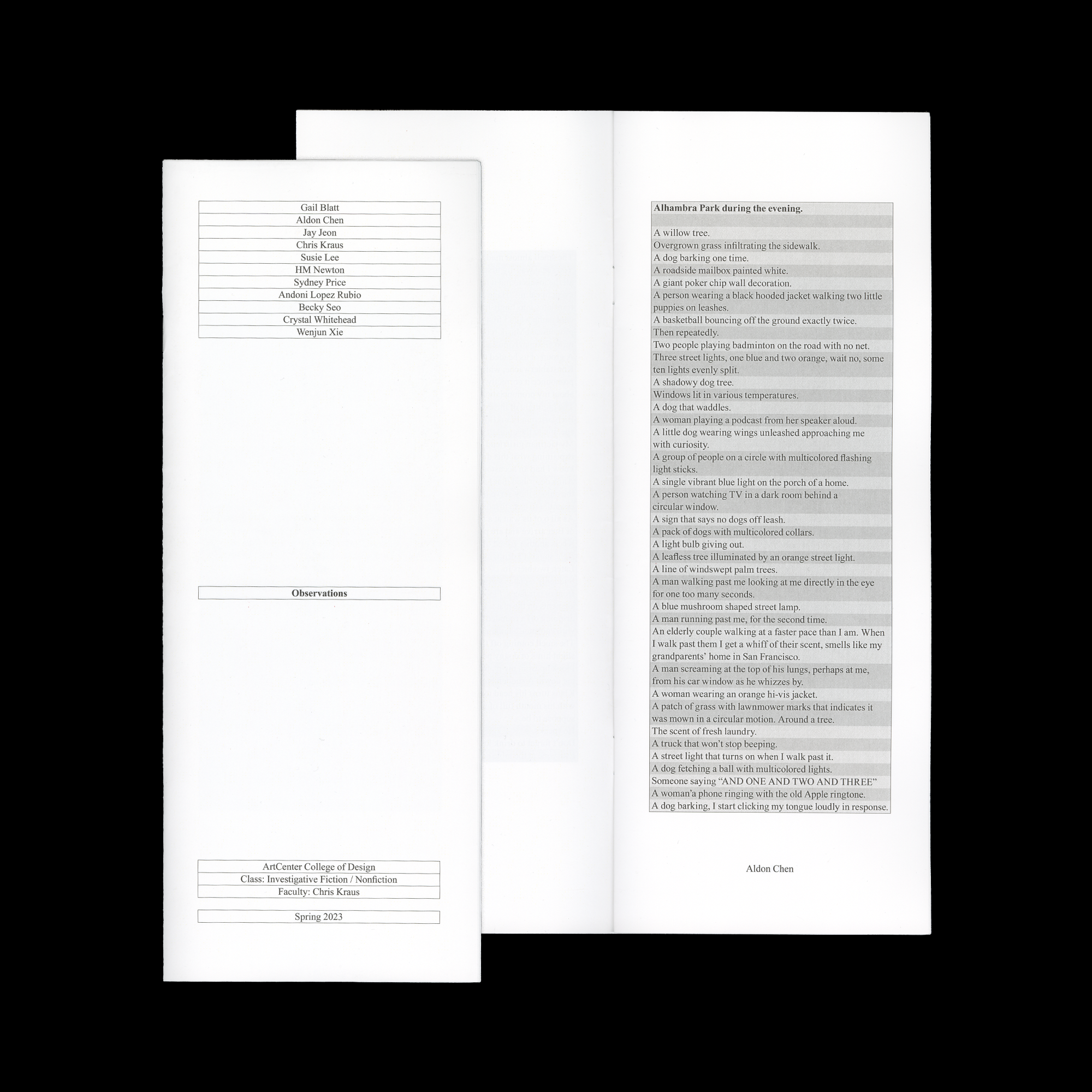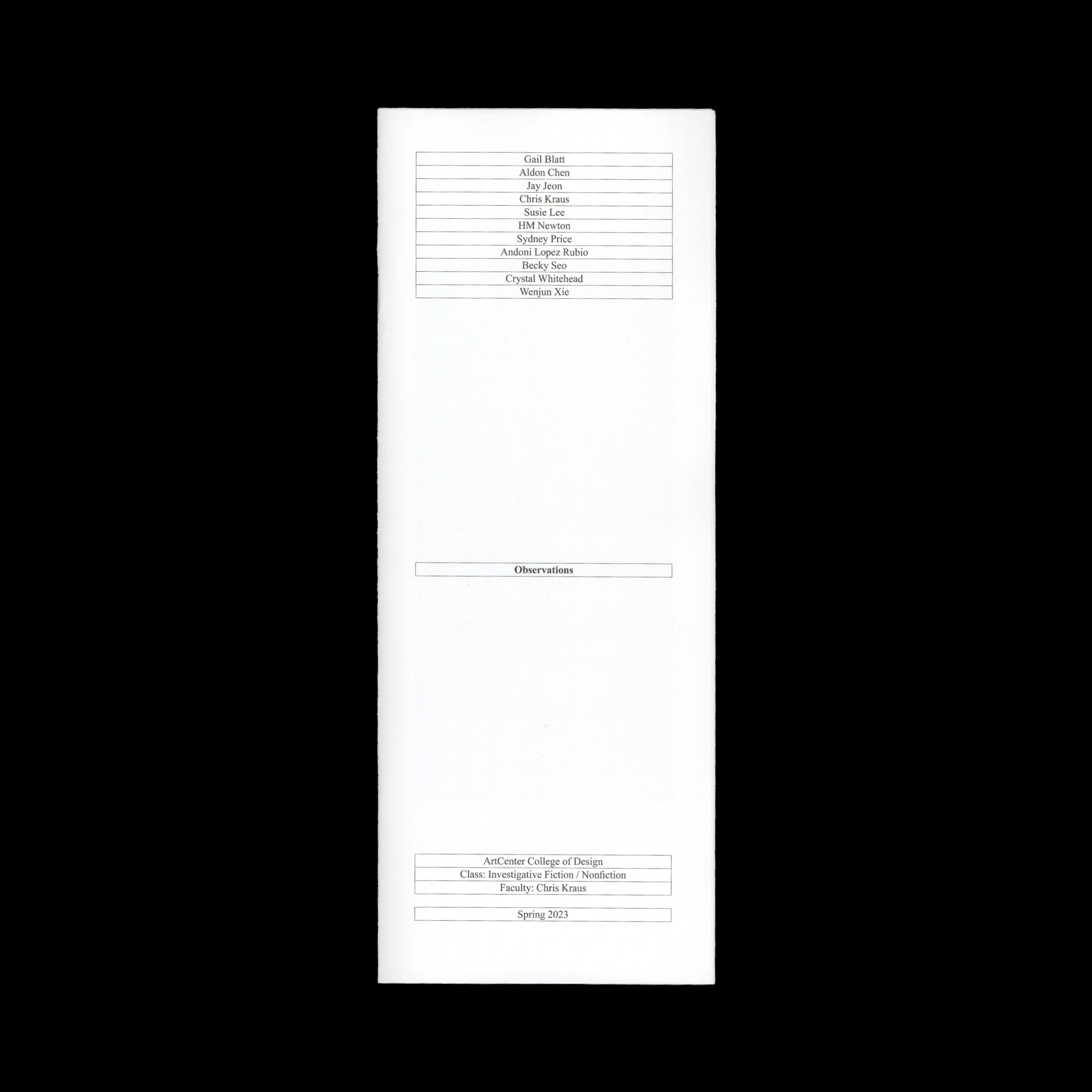 I designed a zine featuring writing done by the students in Chris Kraus' HNAR-324-01: Investigative Fiction/Nonfiction class. Intentionally dry, default, and static. Inspired by the sobering clarity achieved through the simple act of recording observations and which was the goal for many of the class assignments. "Seeing comes before words" - John Berger.