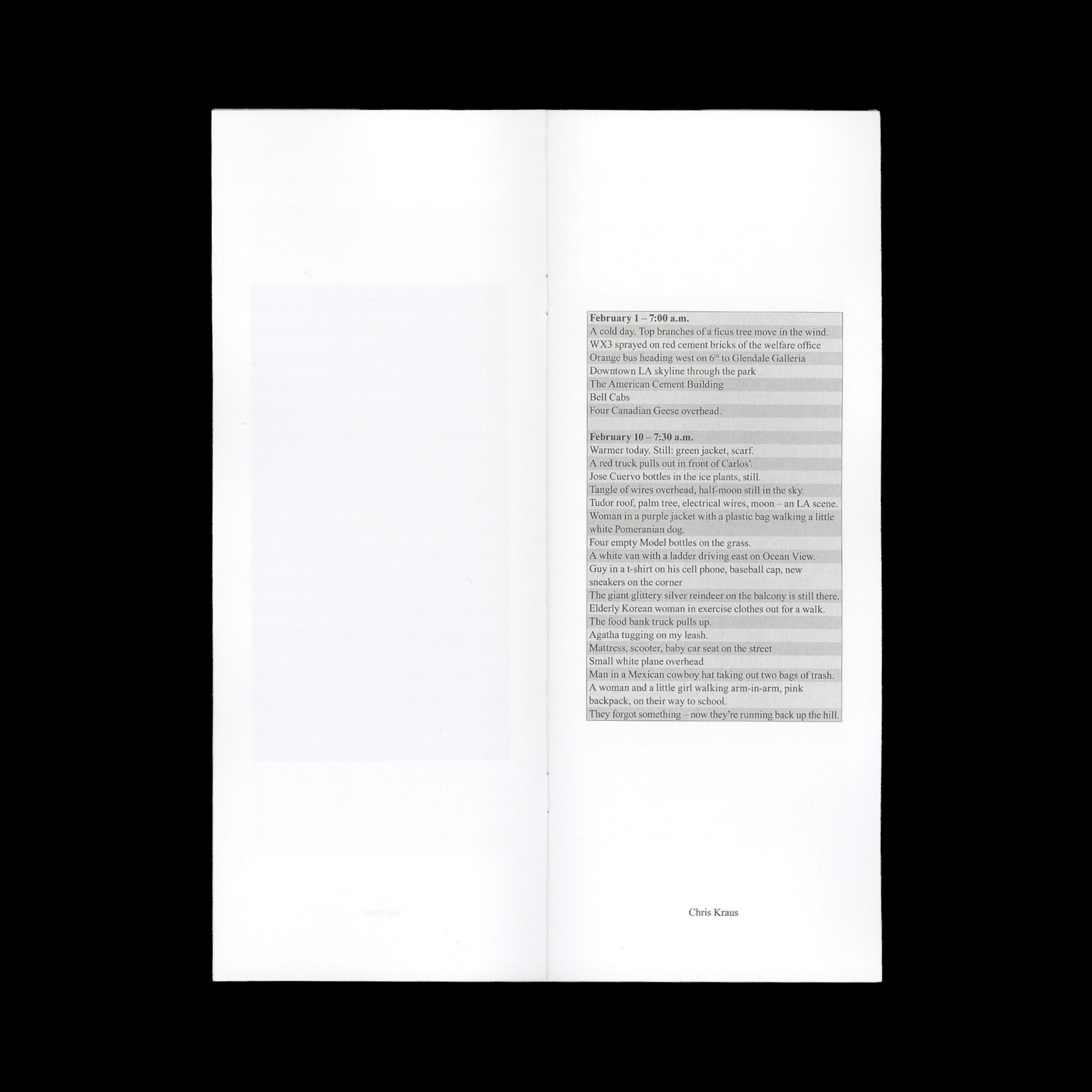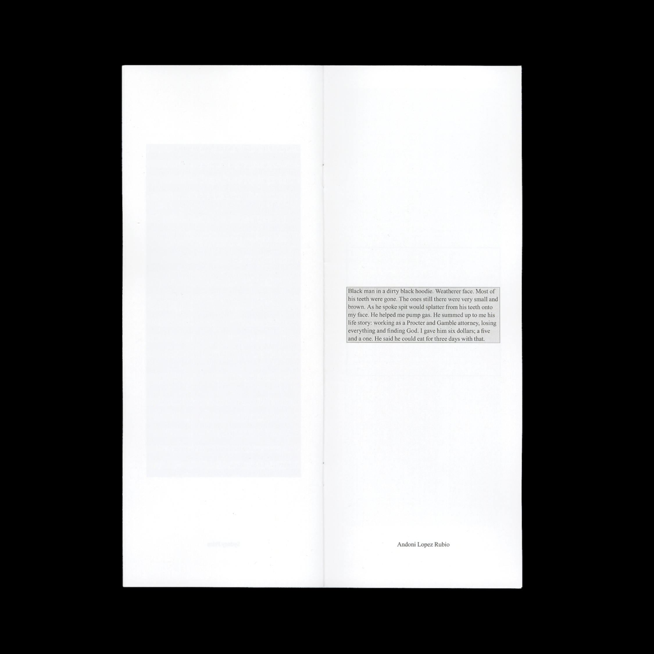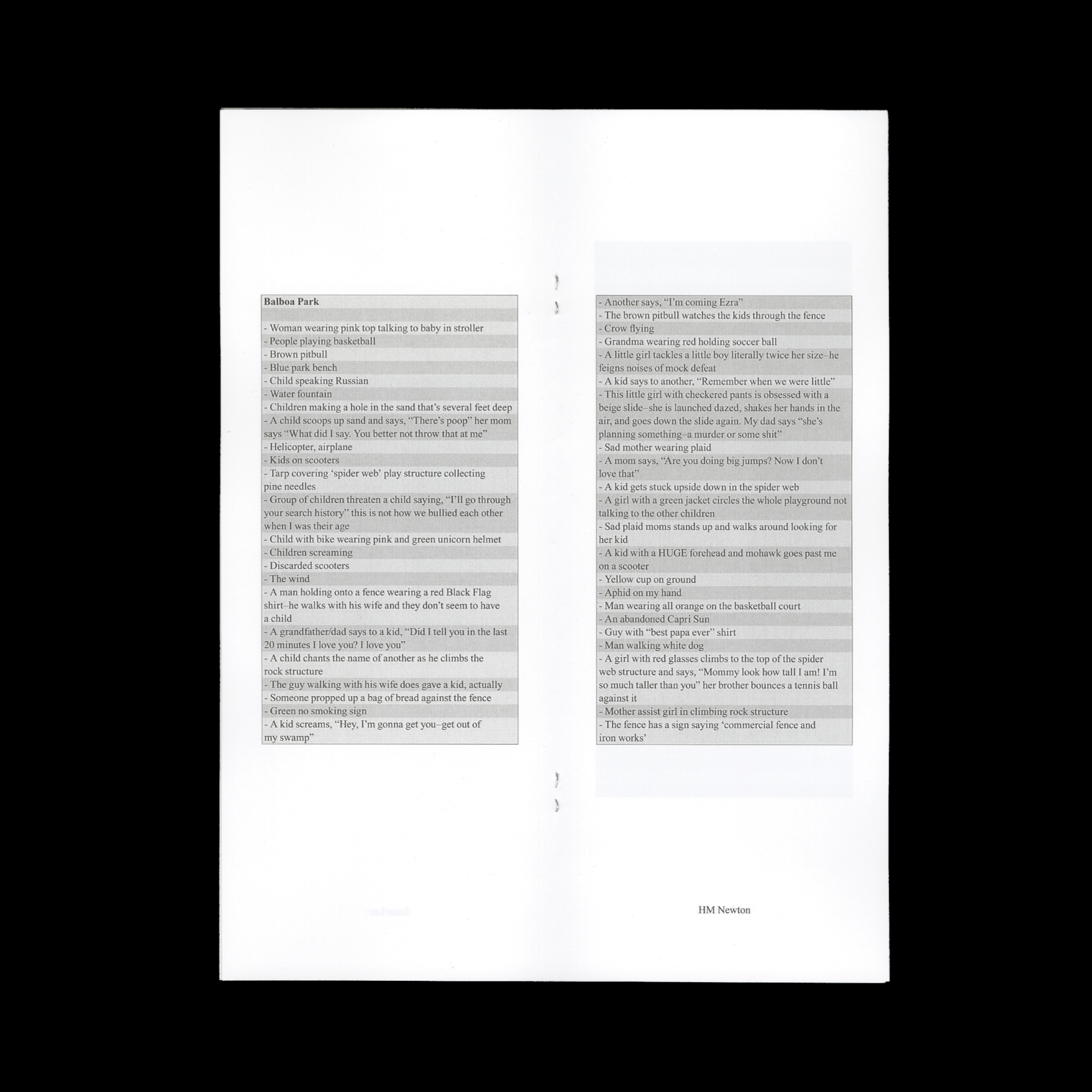 I designed a zine featuring writing done by the students in Chris Kraus' HNAR-324-01: Investigative Fiction/Nonfiction class. Intentionally dry, default, and static. Inspired by the sobering clarity achieved through the simple act of recording observations and which was the goal for many of the class assignments. "Seeing comes before words" - John Berger.