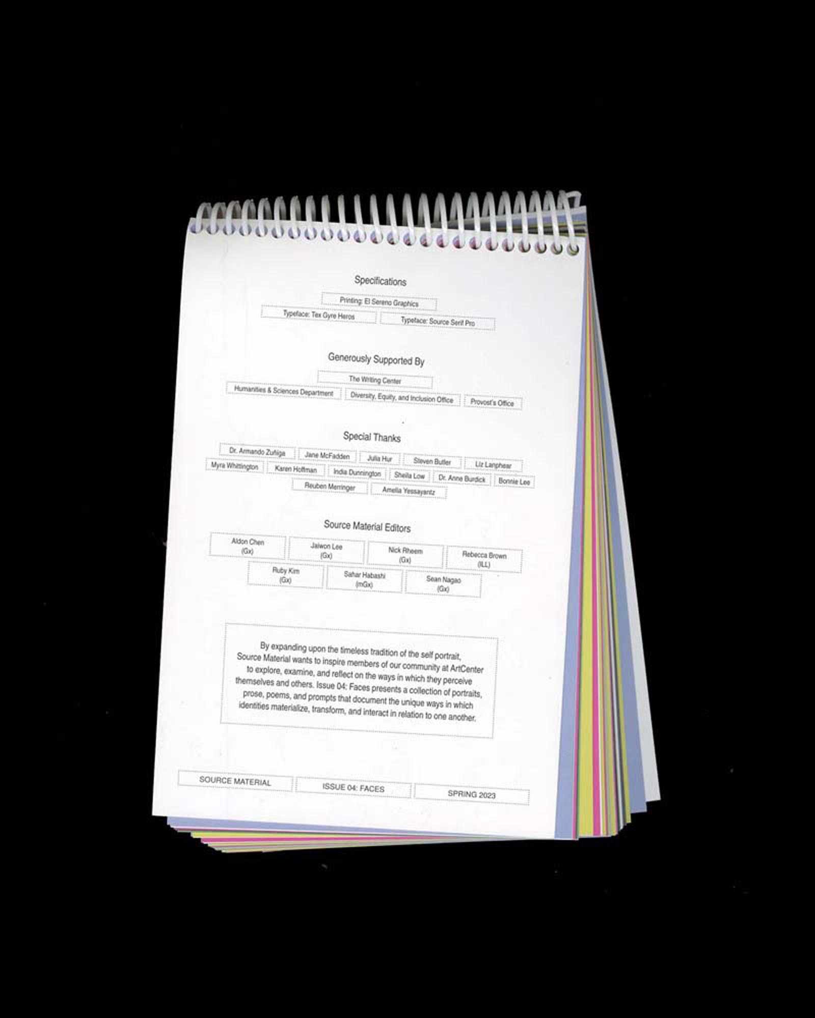 Source Material is a publication founded and led by students at ArtCenter College of Design. It celebrates interdisciplinary collaboration at the College through a community-based publication every semester, featuring submitted work by students and alumni according to a theme/topic chosen by the Source Material team. I primarily contributed to the publication as a coeditor and designer from Summer 2022 to Fall 2023.