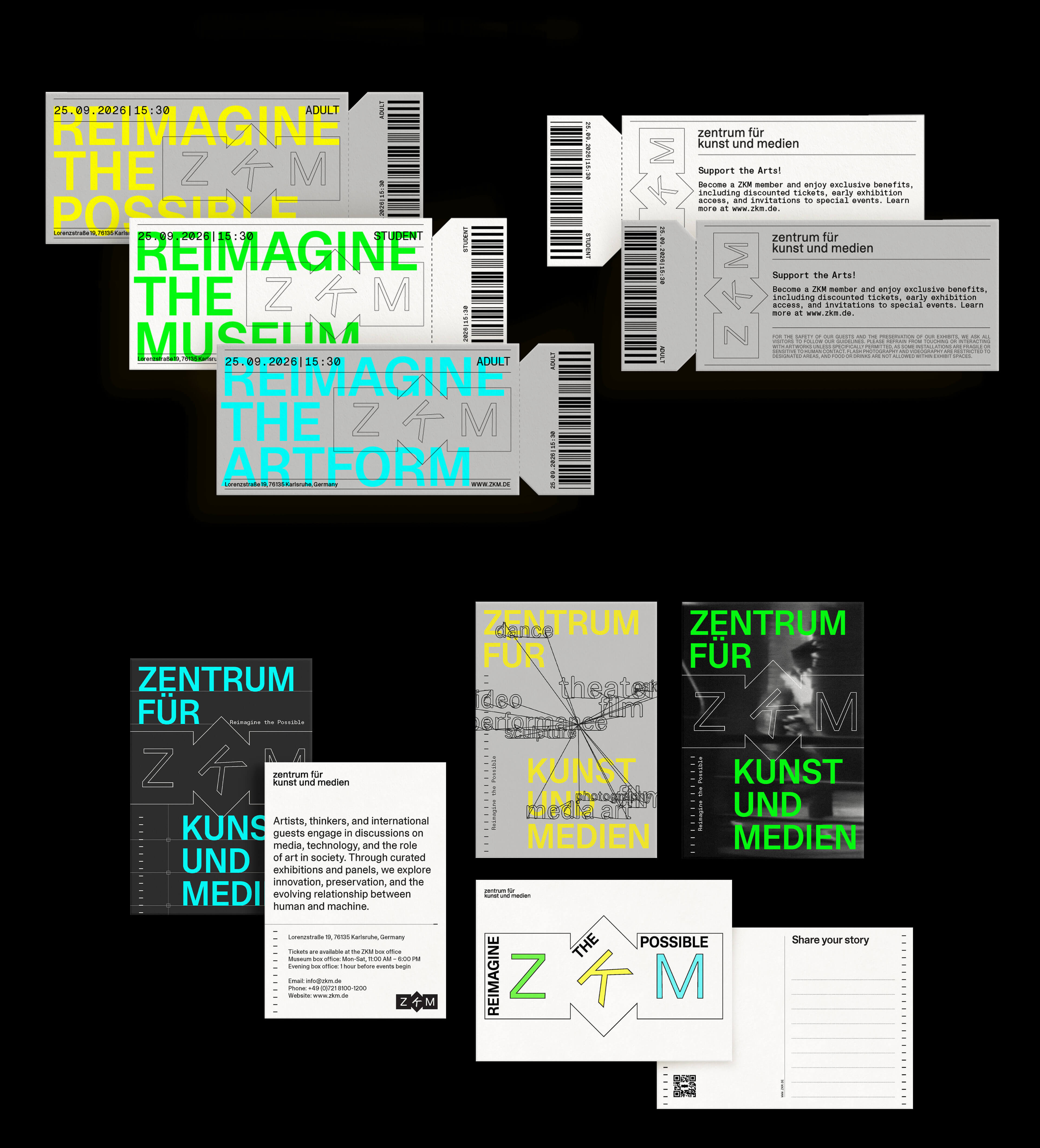 Each ticket becomes an invitation to reimagine ZKM. Modular type and layered folds turn an everyday object into part of the brand experience.