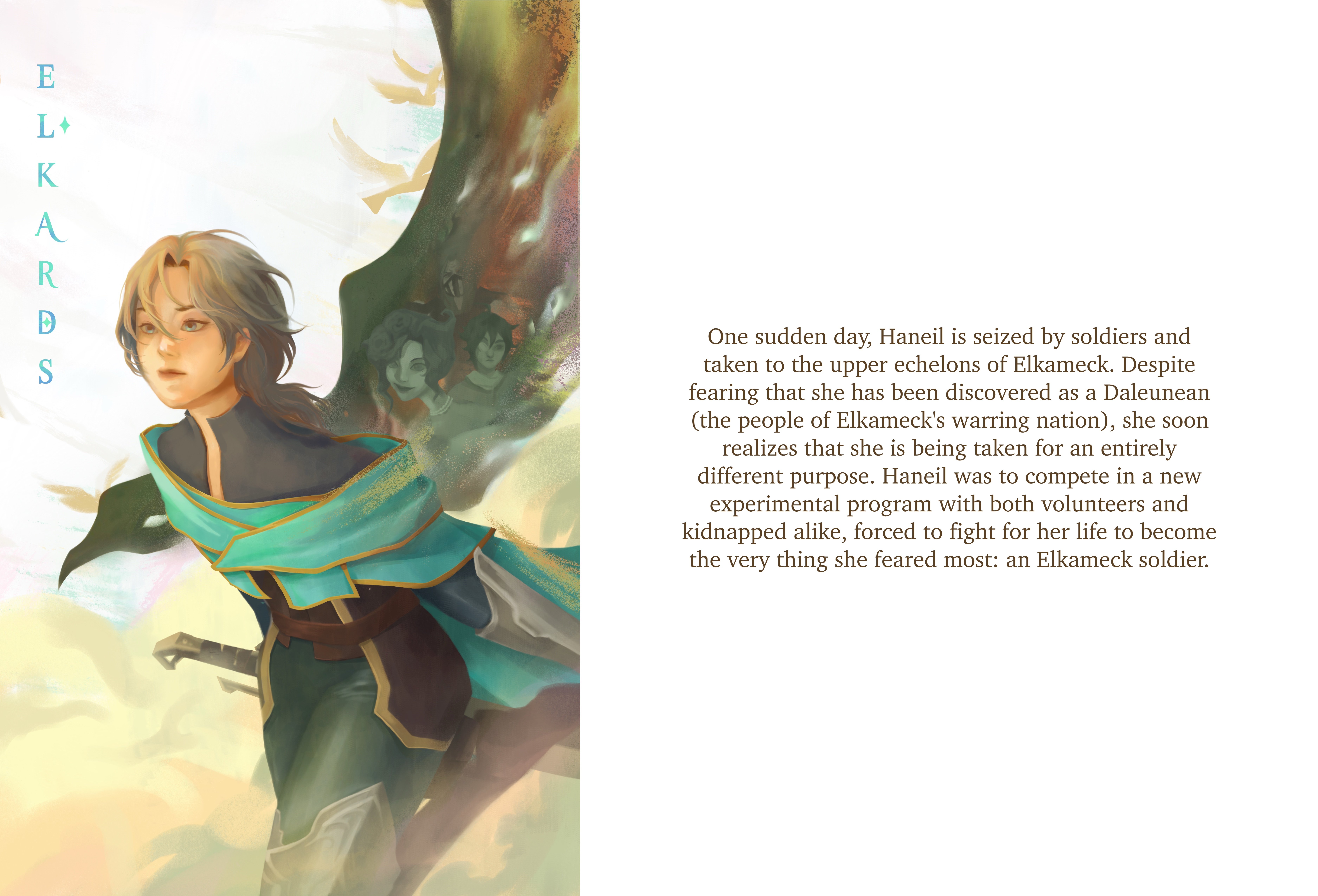 Elkards follows the story of Haneil, who is seized by soldiers from her home and taken to the upper echelons of Elkameck. Haneil is to compete in a new experimental program with both volunteers and kidnapped alike, forced to fight for her life to become the very thing she feared most: an Elkameck soldier.