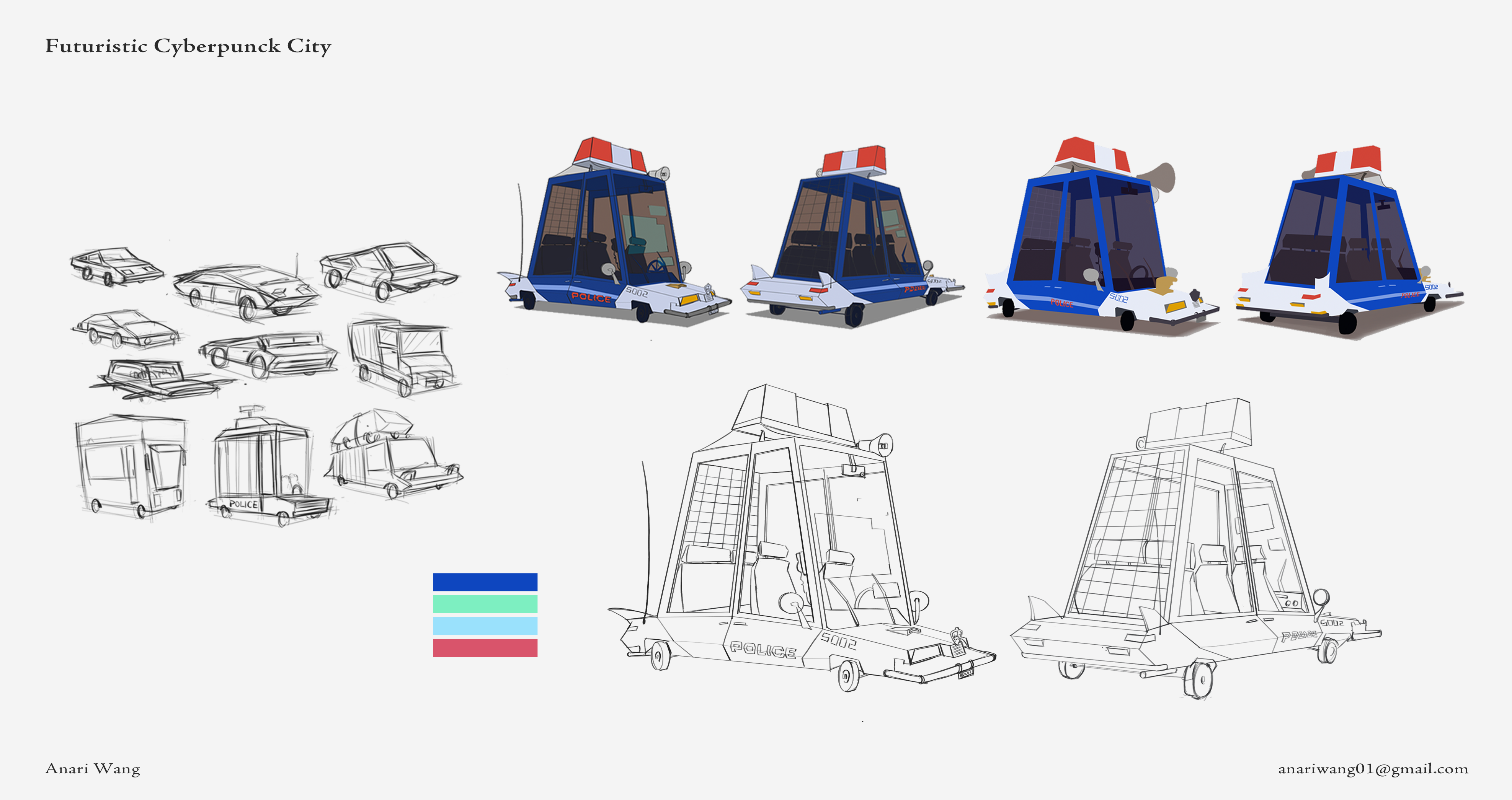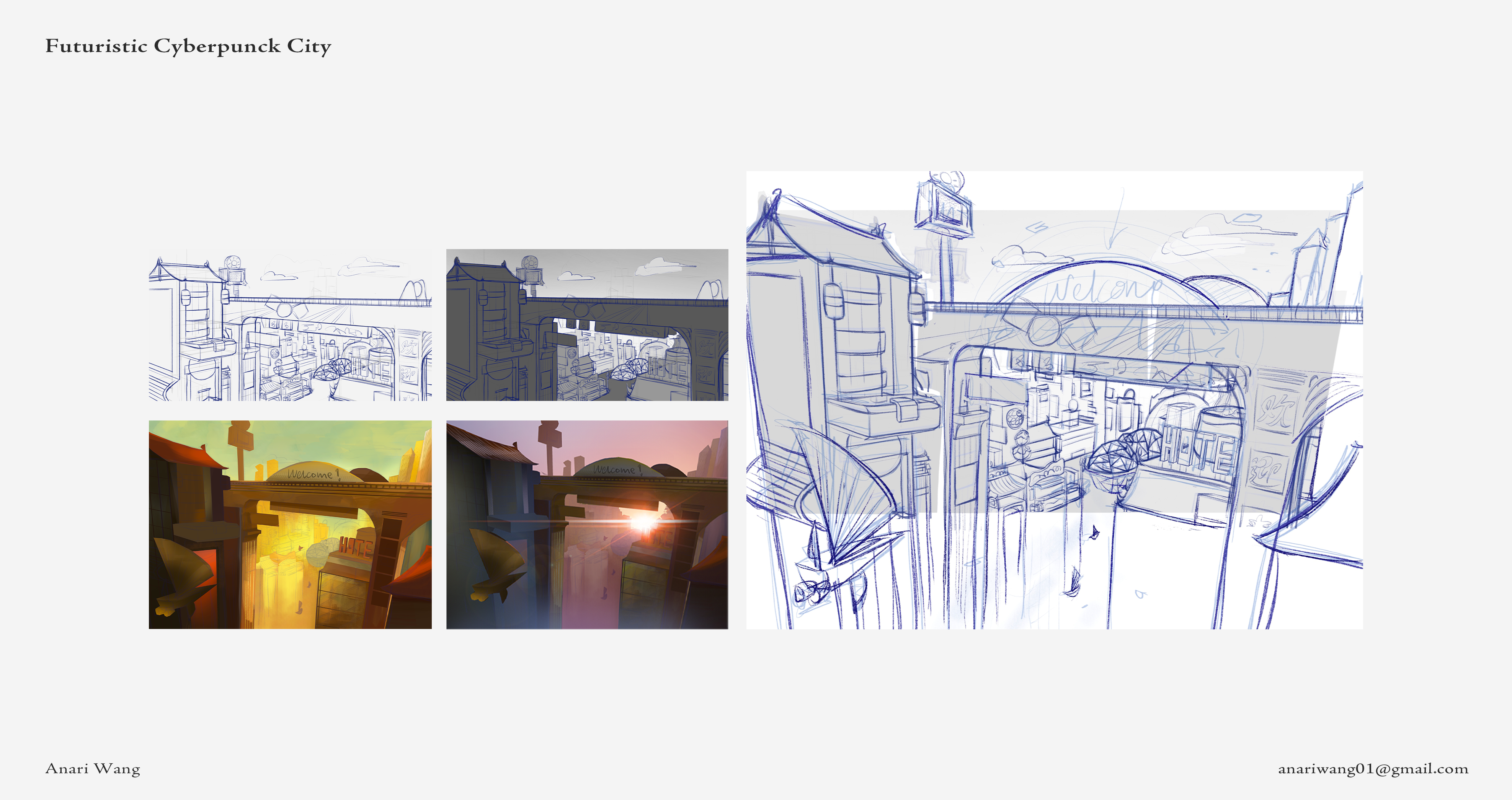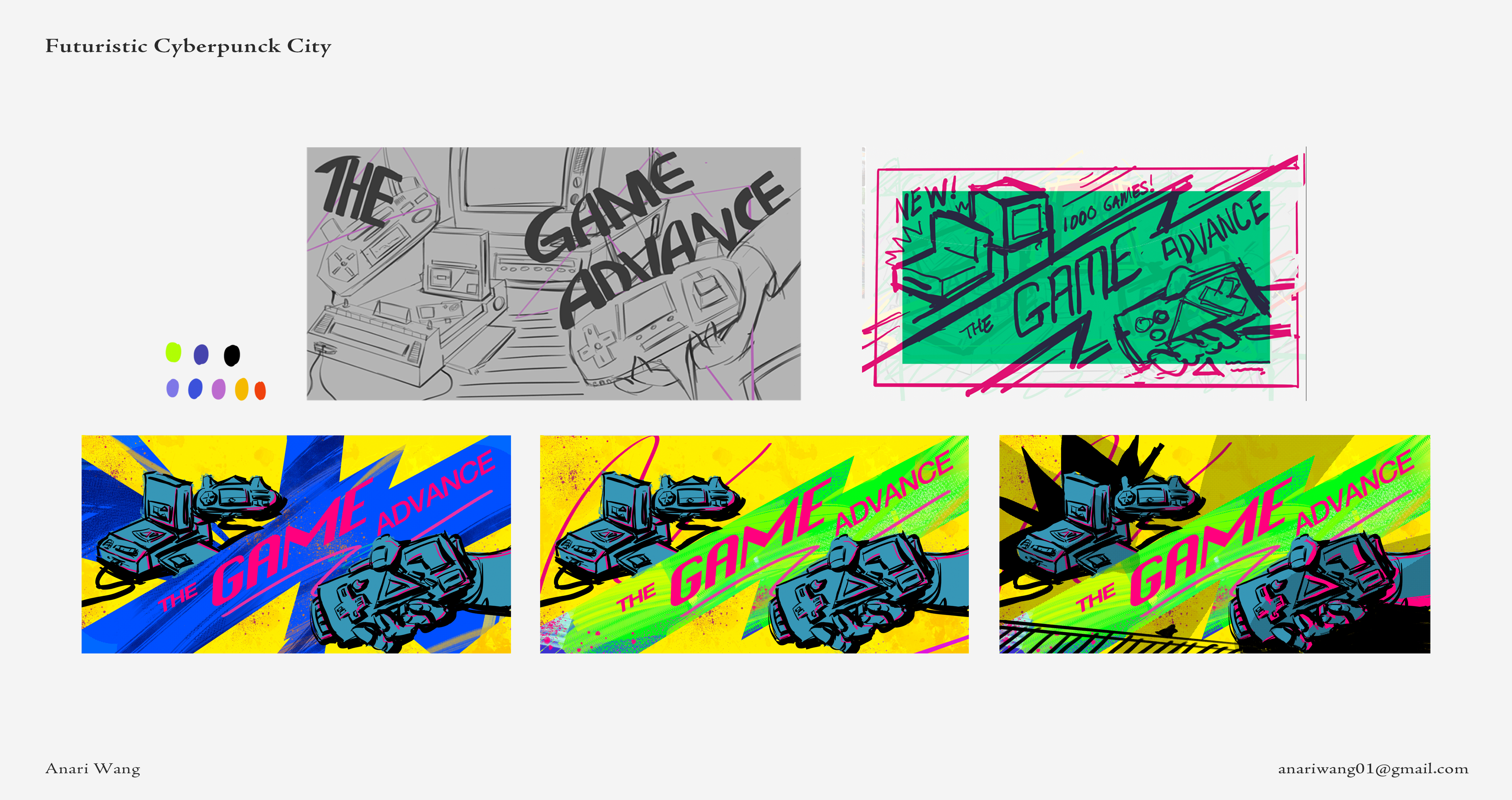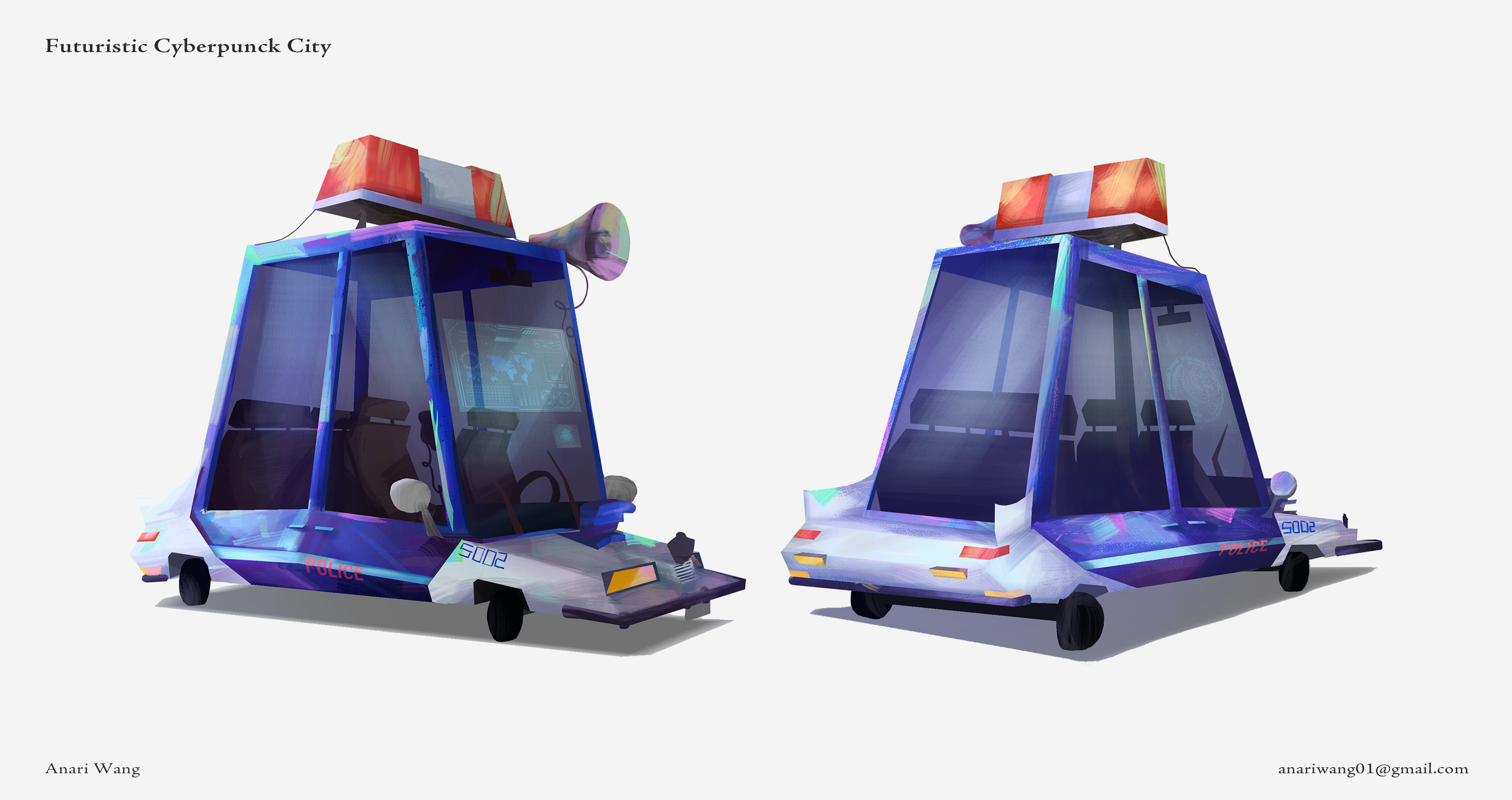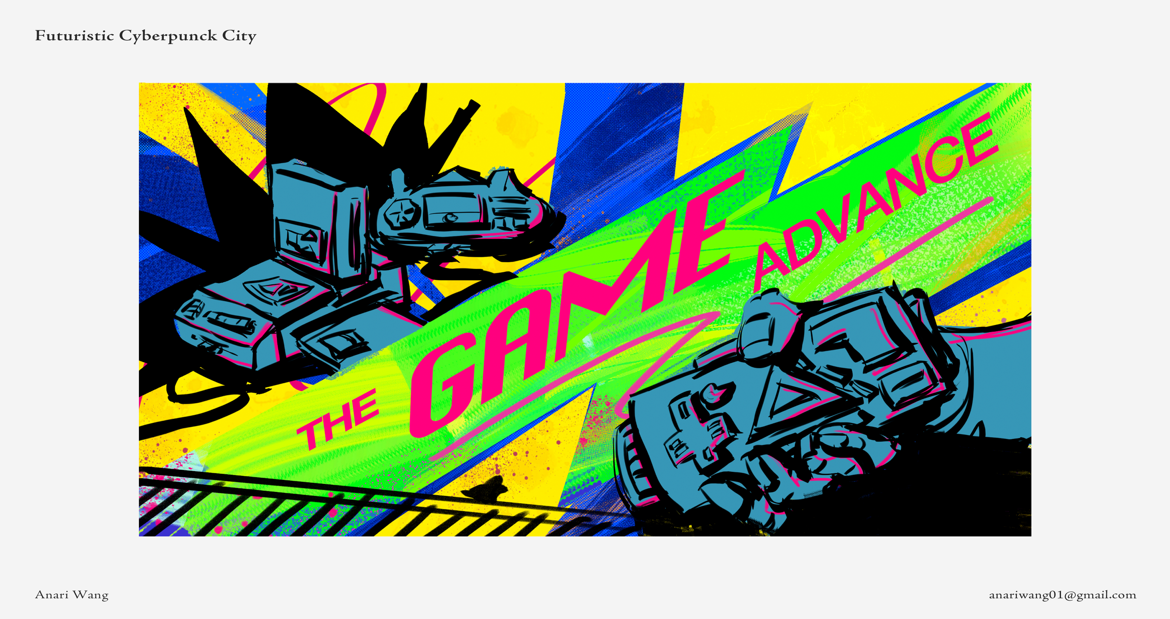This project mainly focuses on the painting of street scenes and elements in the picture. The main period style is based on the futuristic elements of Cyberpunk. In terms of art, I refer to a lot of 2d animation, Spider-Man - Parallel Universe, etc. In this project, we first designed some billboards and vehicles and then designed the final scene to become a complete project.