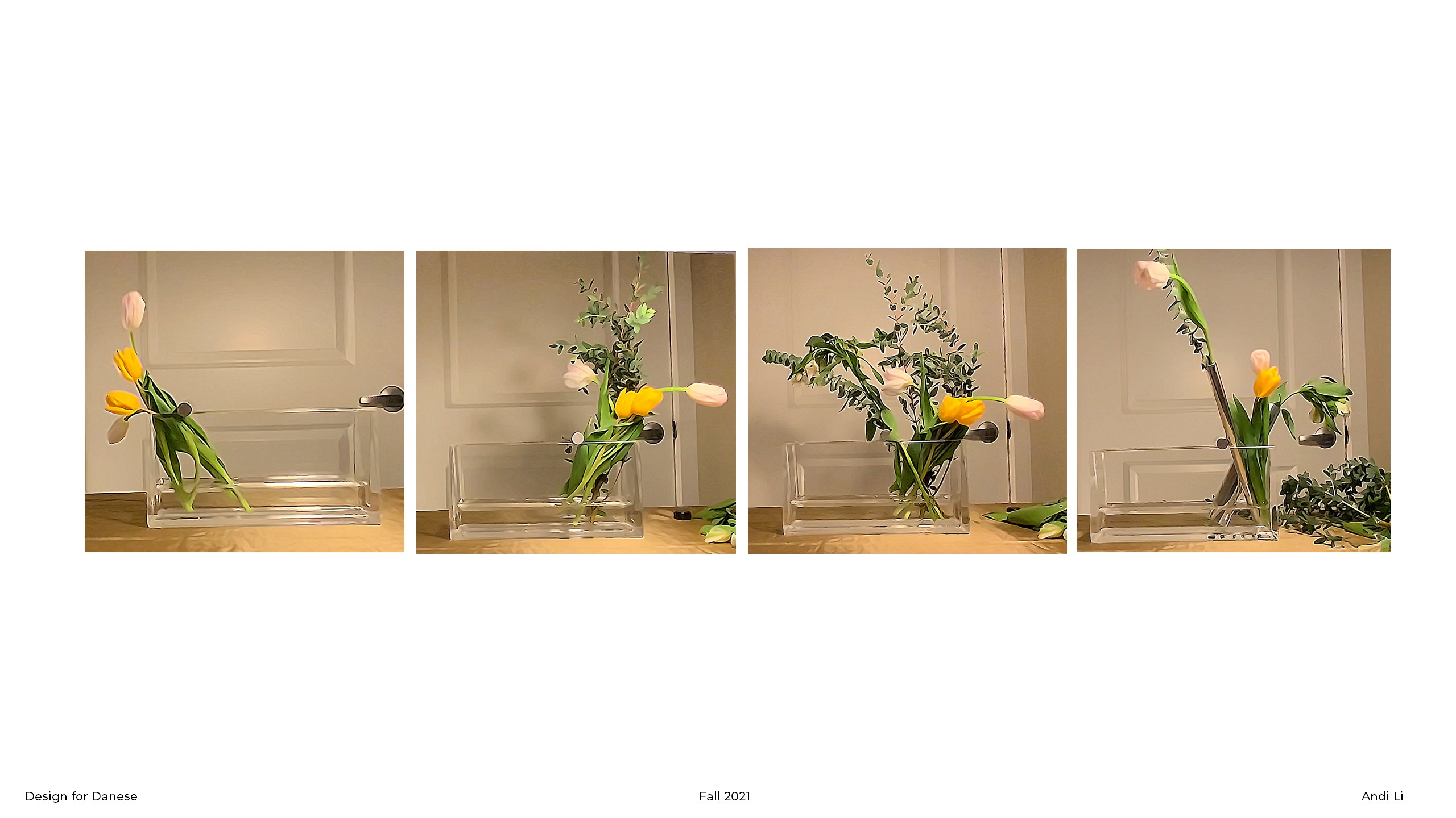The ili vase set aims to guide the users to play with flowers with various lengths, and help the users to arrange the flowers. The video demonstrated how the vases might be used in real life. The models are prototyped with acrylics and aluminum.