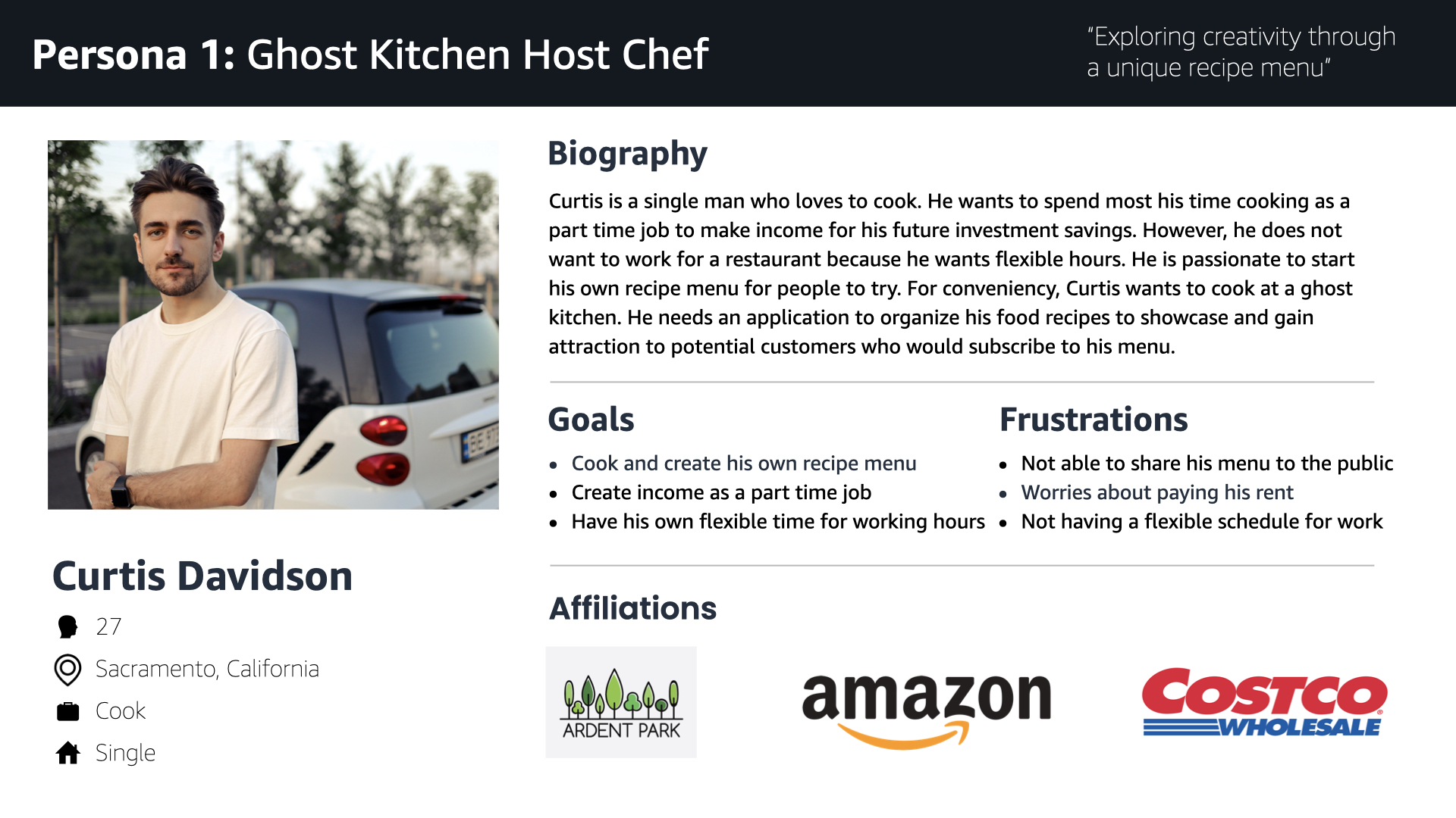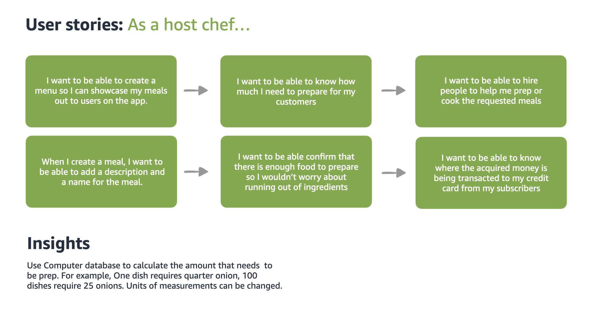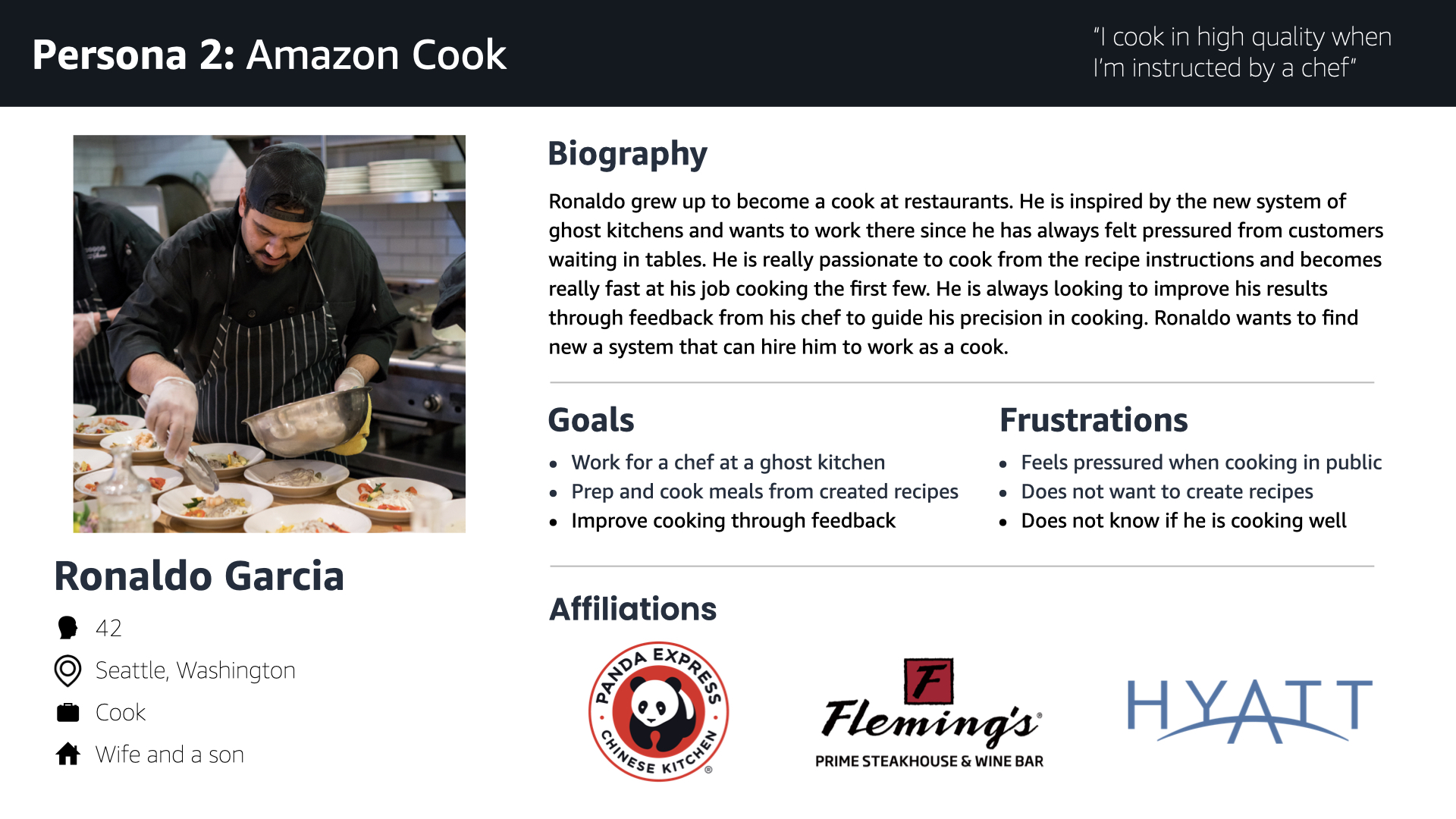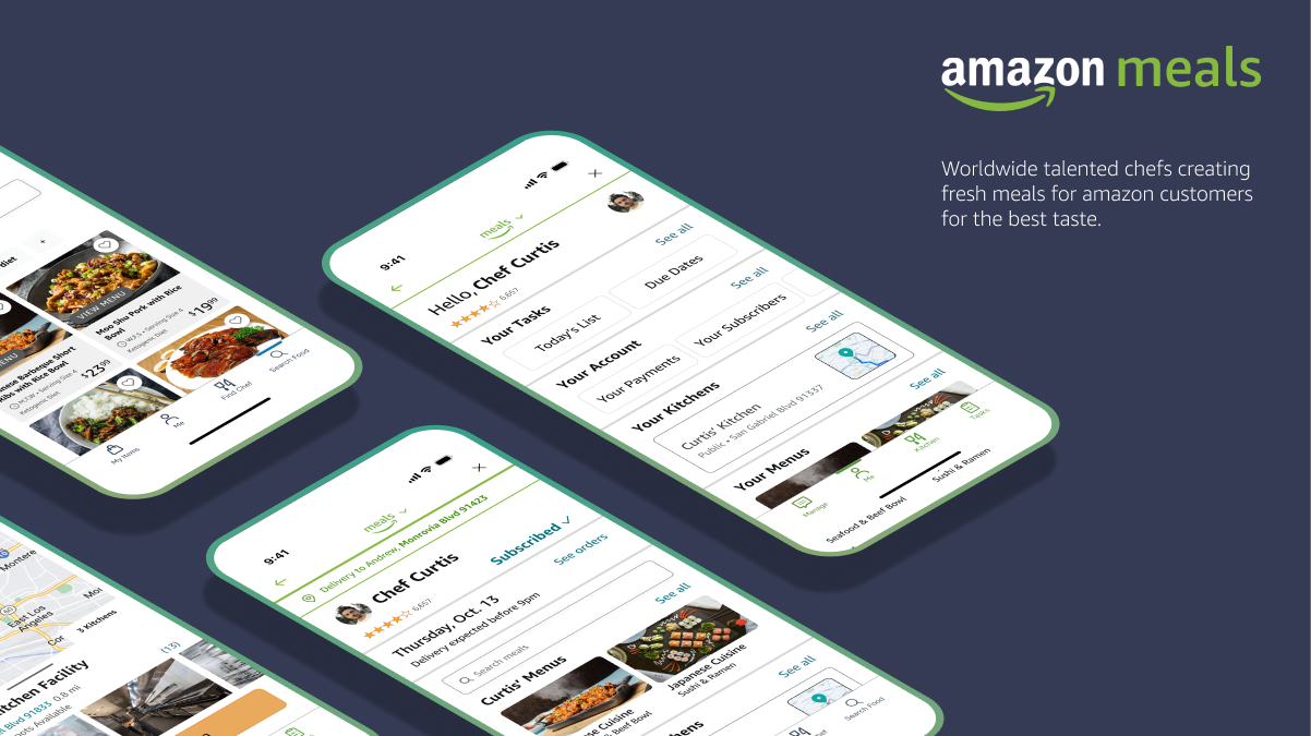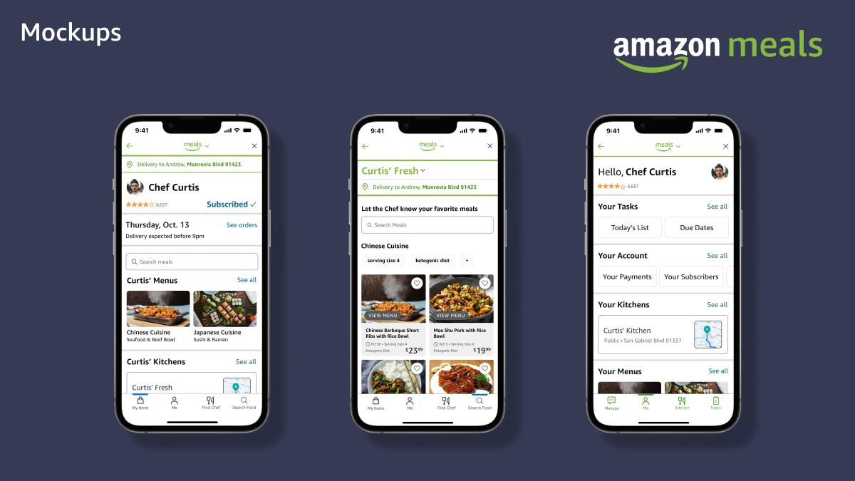 Amazon Meals consists of three user profiles. A Chef who needs to open kitchens to create menus with meals to sell to customers. Chefs also need a way to buy ingredients from Amazon Fresh make the meals. Once a Chef grows in popularity through subscribers, they need to hire Cooks, who would prep meals and cook. Amazon Customers would like to search menus from chefs who have created their own unique recipes.