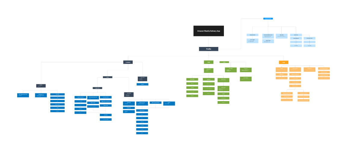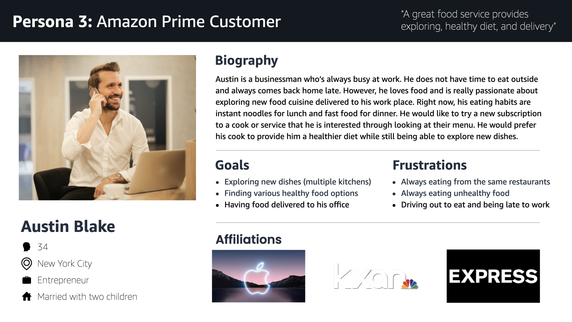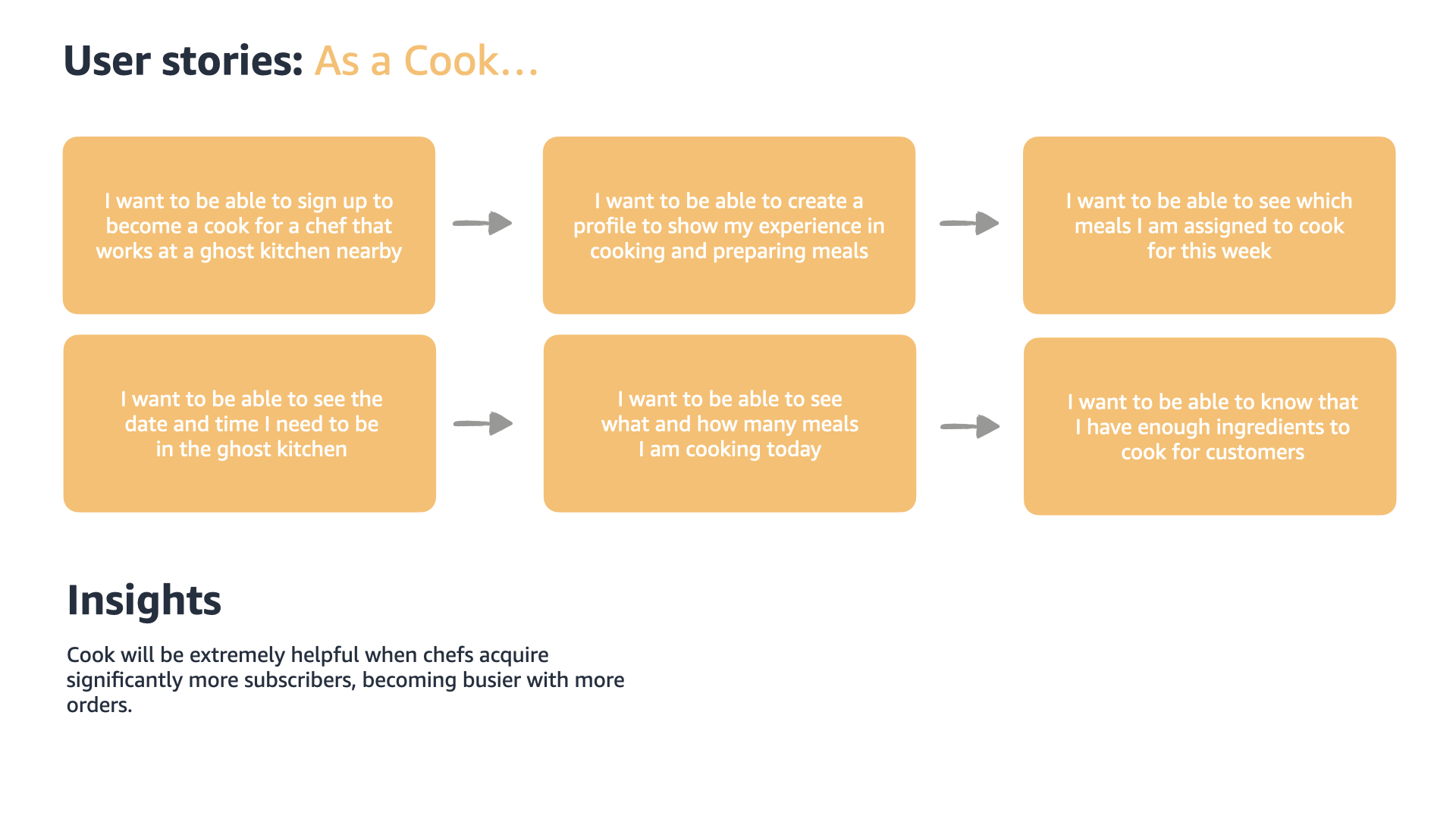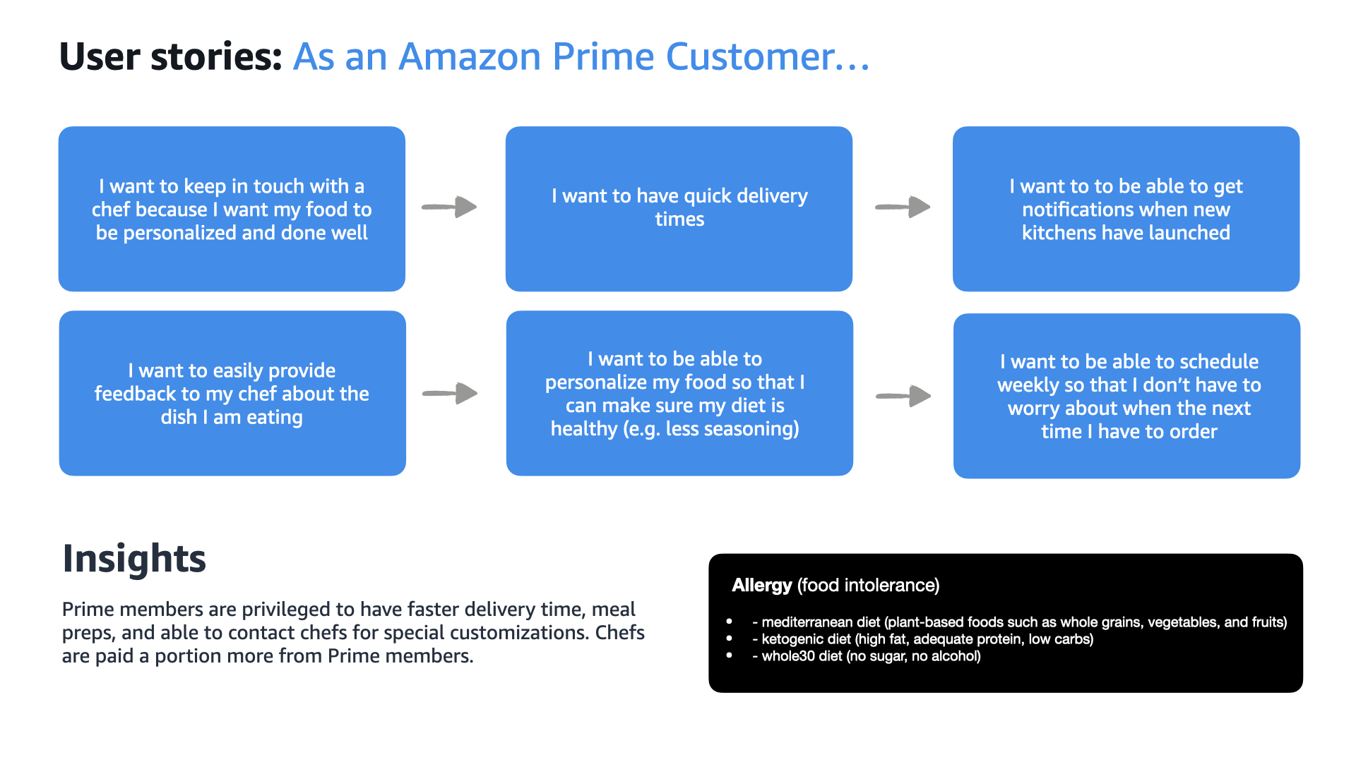 Amazon Meals consists of three user profiles. A Chef who needs to open kitchens to create menus with meals to sell to customers. Chefs also need a way to buy ingredients from Amazon Fresh make the meals. Once a Chef grows in popularity through subscribers, they need to hire Cooks, who would prep meals and cook. Amazon Customers would like to search menus from chefs who have created their own unique recipes.