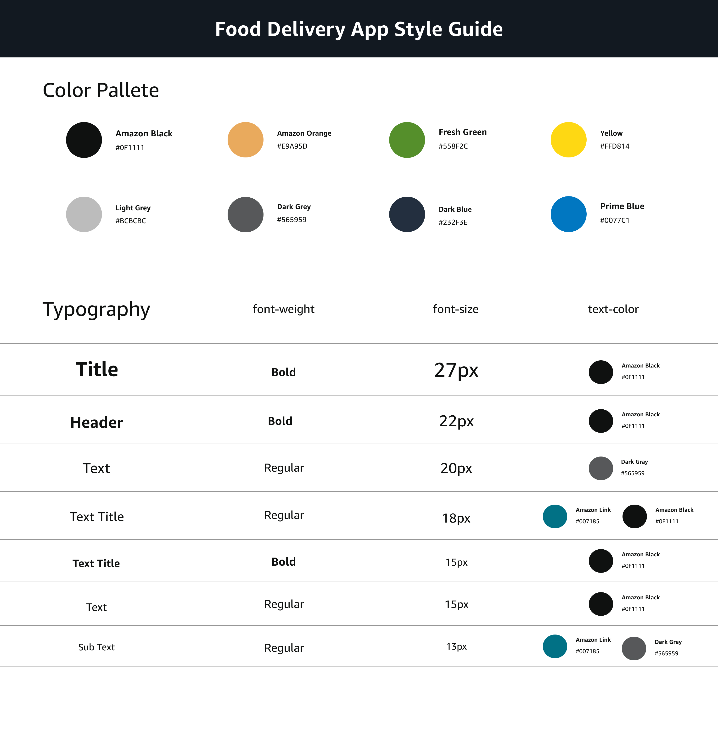 Through Research from using the current Amazon Prime and Fresh, I have created a style guide for the new project Amazon Meals.