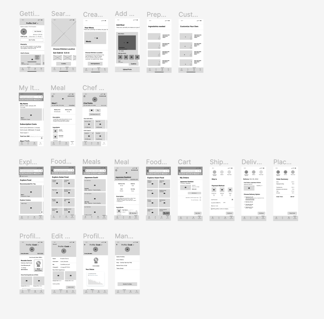Ideation: I've explored multiple wireframe user flows including the Chef User Flow, User Flow of Amazon Customer ordering and purchasing meals, and creating account for Cooks. I found the Chef User Flow to be the most fascinating to make into prototype.