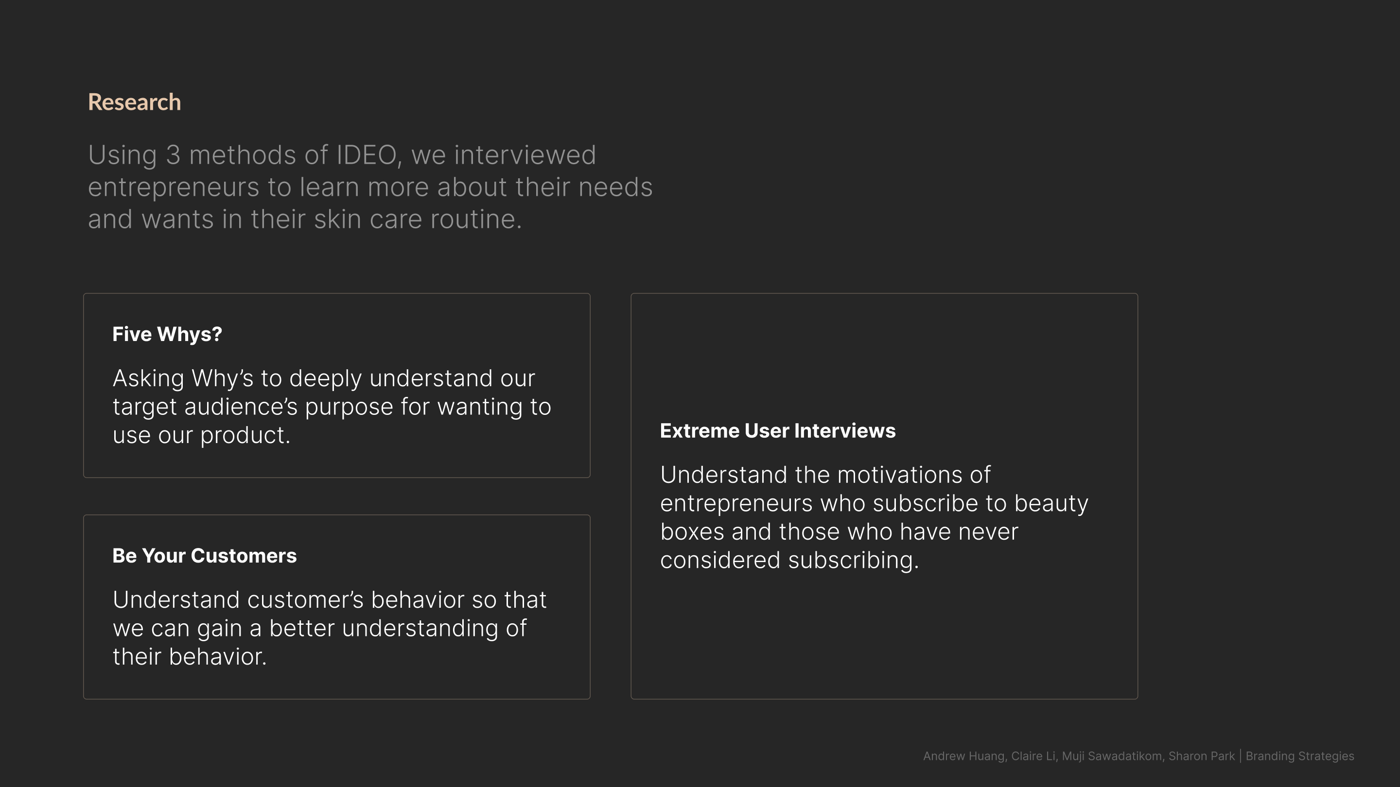 Communication, Roles, Presentation Skills, Branding Strategies, CRE Method, IDEO Interview methods.