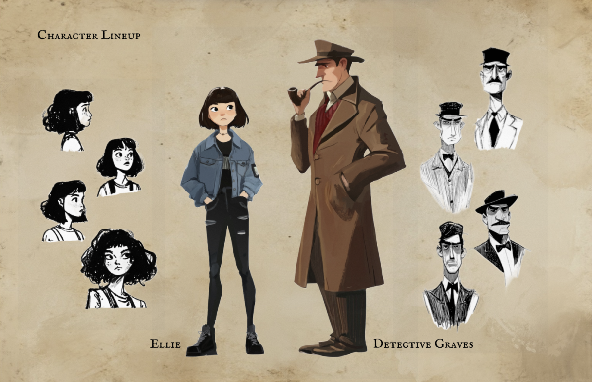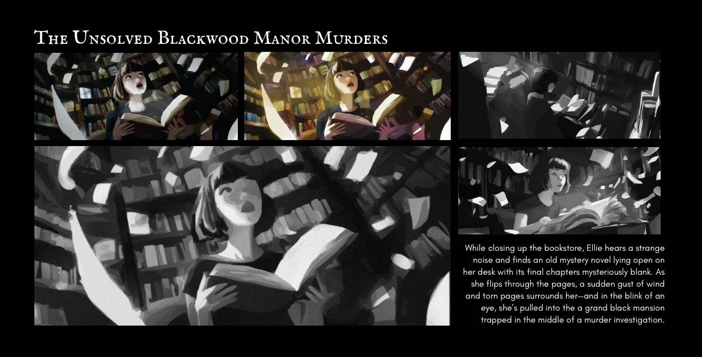 This project is based off of Agatha Christie's mystery novels. The prompt in Design and Color was to create a story around a young person working at a book store and stumbles upon a book that transports them into another world.