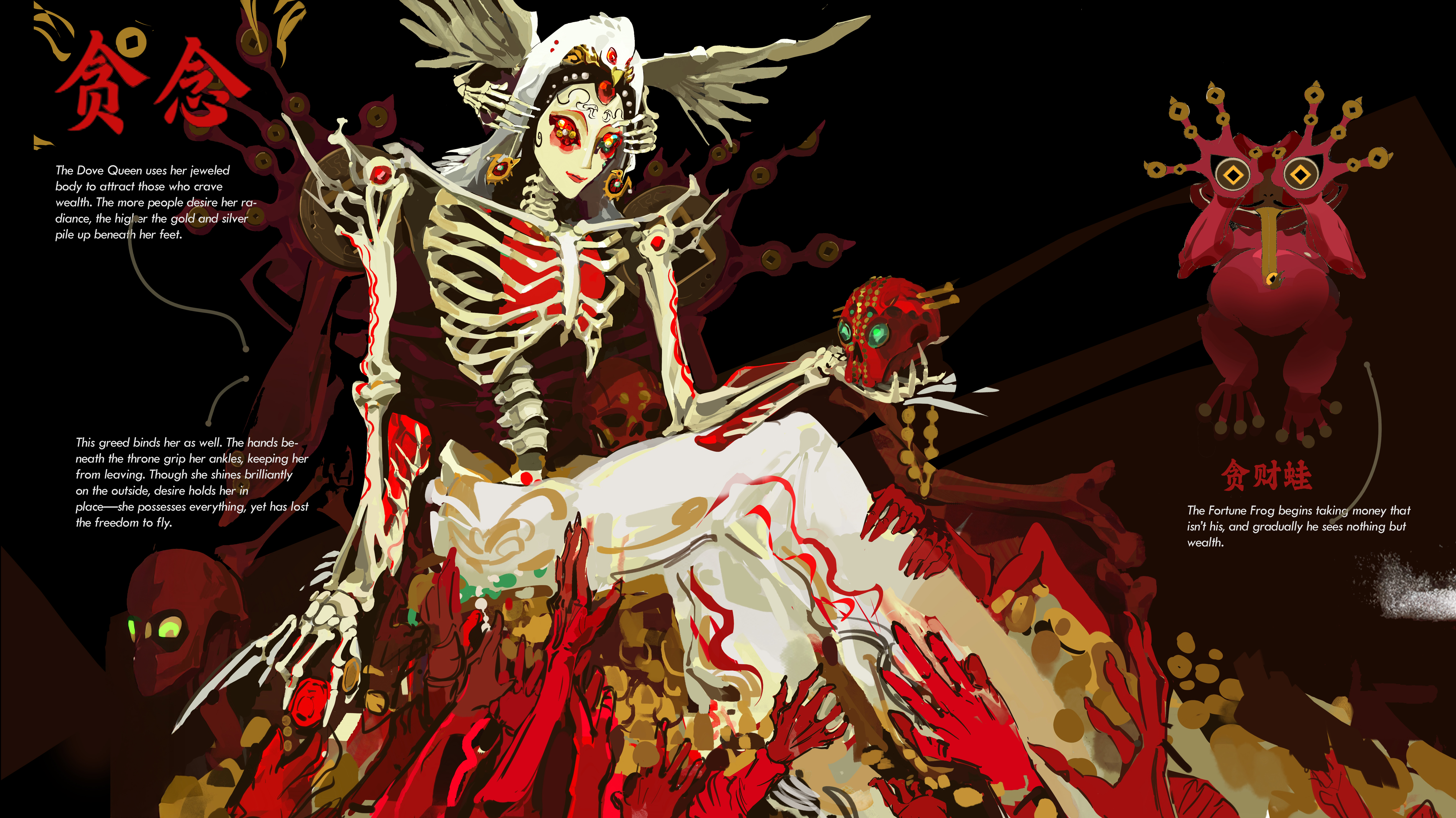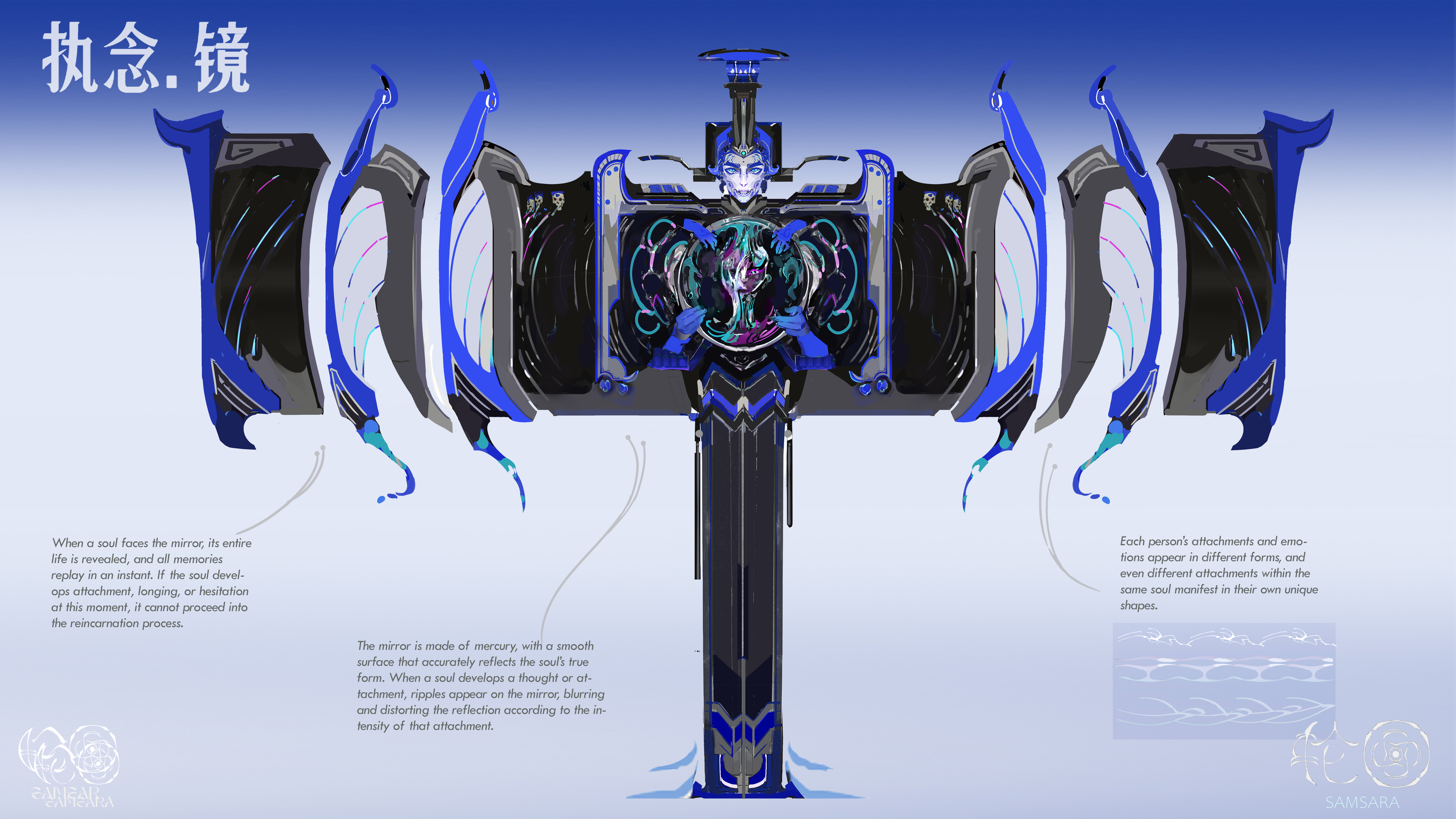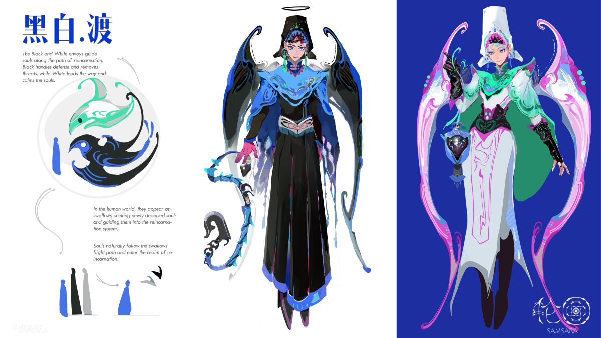 This project visualizes a reimagined afterlife system where souls are guided through reincarnation by the Black and White envoys. Swallows lead newly departed souls into this realm, while objects like dragon-bone chains, final-touch lanterns, and a mercury mirror reveal each soul’s attachments. Characters such as the Dove Queen and the Fortune Frog reflect how desire can trap or distort one’s path. Through symbolic forms and emotional trials, the work explores obsession, clarity, and the struggle to move forward.