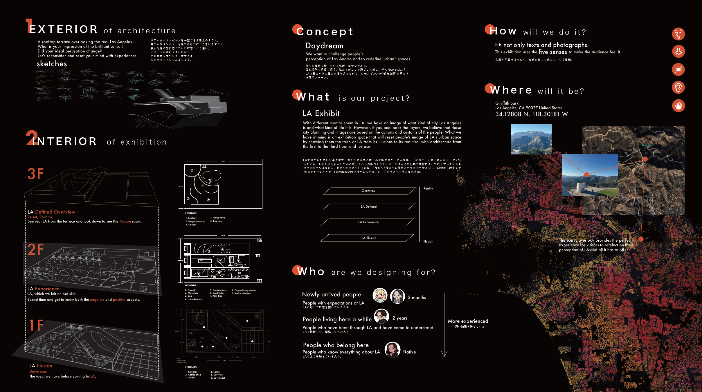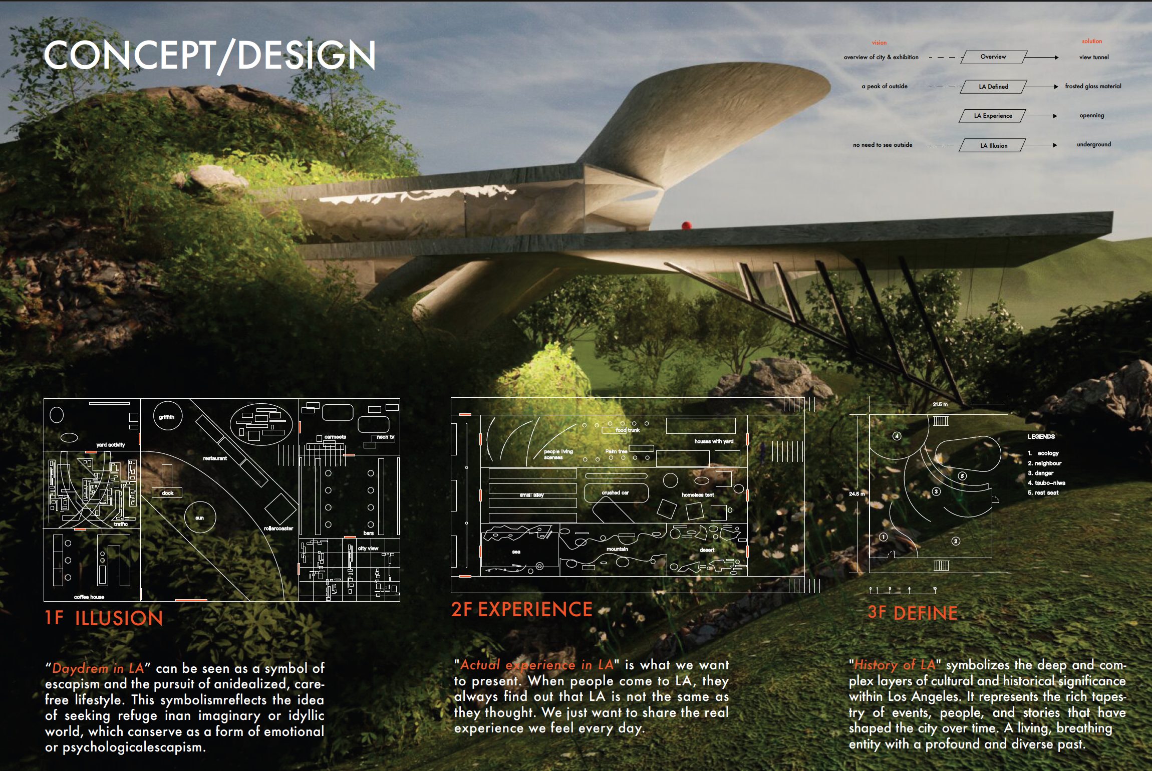 Pacific Rim spatial design experience project. The project is an exhibition space design in collaboration with Tama University students. The project "Peel" focuses on a multi-level building with each level being dedicated to a different view of Los Angeles. For example, the first level focuses on the "Illusion" aspect of LA and people's preconceived notions about the city before arriving here.