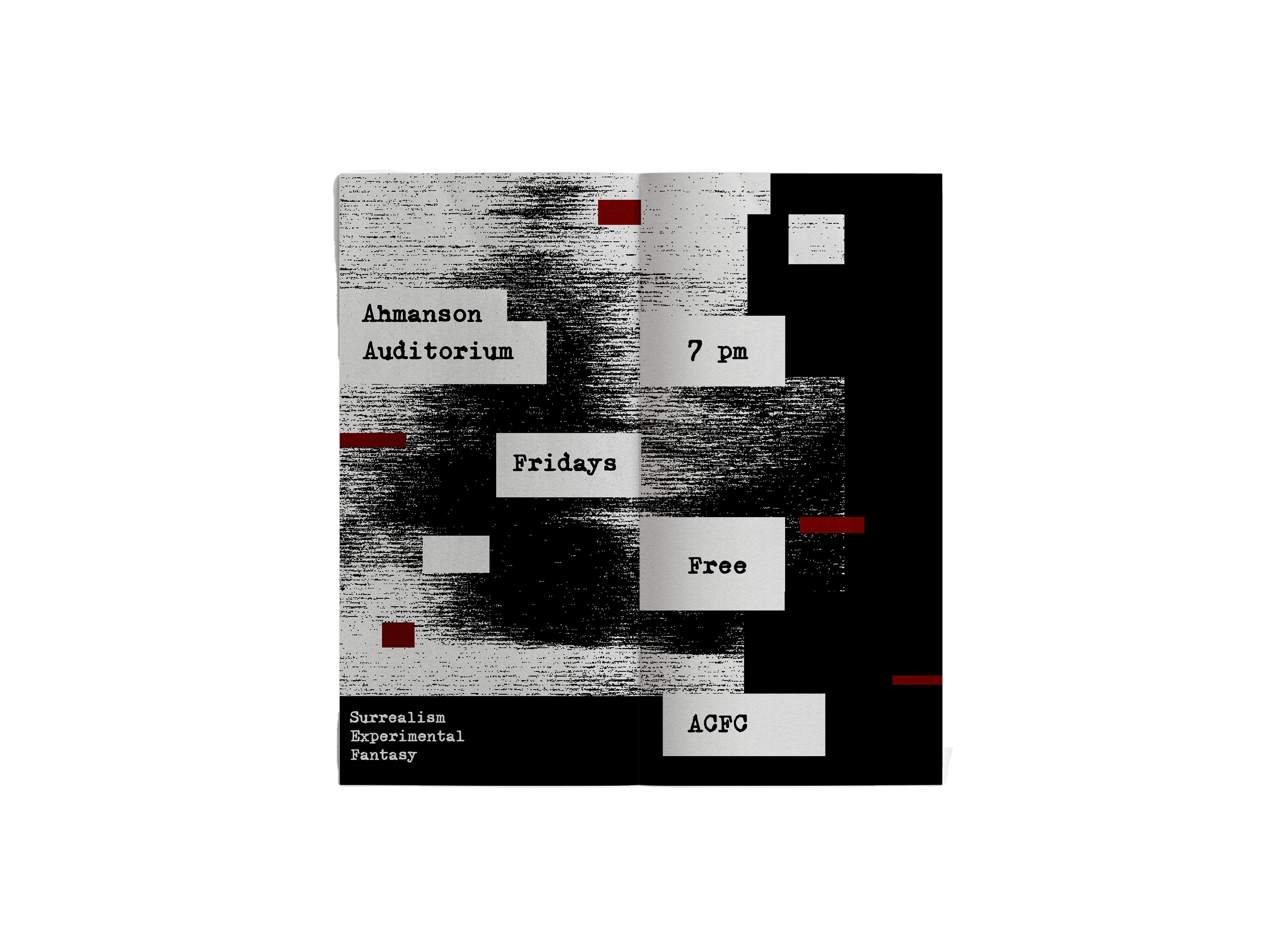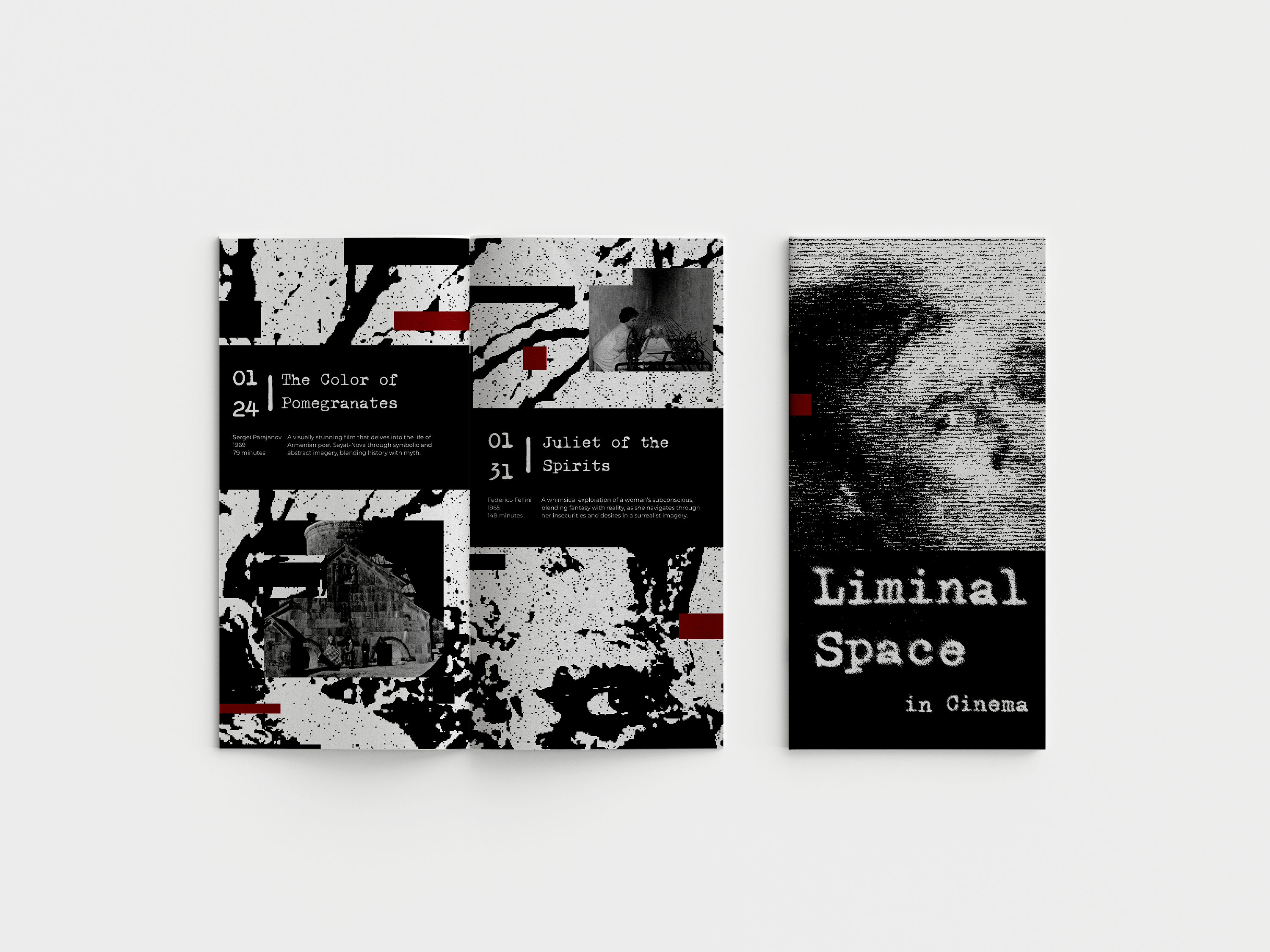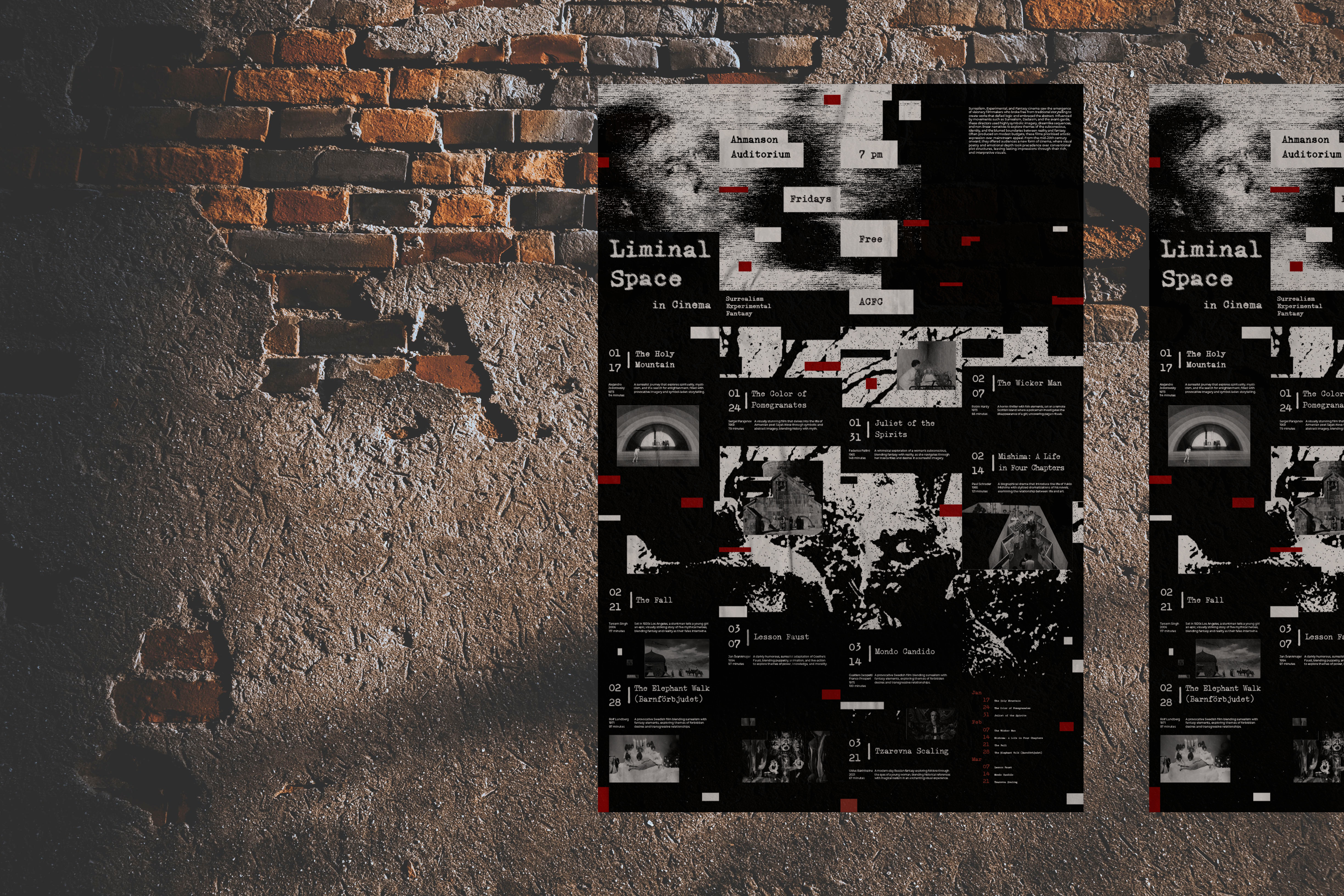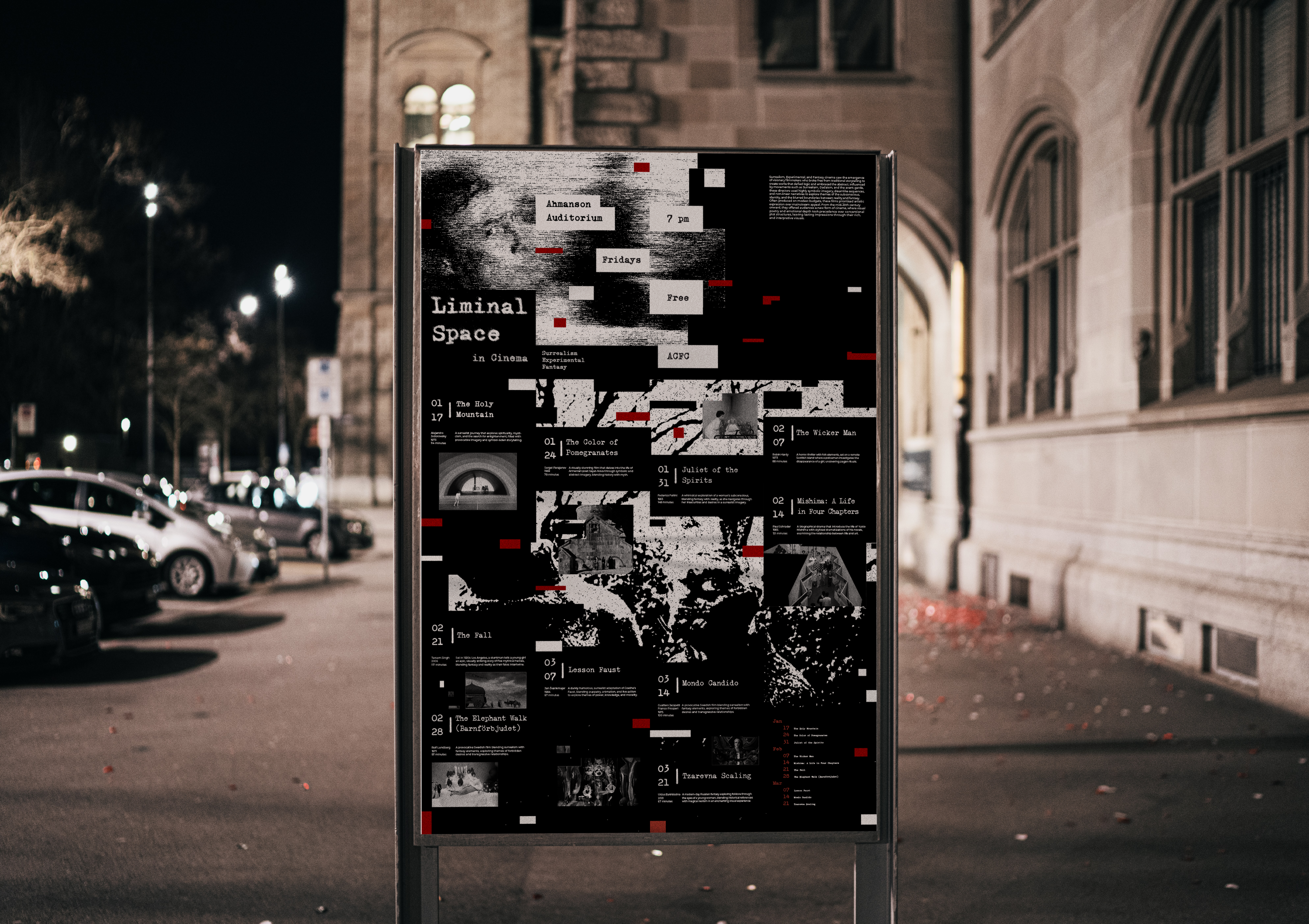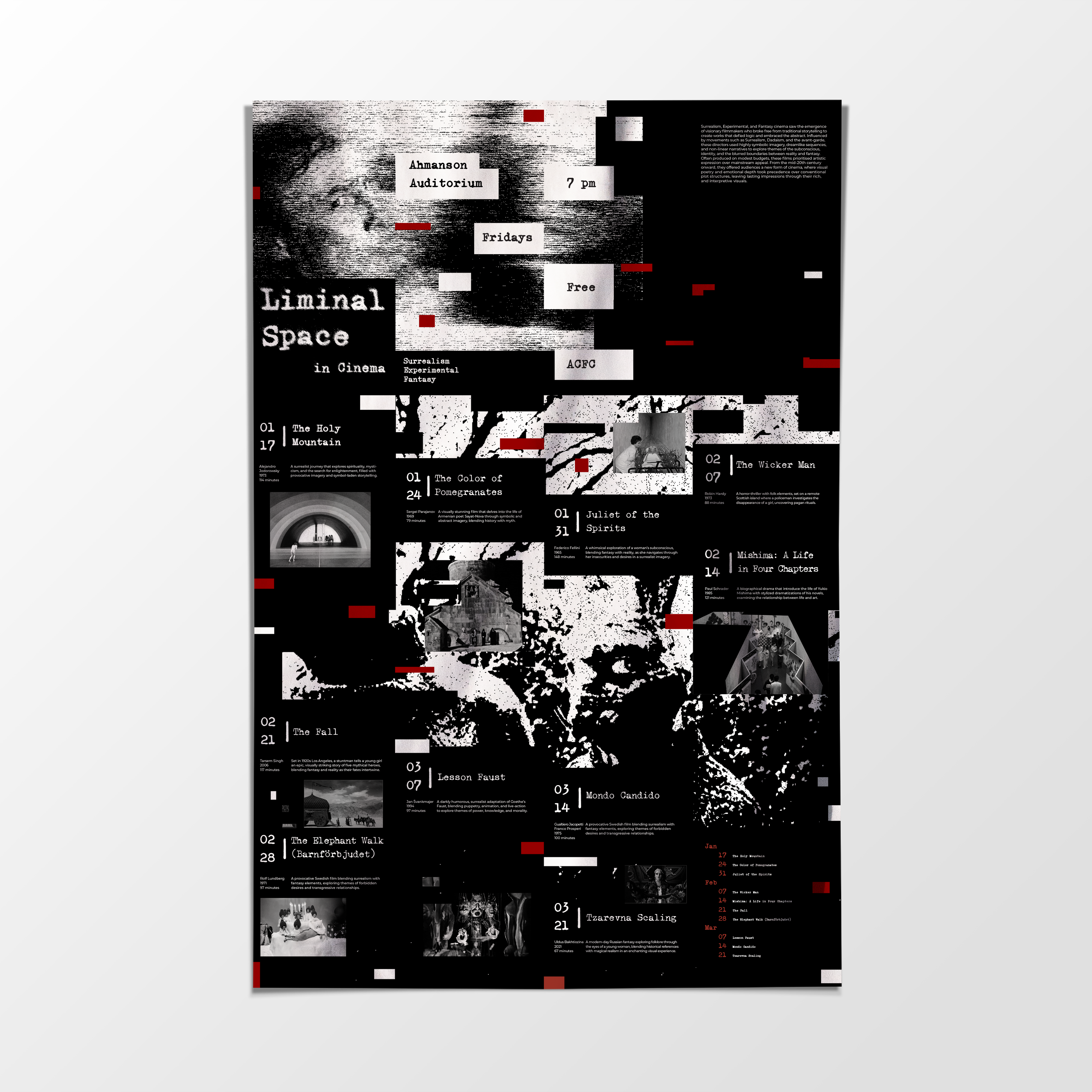 This poster was created for Liminal Space in Cinema, a weekly film festival showcasing ten surrealist and experimental films. Designed to function both as a wall poster and a foldable booklet, the piece maps out the full screening schedule, labelling each title with its date, director, and runtime.