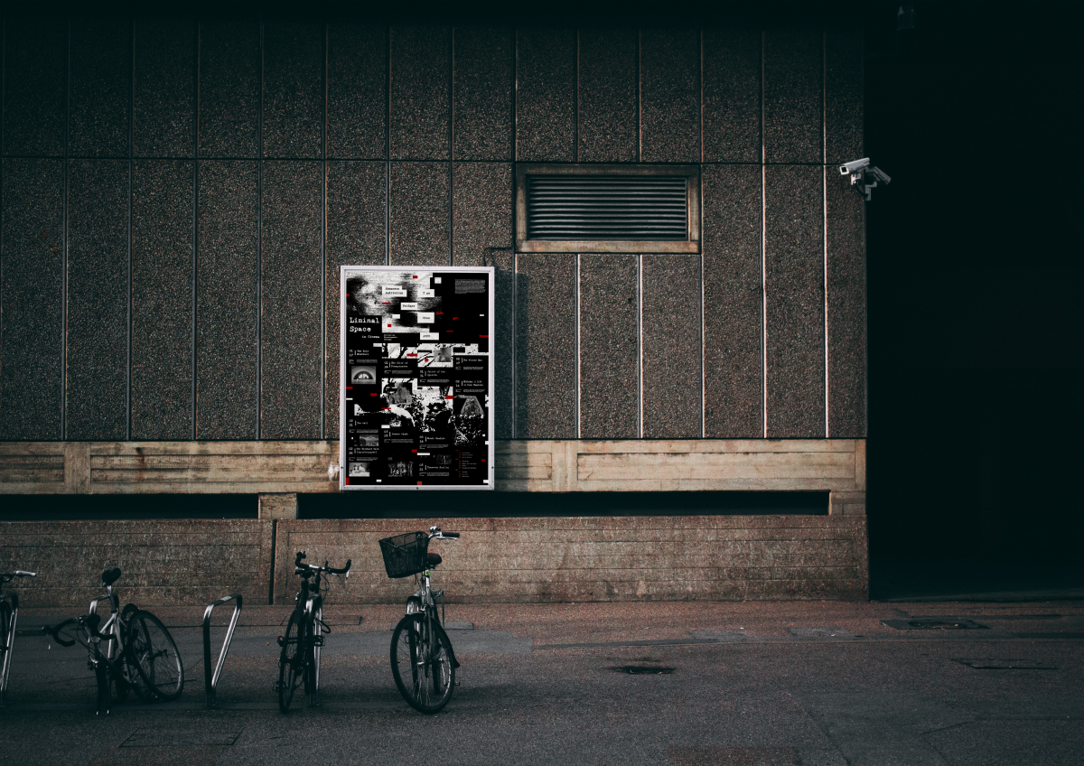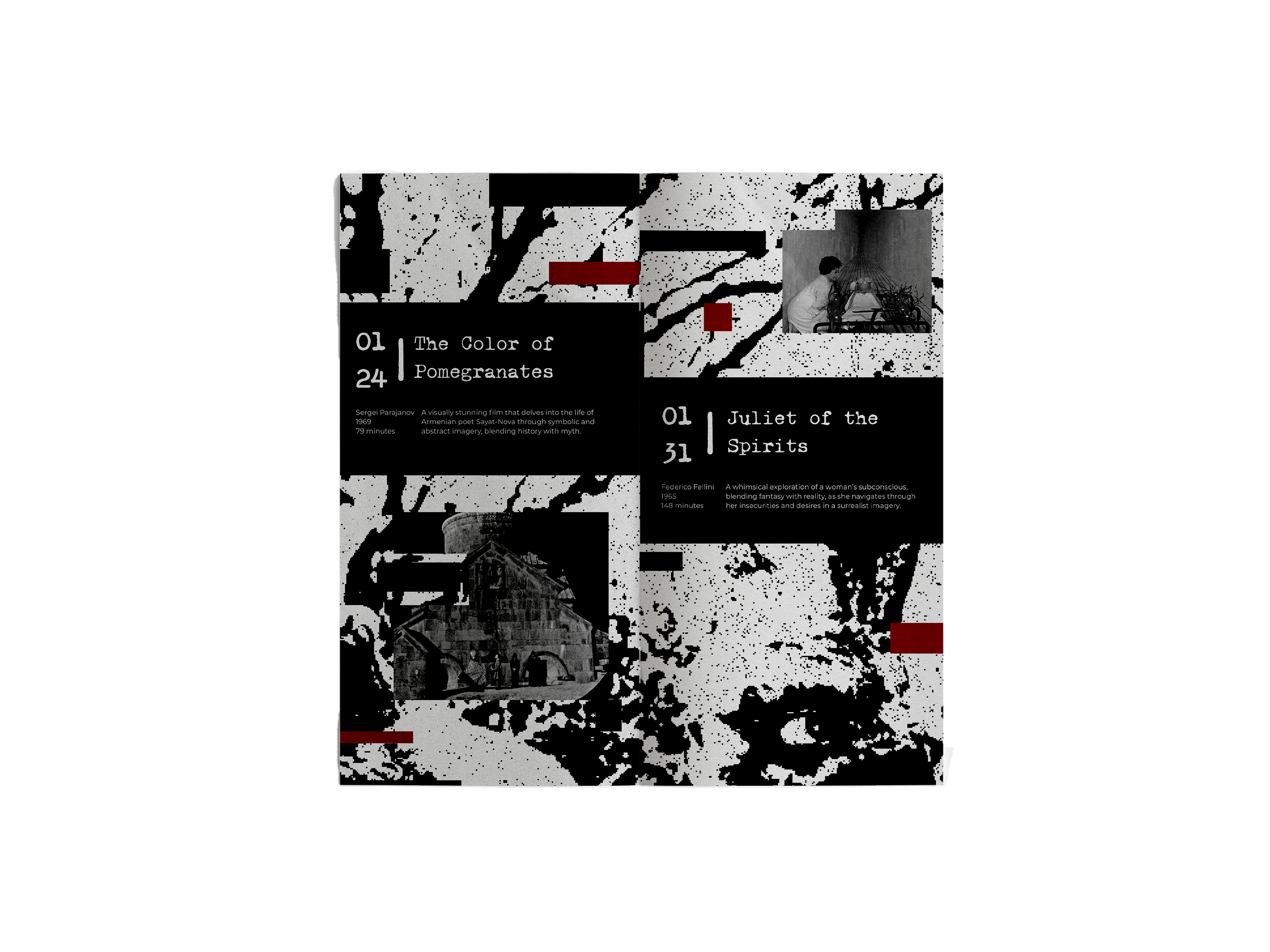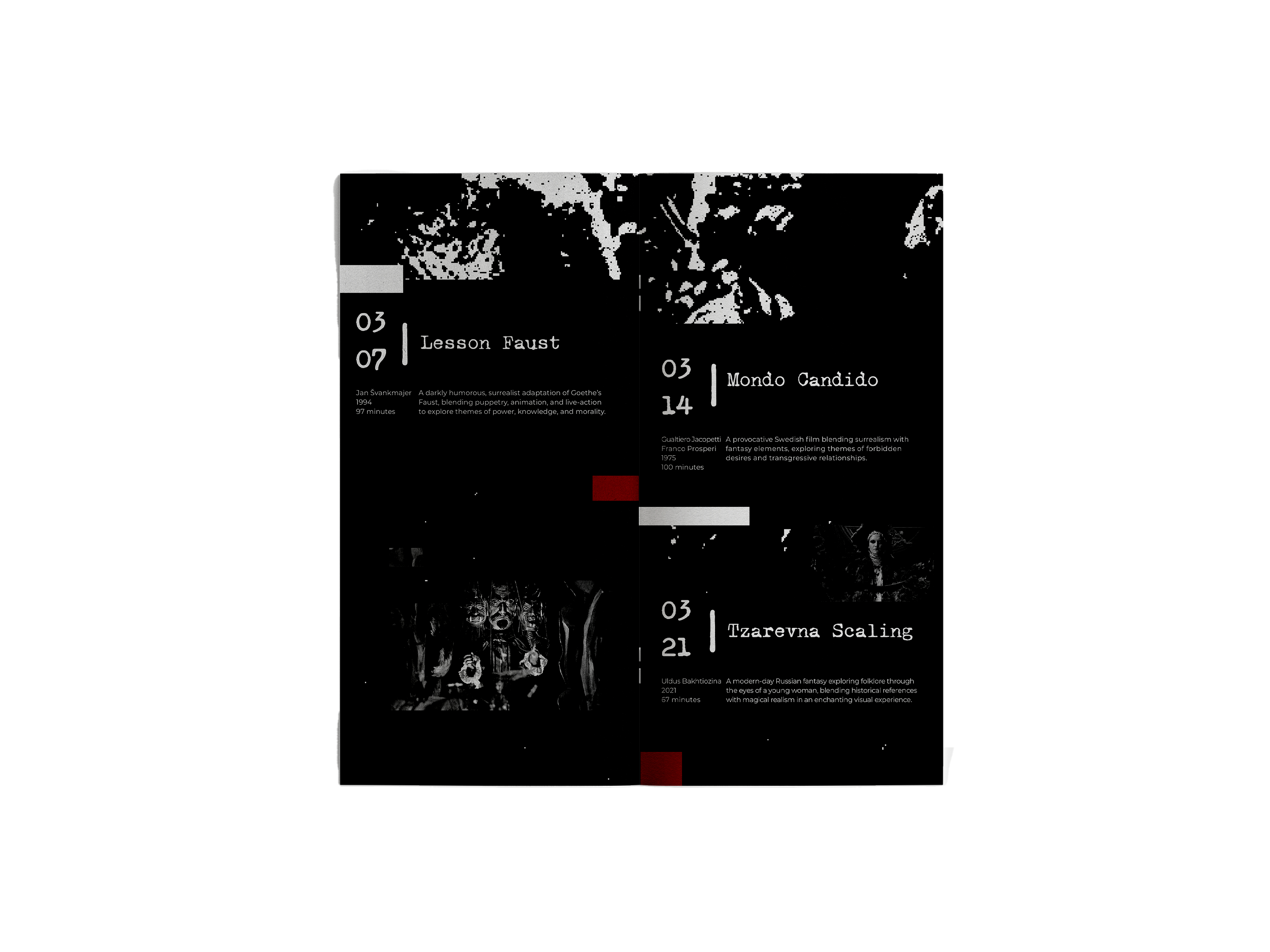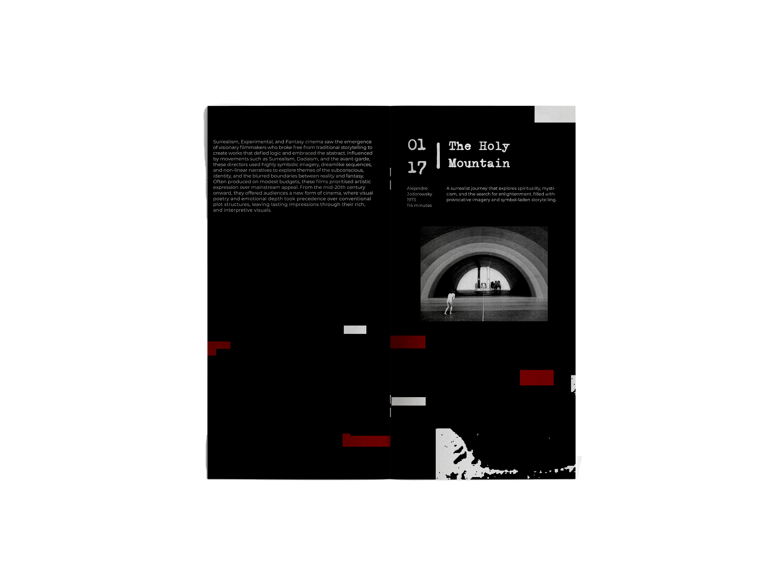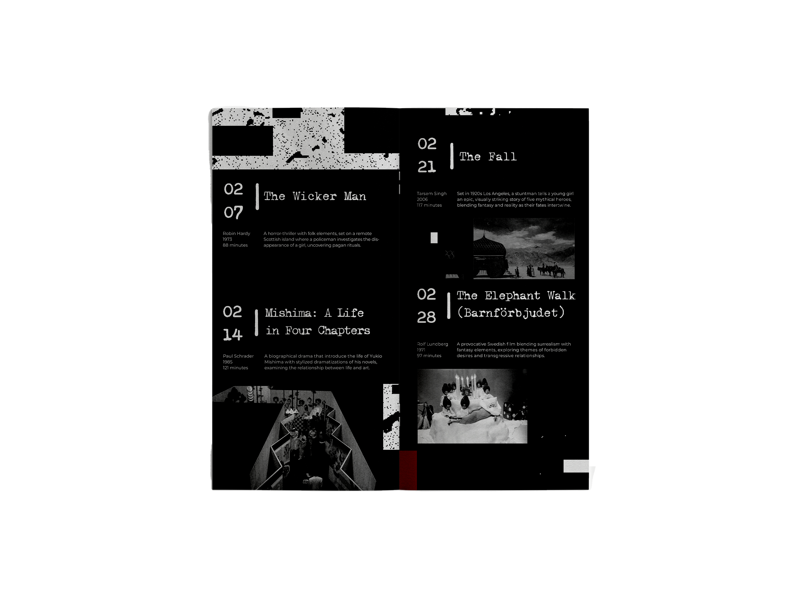 This poster was created for Liminal Space in Cinema, a weekly film festival showcasing ten surrealist and experimental films. Designed to function both as a wall poster and a foldable booklet, the piece maps out the full screening schedule, labelling each title with its date, director, and runtime.