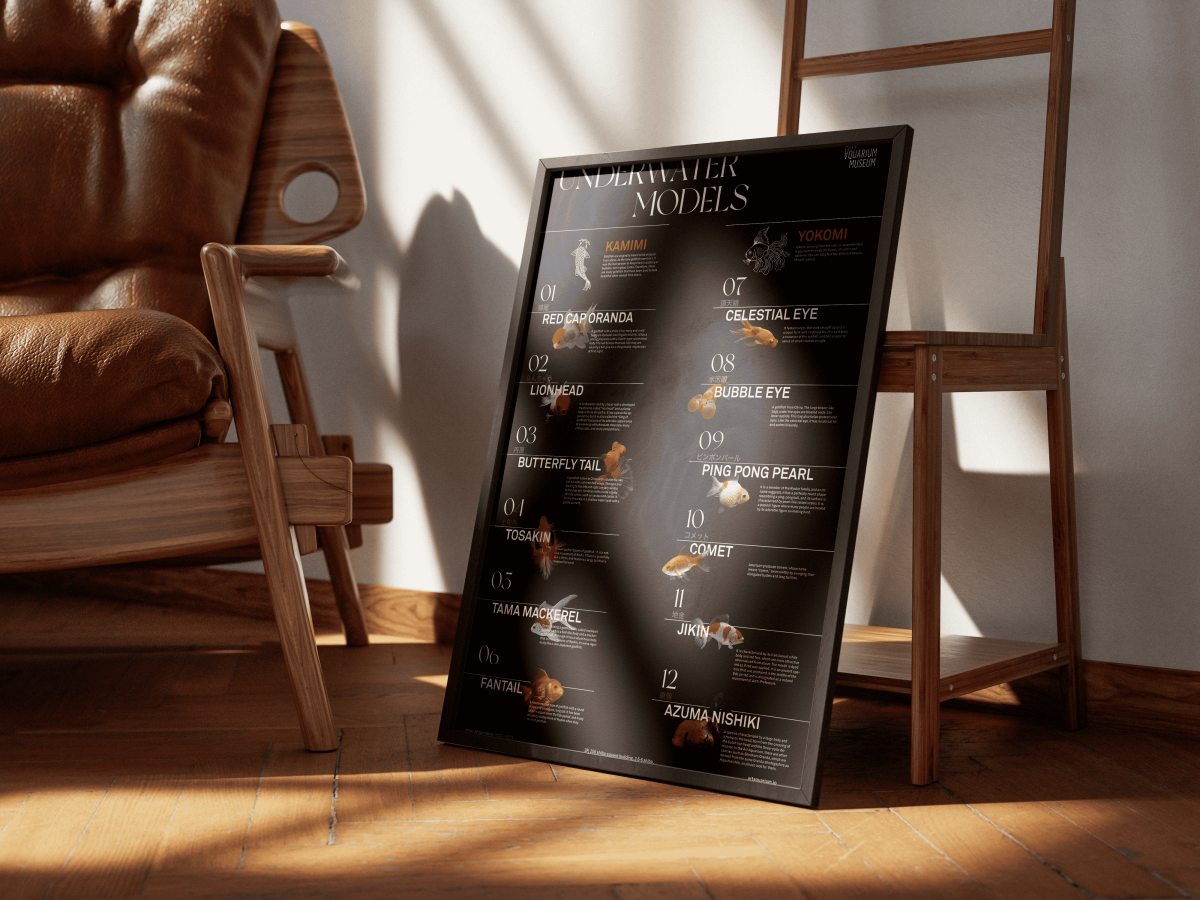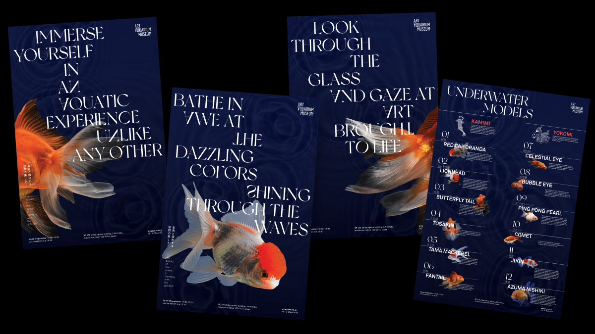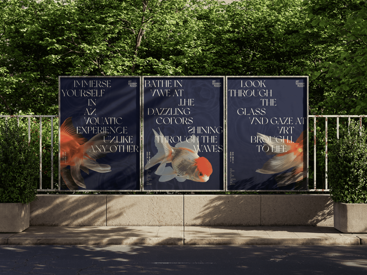 While doing research on the aquarium, I learned that they only featured goldfish and was surprised yet intrigued about the many different species, most of which I never even knew existed! With this in mind, I wanted to inform other visitors about the beautiful fish with an interesting description describing each fish. The overall branding is very type driven, and my goal was to mimic the feeling and movement of waves with the type treatment. While editing the images of the goldfish, I tried to make it seem as if they are swimming across the posters leaving ripples in their wake.