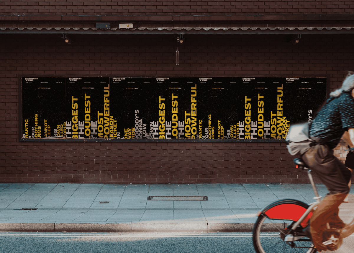 For the posters, I wanted to visualize the text as sound. When they’re shown all together like this, it emulates the look of sound waves while also teasing a hint to passerby as to what the event may be. I wanted the experience of viewing the posters to be fun, so I included lyrics from some of the bands performing at the festival within the posters.