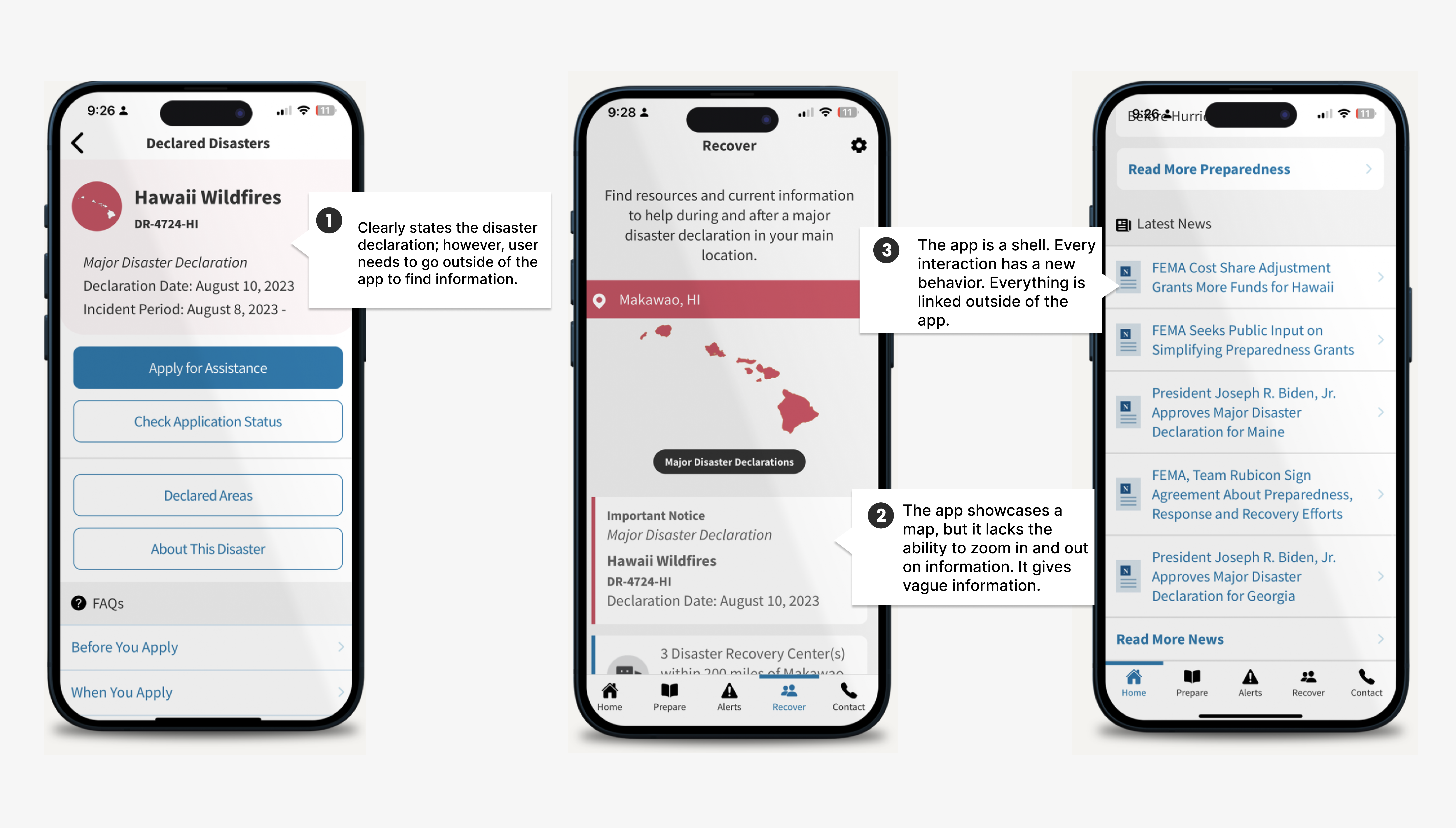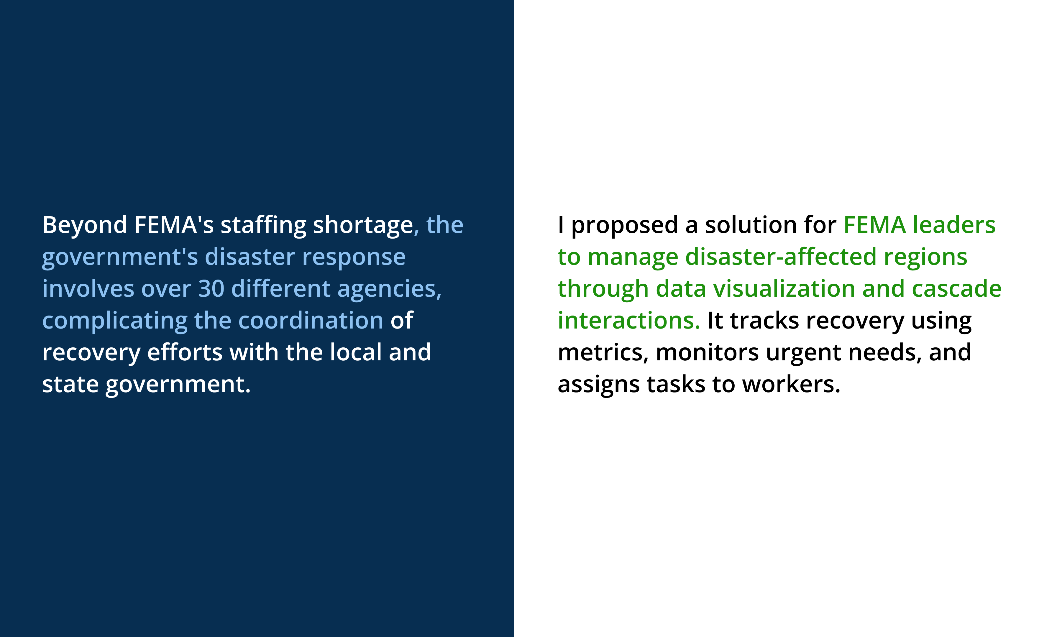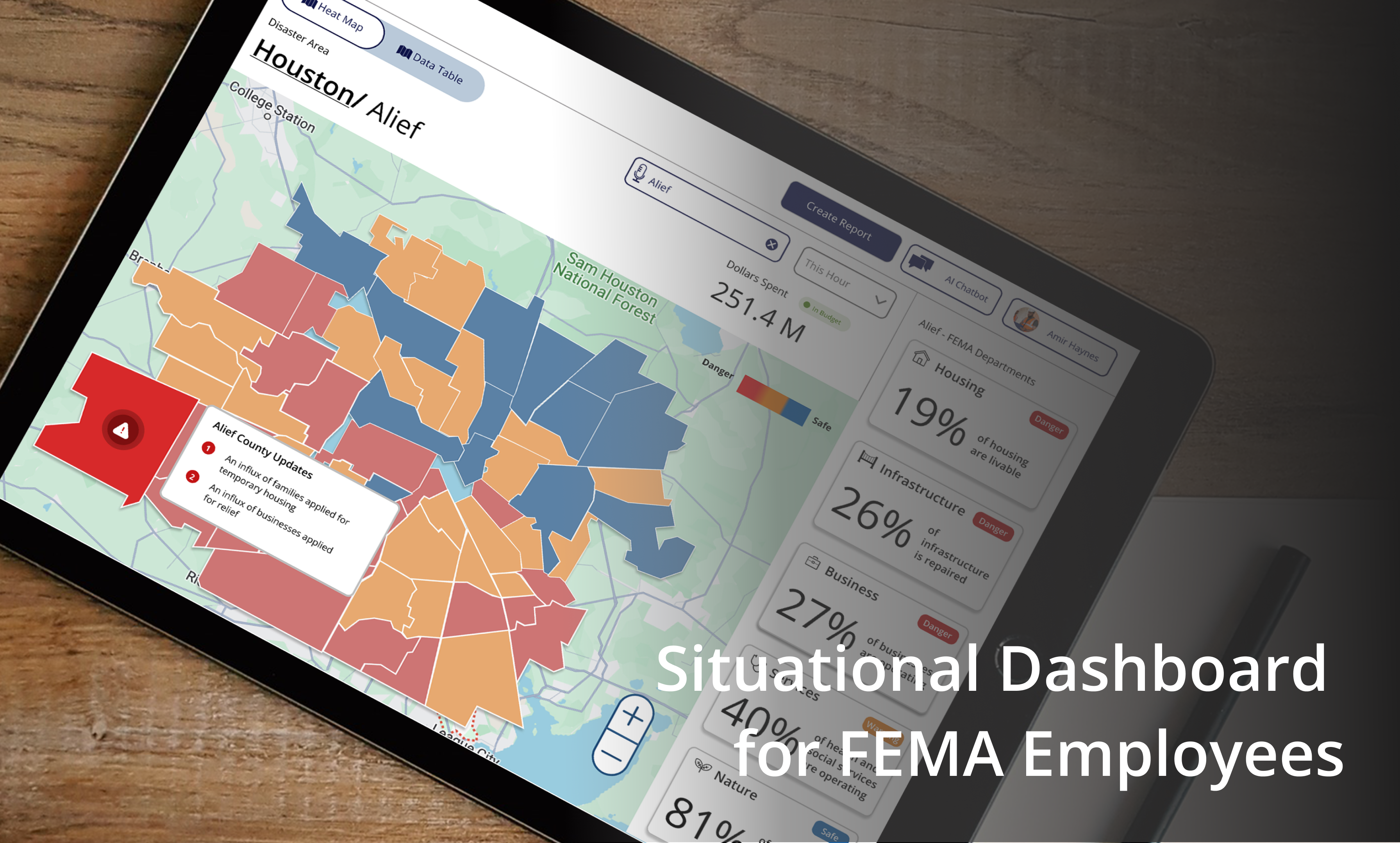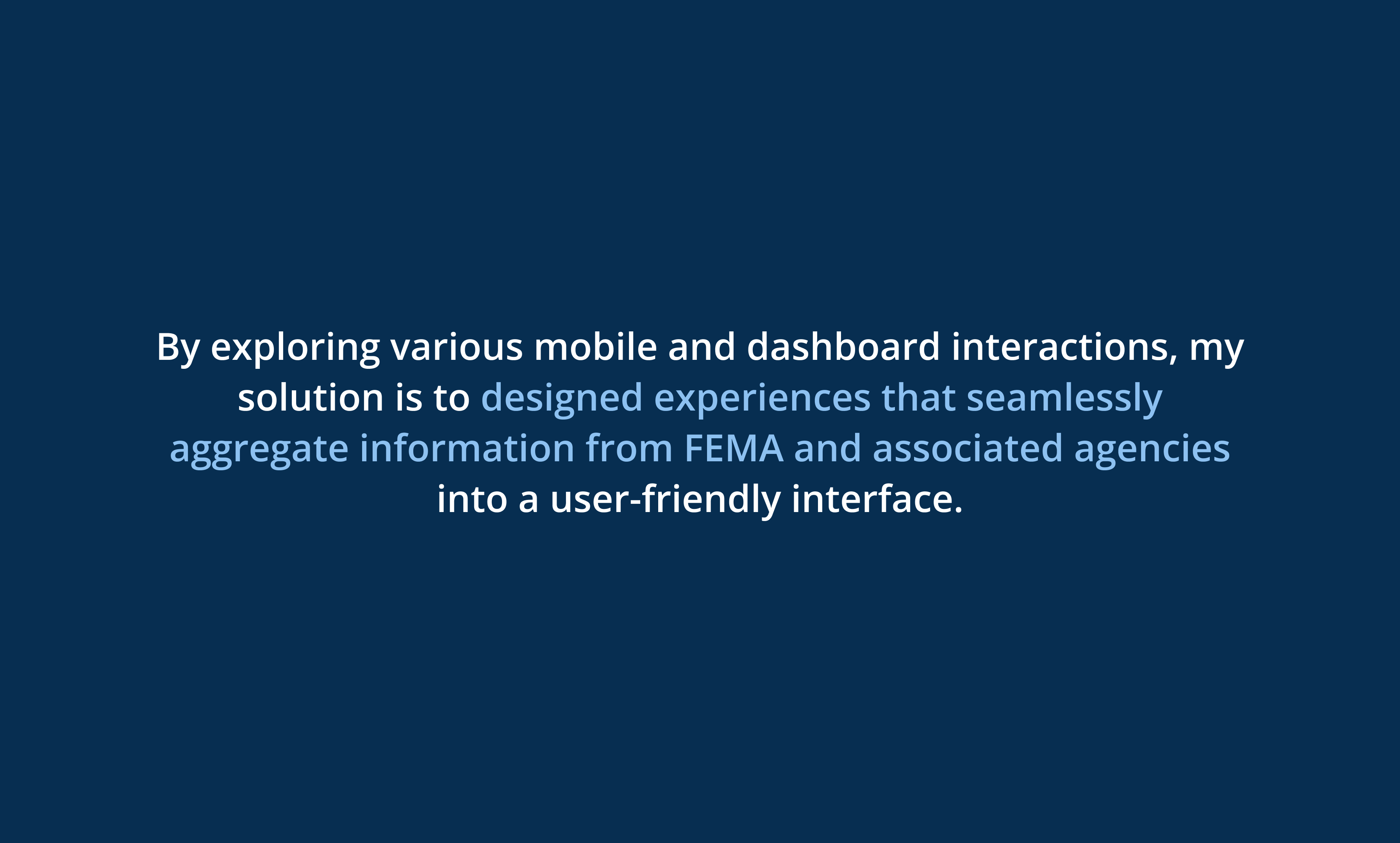Through exploring various mobile and dashboard interactions, I designed user-friendly interfaces that seamlessly aggregate information from FEMA and associated agencies. These interfaces serve two purposes: one for individuals responding to natural disasters, and another for FEMA employees during recovery efforts.