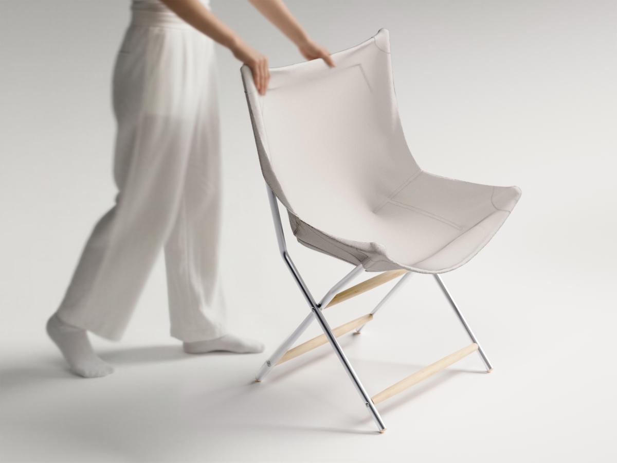 Tabi is a camping chair designed with a focus on sustainability and simplicity. It uses organic cotton fabric and a minimal structure to reduce material complexity and streamline the manufacturing process.