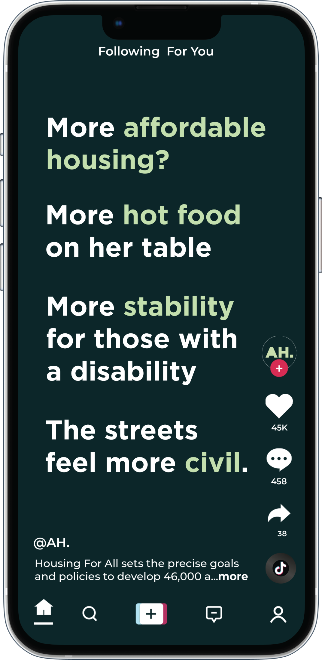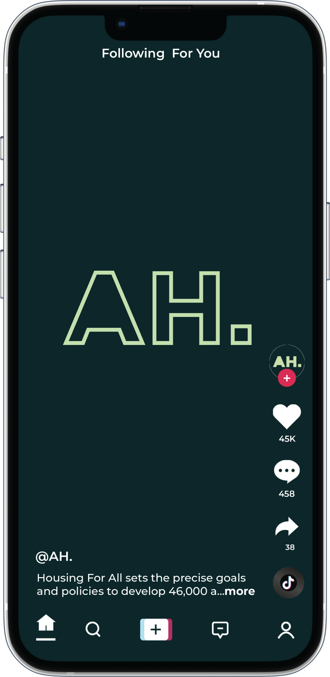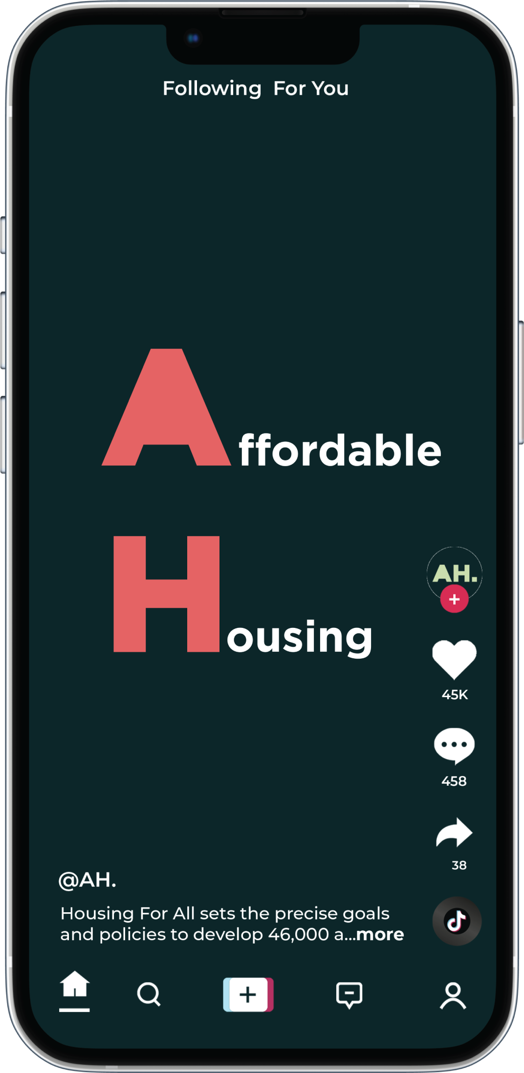 The ‘AH.’ campaign (short for Affordable Housing) is a social media campaign aimed at Generation Z voters in San Francisco. ‘AH.’ introduces San Francisco's recent Housing For All strategy (which expands affordable housing) in a way that resonates with and inspires young voters to support housing policies, thereby boosting Housing For All.