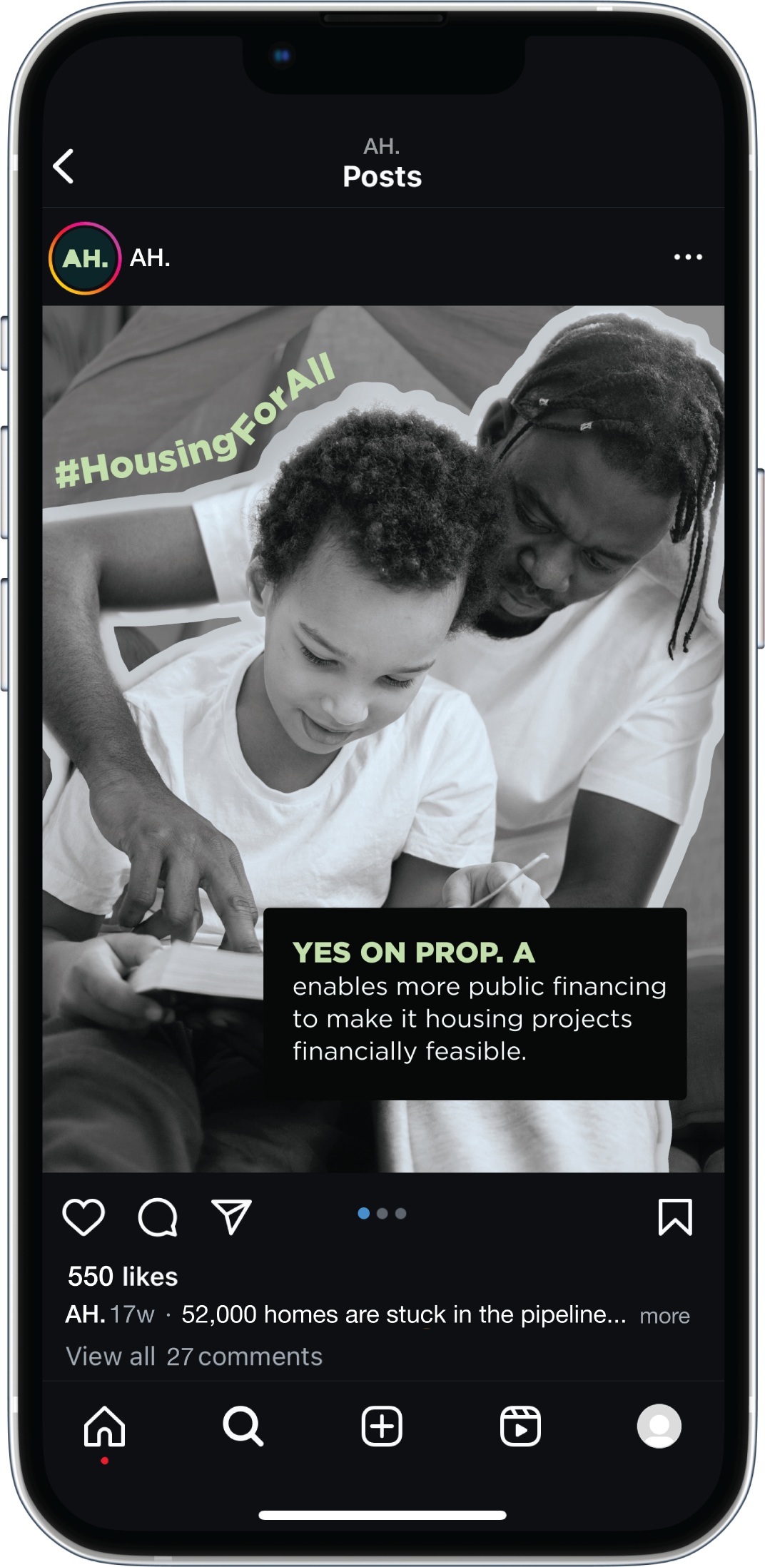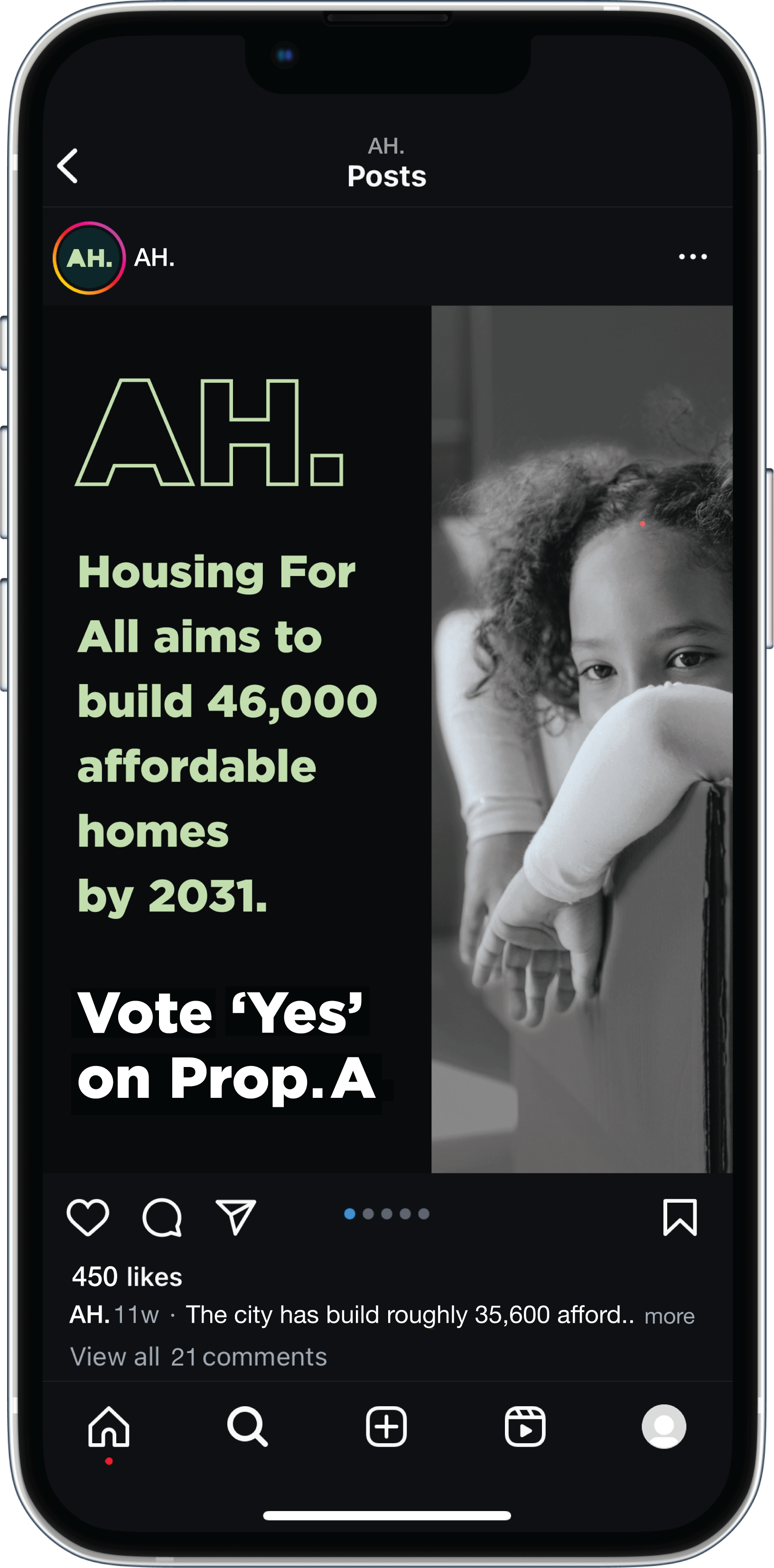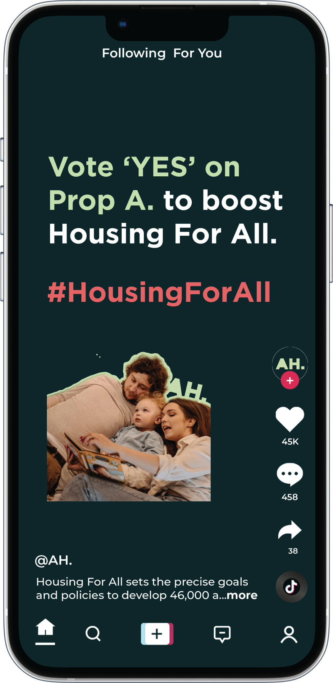 The ‘AH.’ campaign (short for Affordable Housing) is a social media campaign aimed at Generation Z voters in San Francisco. ‘AH.’ introduces San Francisco's recent Housing For All strategy (which expands affordable housing) in a way that resonates with and inspires young voters to support housing policies, thereby boosting Housing For All.