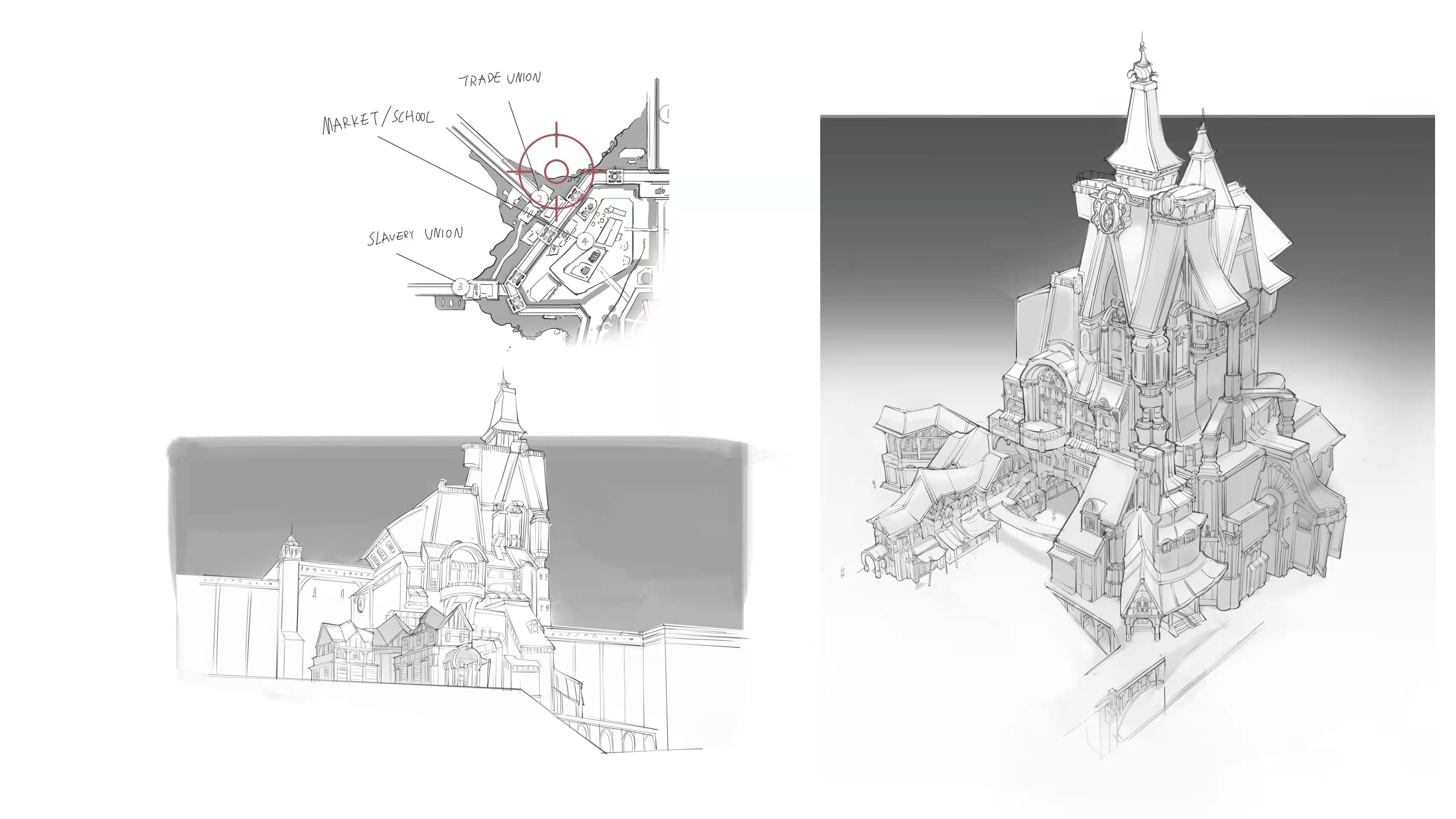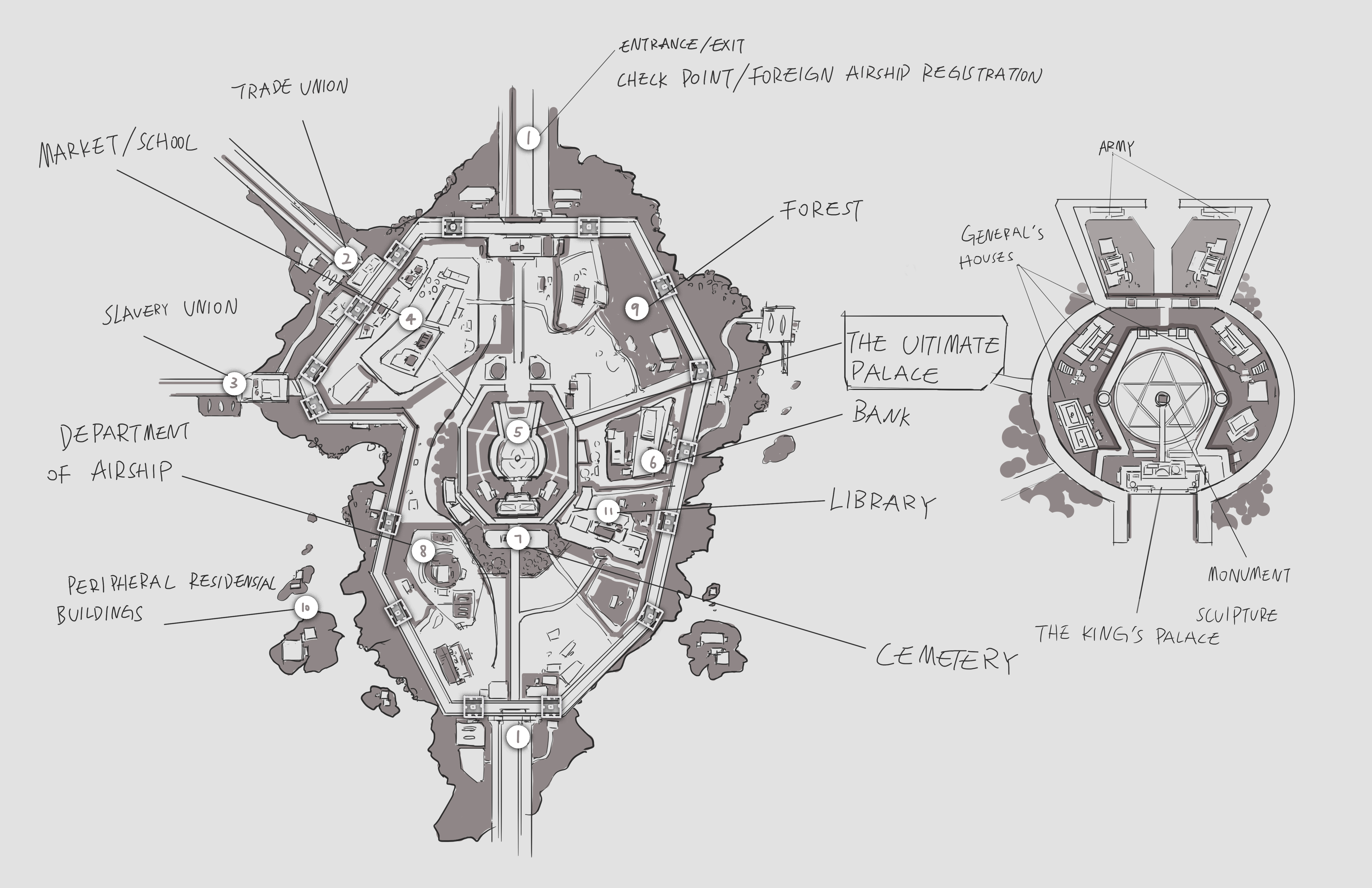 This is a city floating in the air. I designed a map. In the center of the city is the Imperial Palace, and outside the city wall is the trading Union