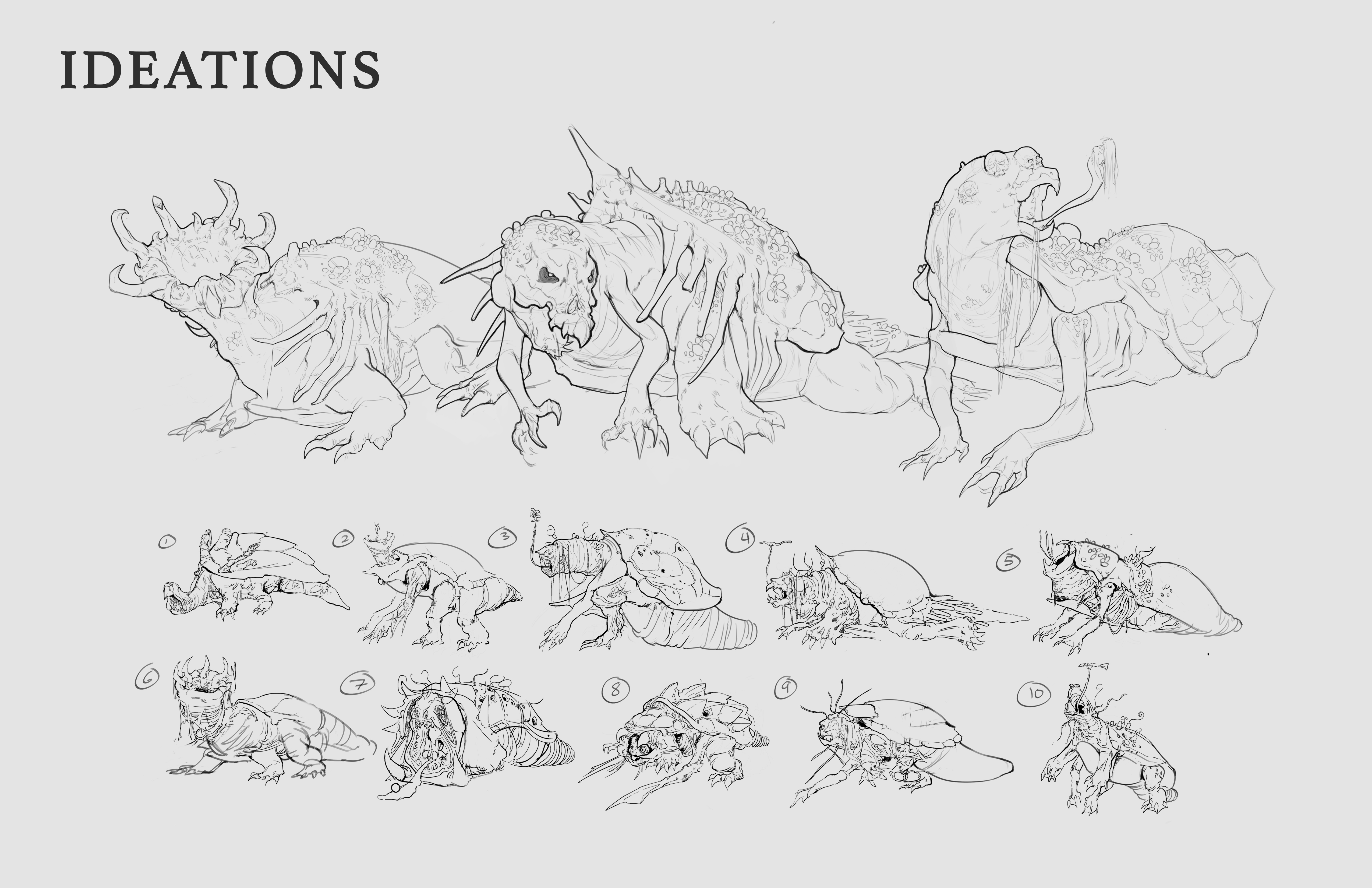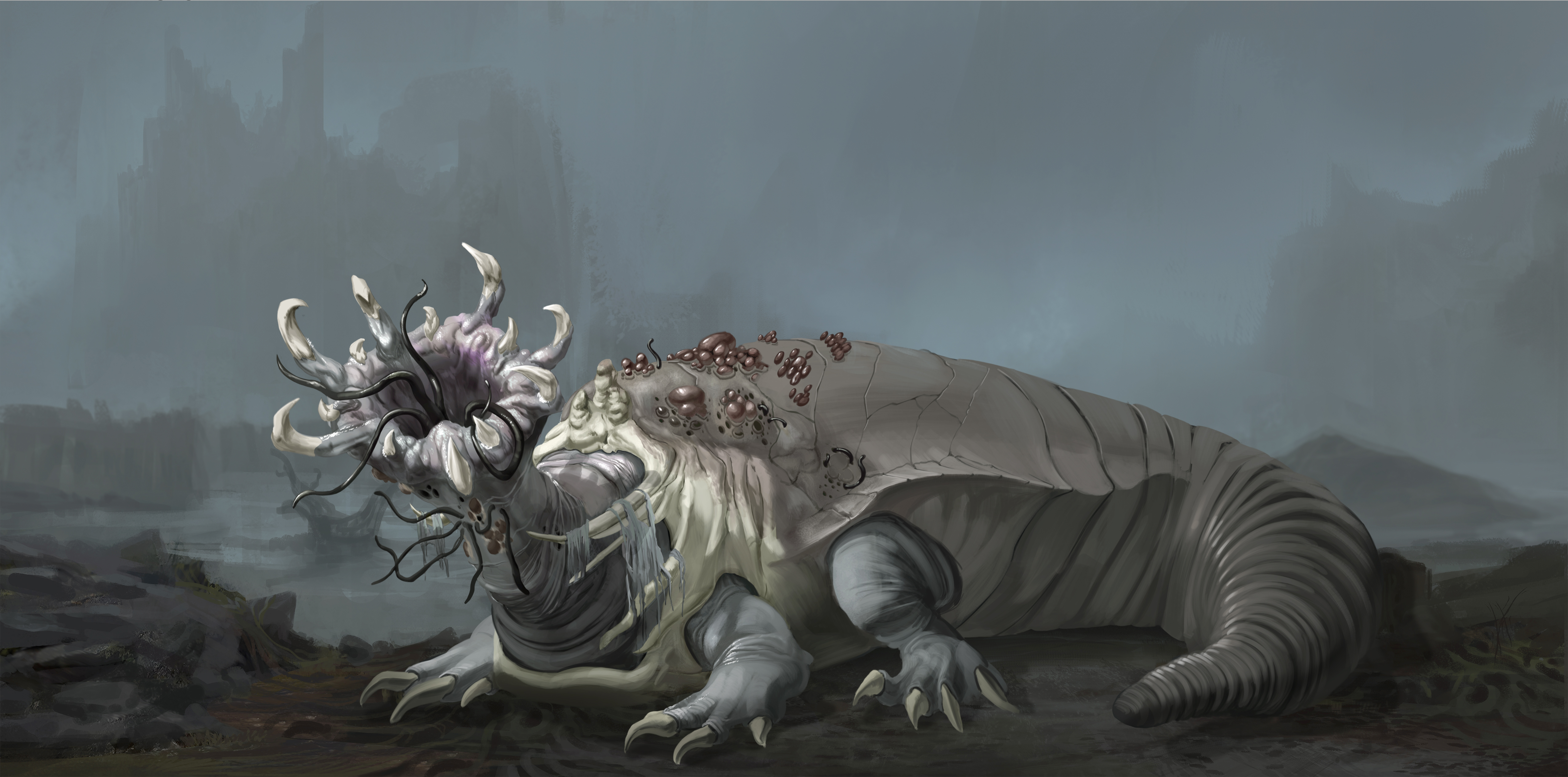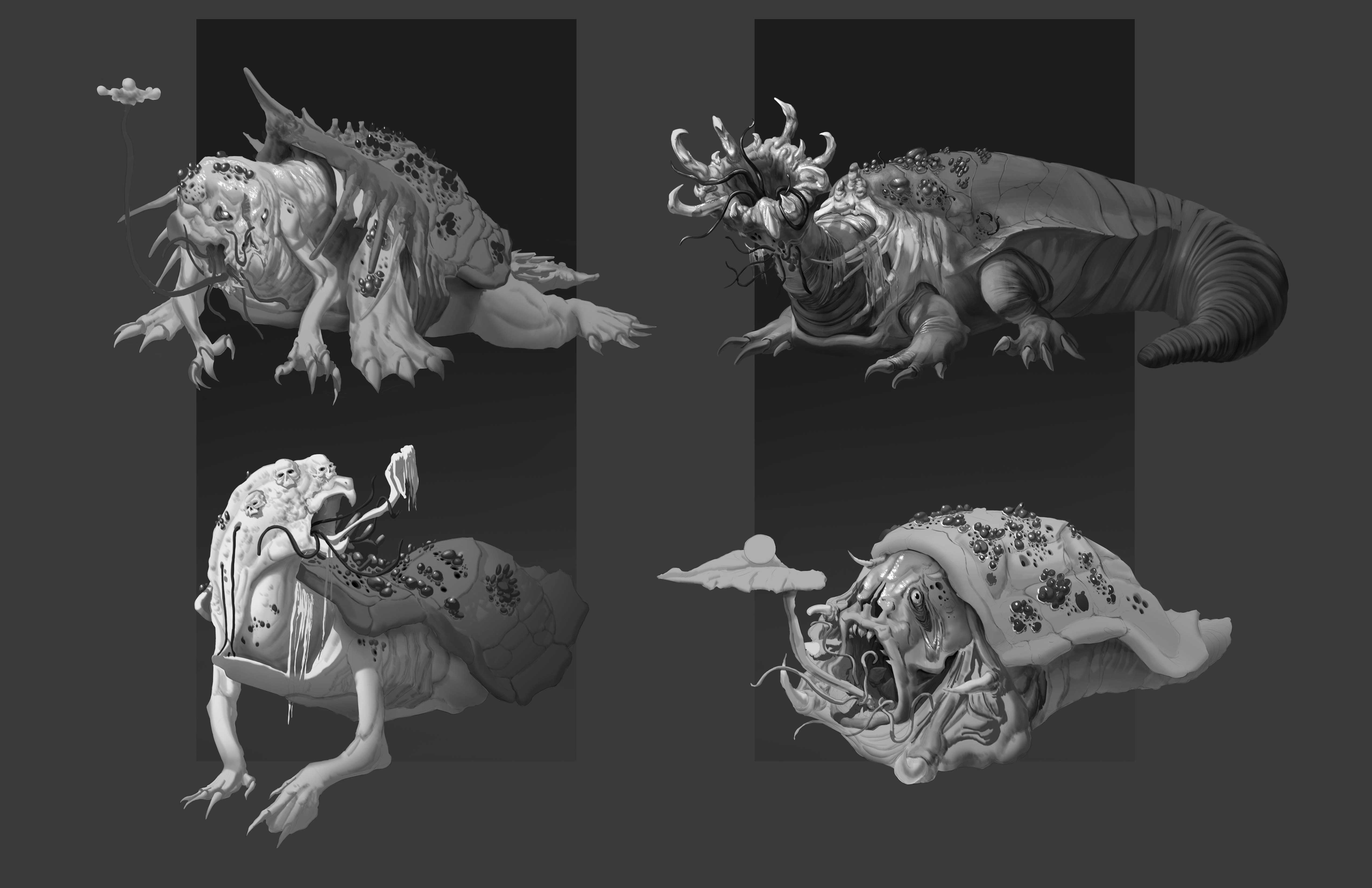 Here is a Creature Design of a Swamp Monster located in an alternate world of hell. A demonic creature lurking in a swamp luring its prey into its ultimate demise. Inspired by the alligator snapping turtle, a leech, and bones. This Creature uses its worm like tongues to lure its victims toward its mouth, occasionally allowing its own offspring eggs as a bait to attract other creatures.