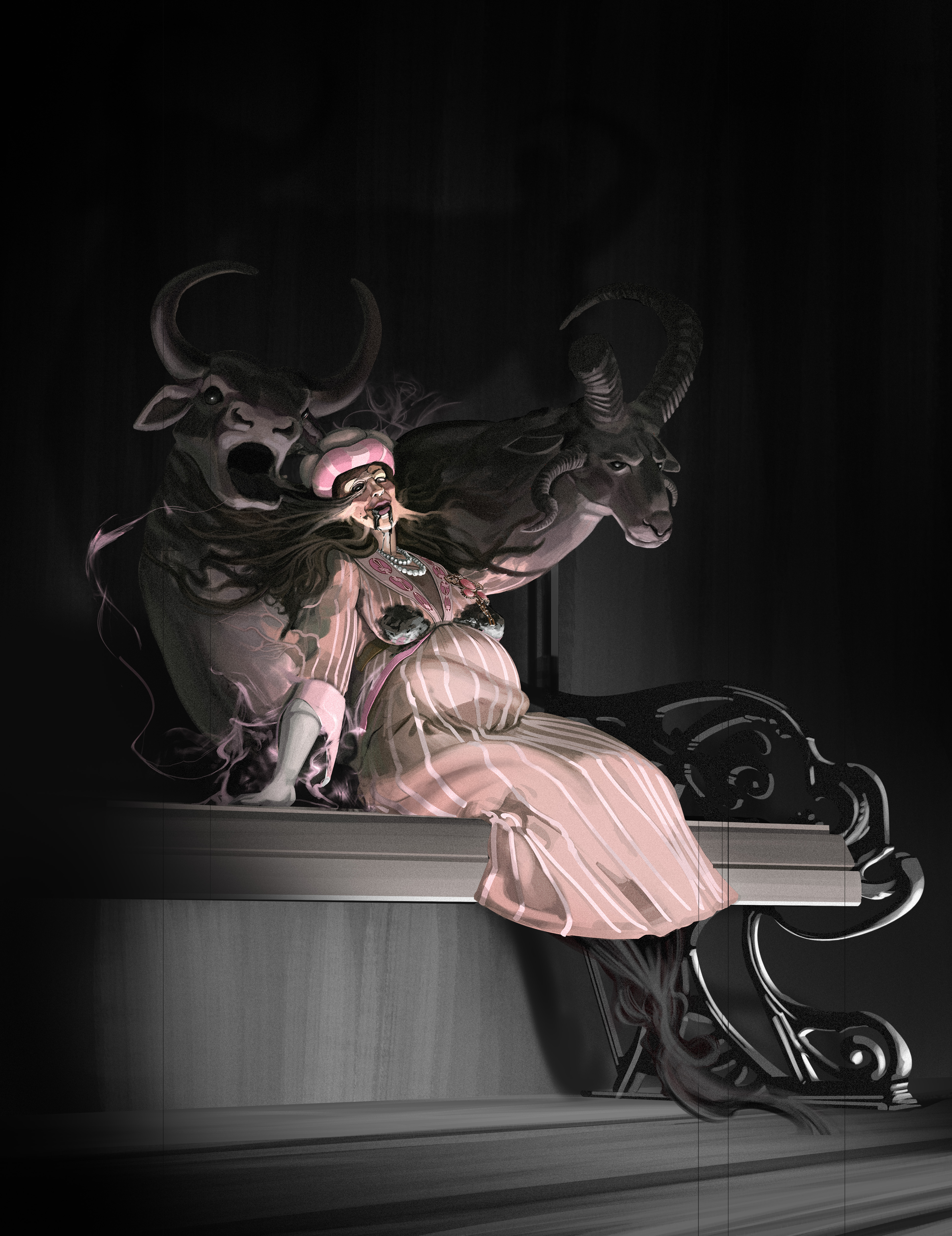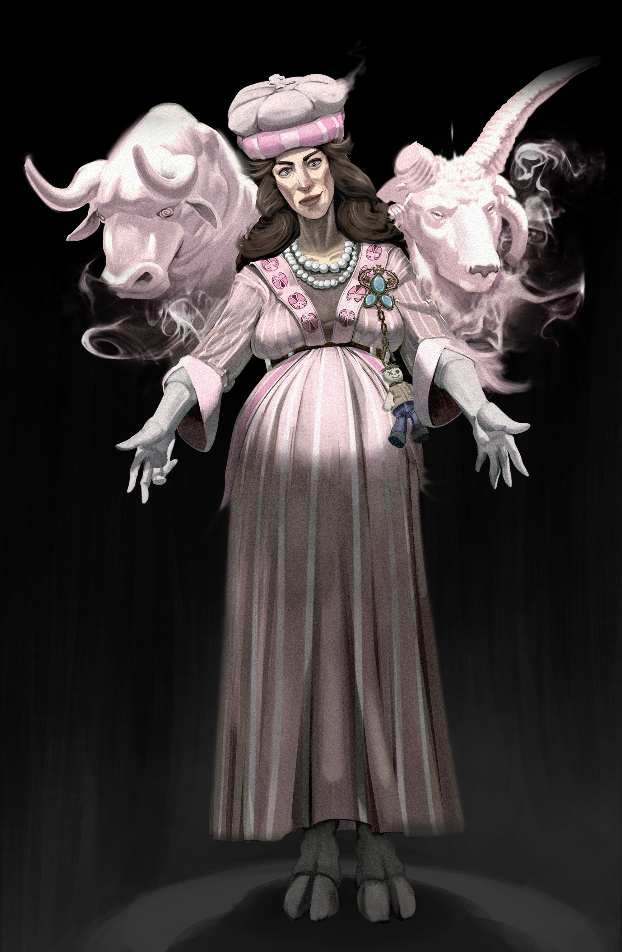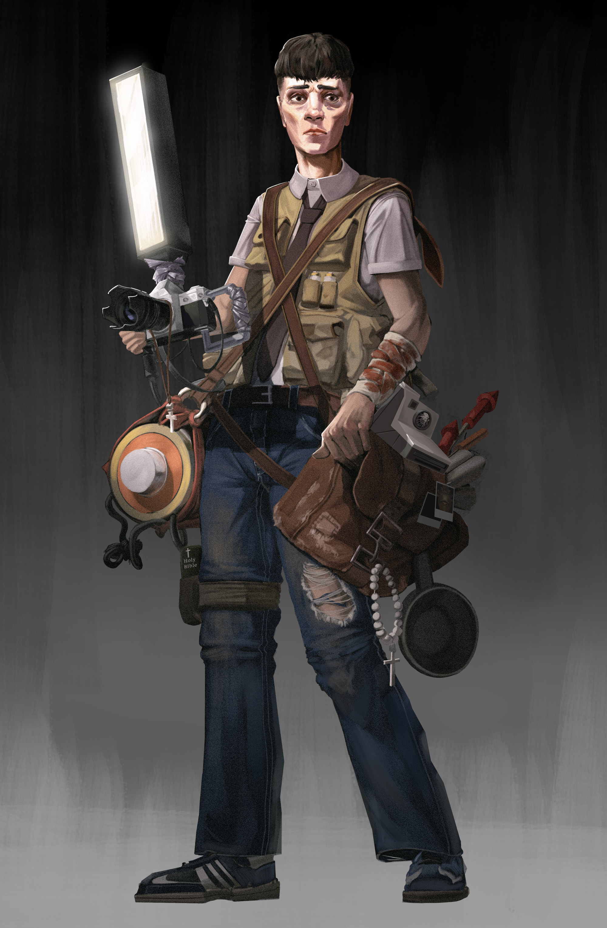 Here are some Character & Creature concept designs for a Christian horror game, taking place in 1981 in England, focusing on the theme of loss, purpose, meaning, redemption, and corruption.
