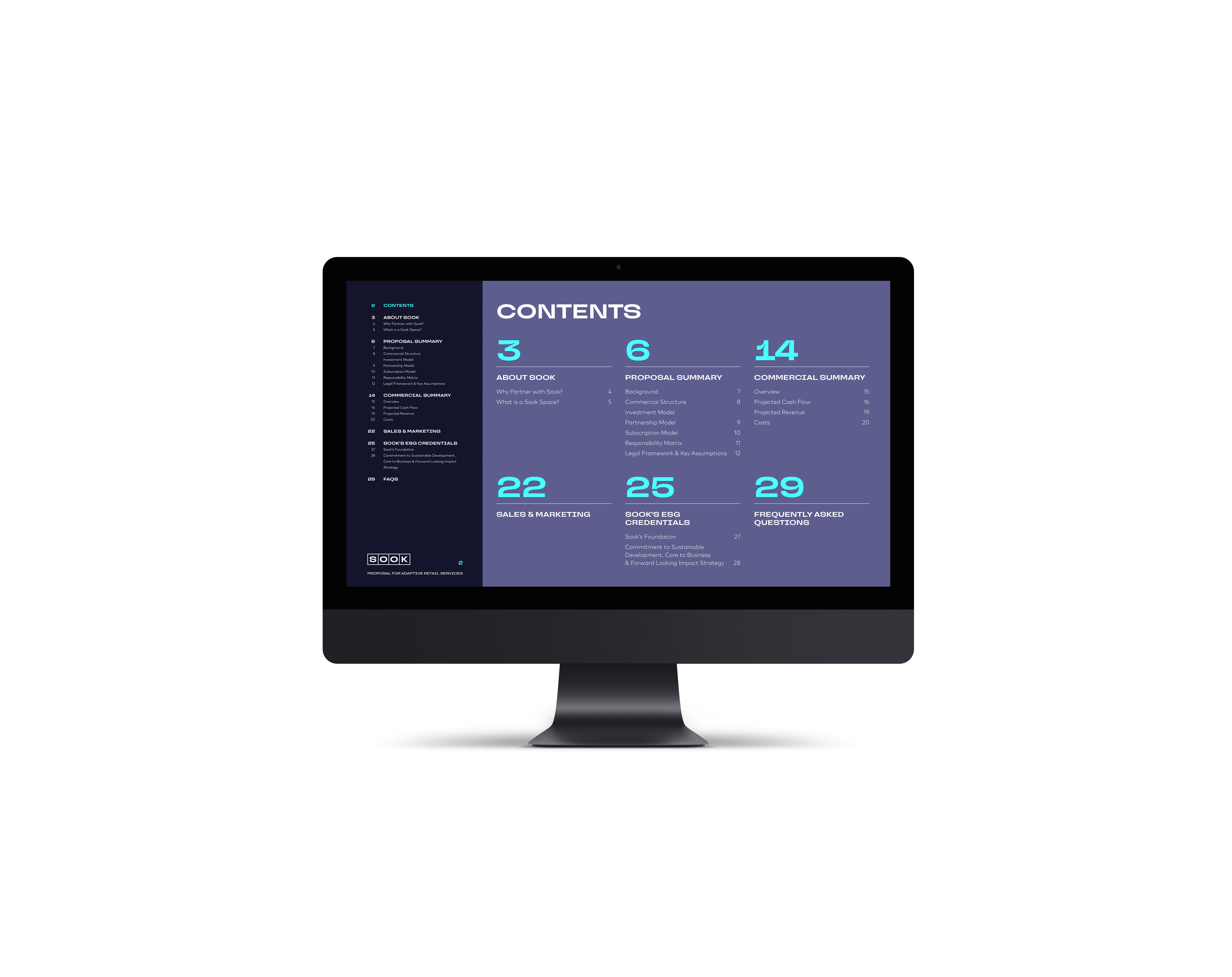 Working with SOOK Spaces, I was given the challenge of an interactive PDF that the company would be sending to prospective landlords in an effort to build business and secure retail spaces on the high streets of London and surrounding UK metropolitan areas. Their current presentations were raw Google docs that lacked professionalism and presentation.