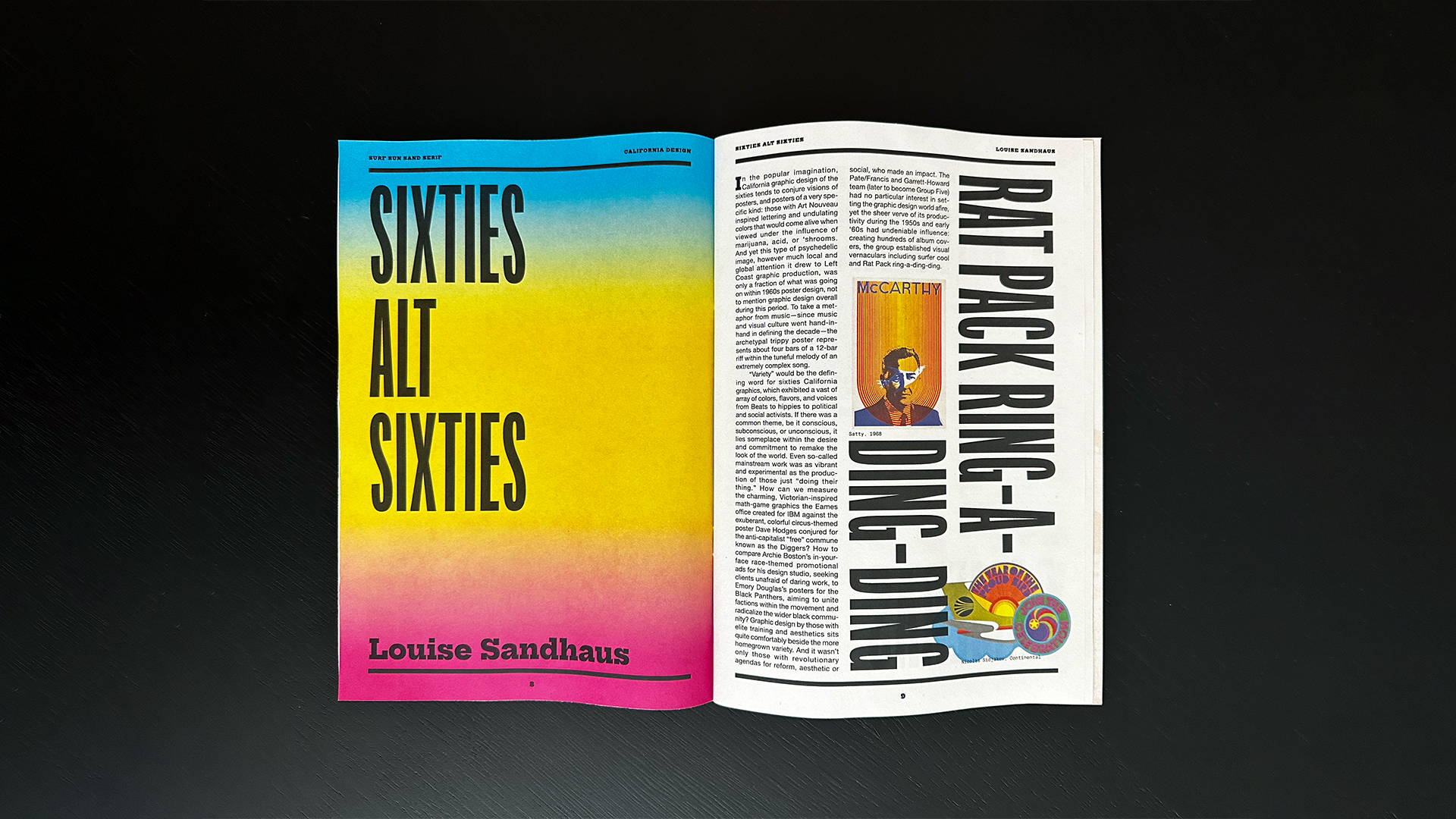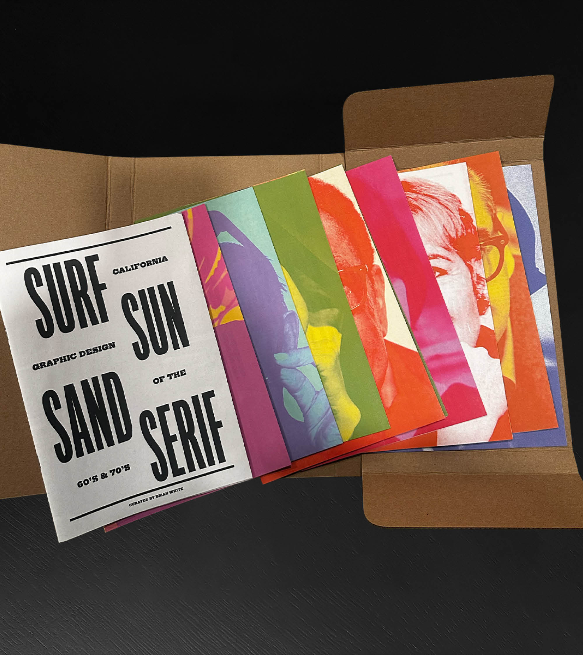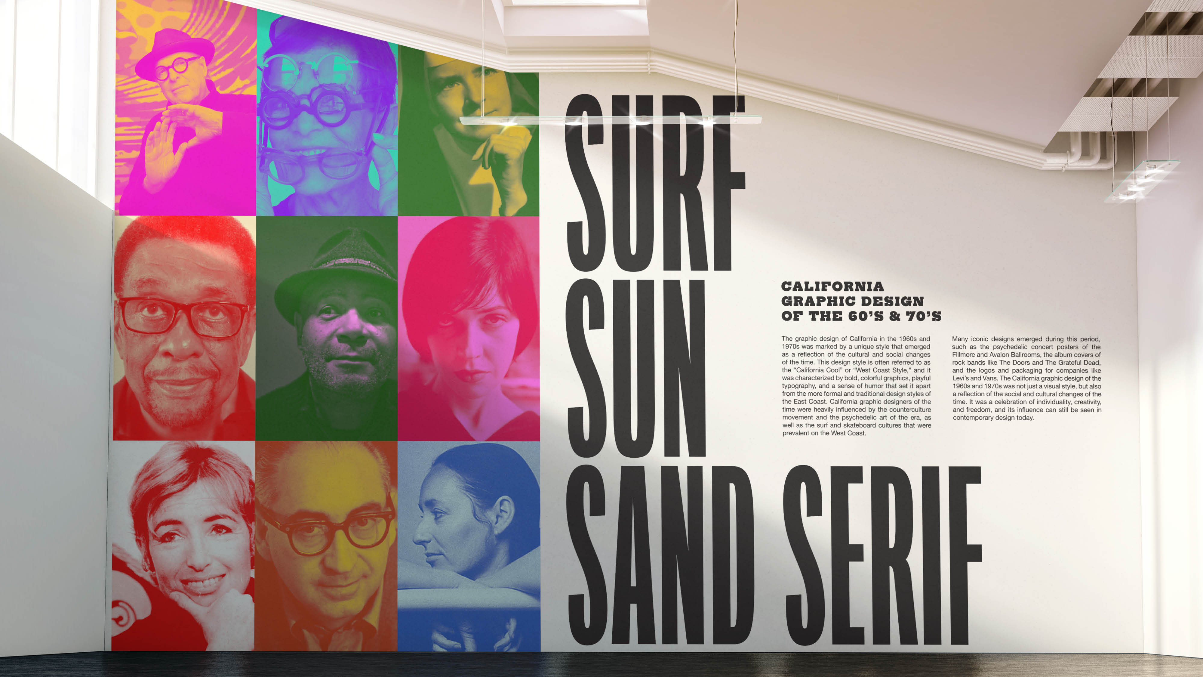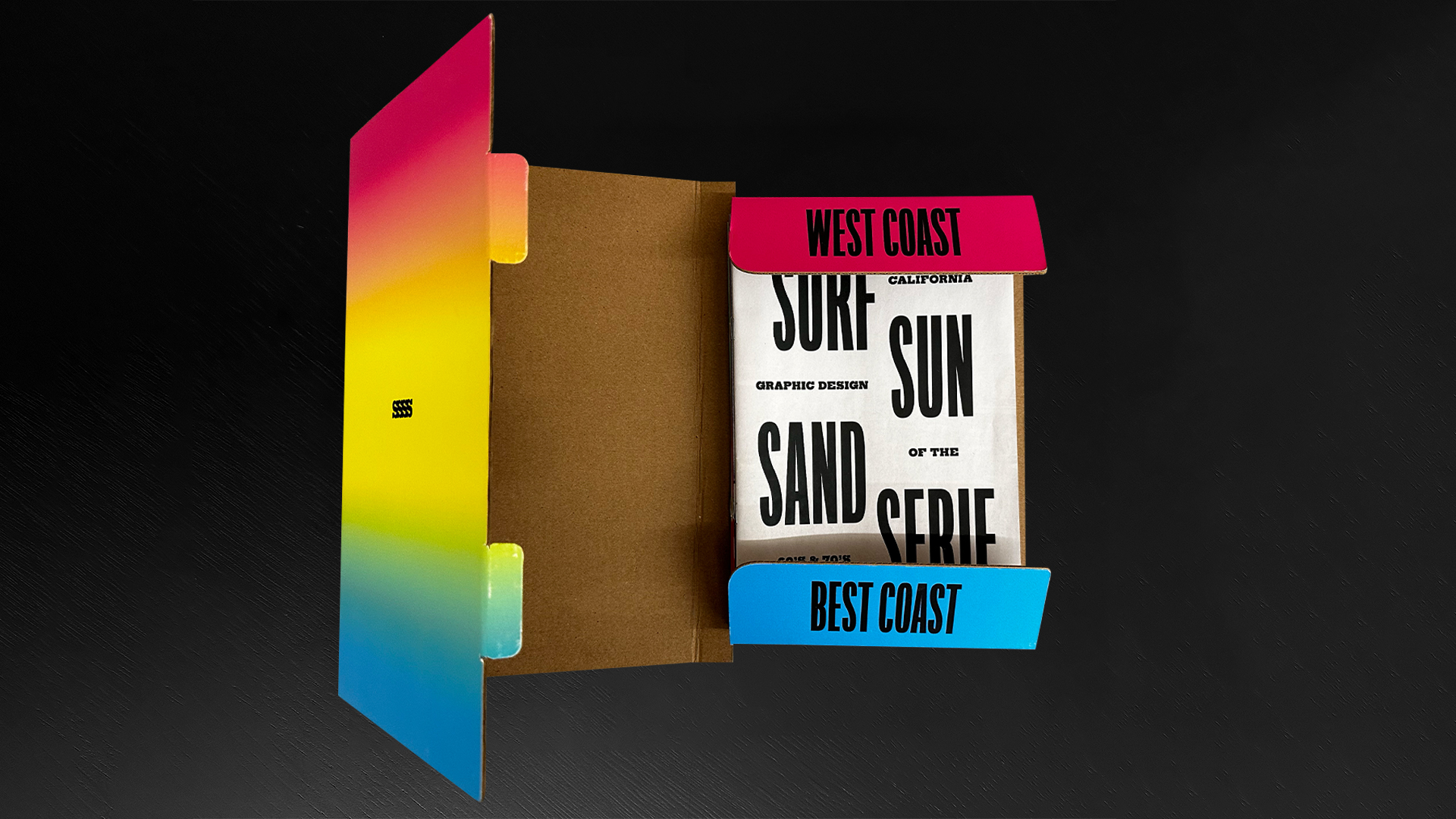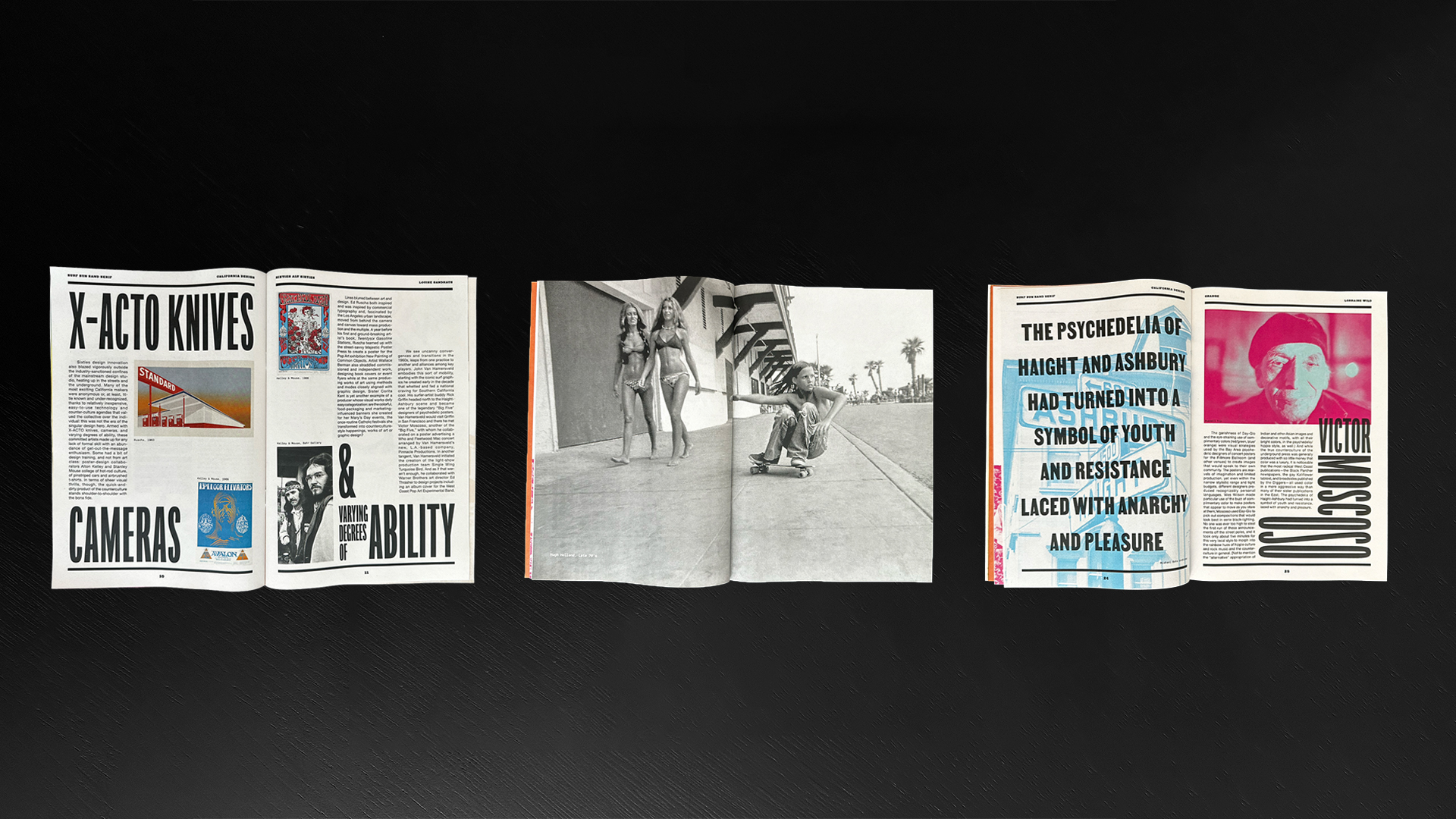 A conceptual journey through the golden era of California graphic design in the 1960s and 70s, Surf Sun Sand Serif is a celebration of the visionary graphic designers who defined the West Coast standard through creativity and coastal culture. The “book” is designed to be a part of a theoretical gallery show hosted by the Los Angeles County Museum of Art. All content is from Louise Sandhaus’ Earthquakes, Mudslides, Fires & Riots.