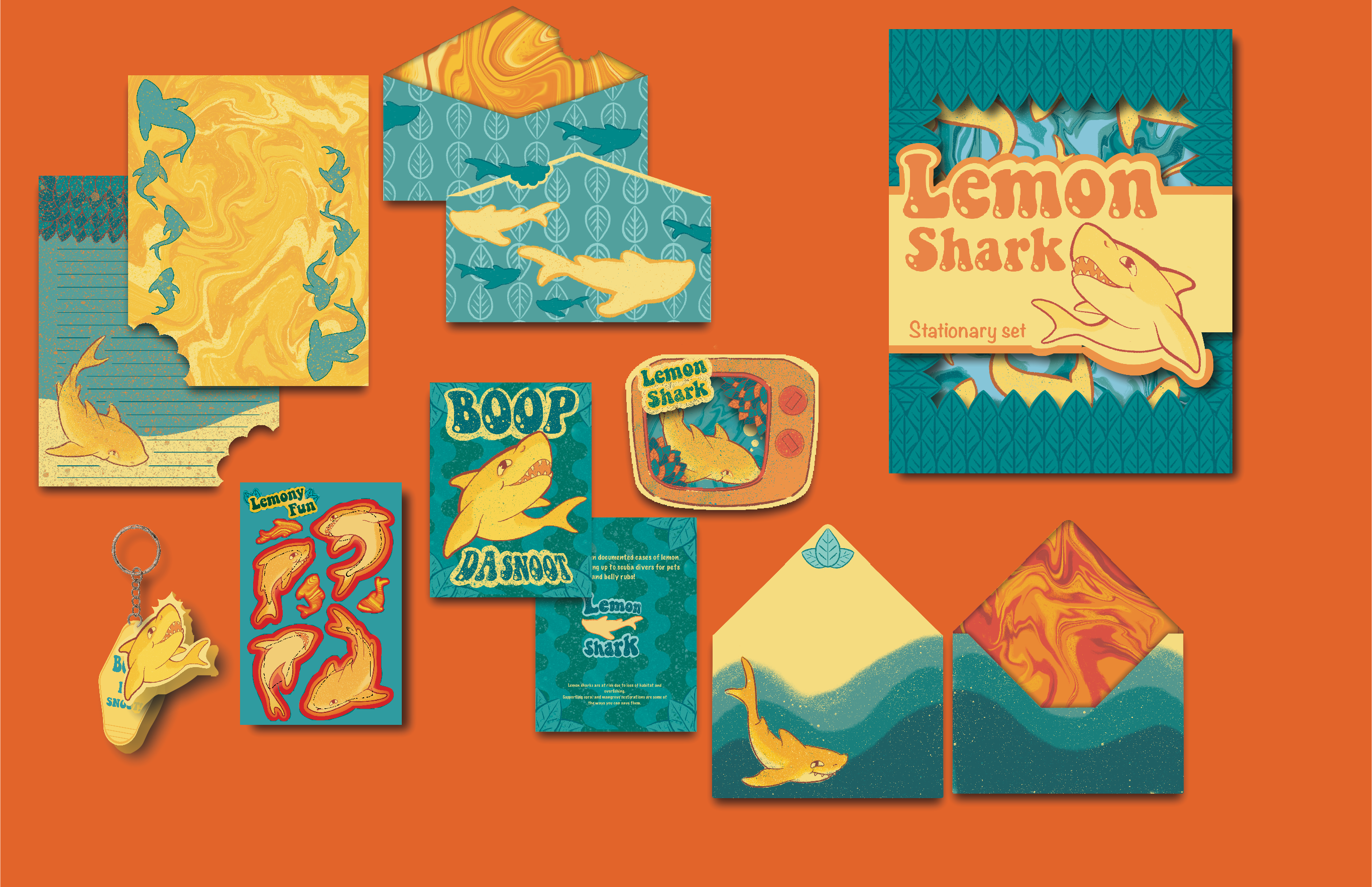 During the last fall I took the Paperchase class run by instructor Yuki Okada as I wanted to expand my illustration skills to physical goods like cards and stickers. For this project the focus was on designing a stationary set for a museum with the focus being animal conservation. I choose the lemon shark and went with my own take on 70's graphic aesthetic.