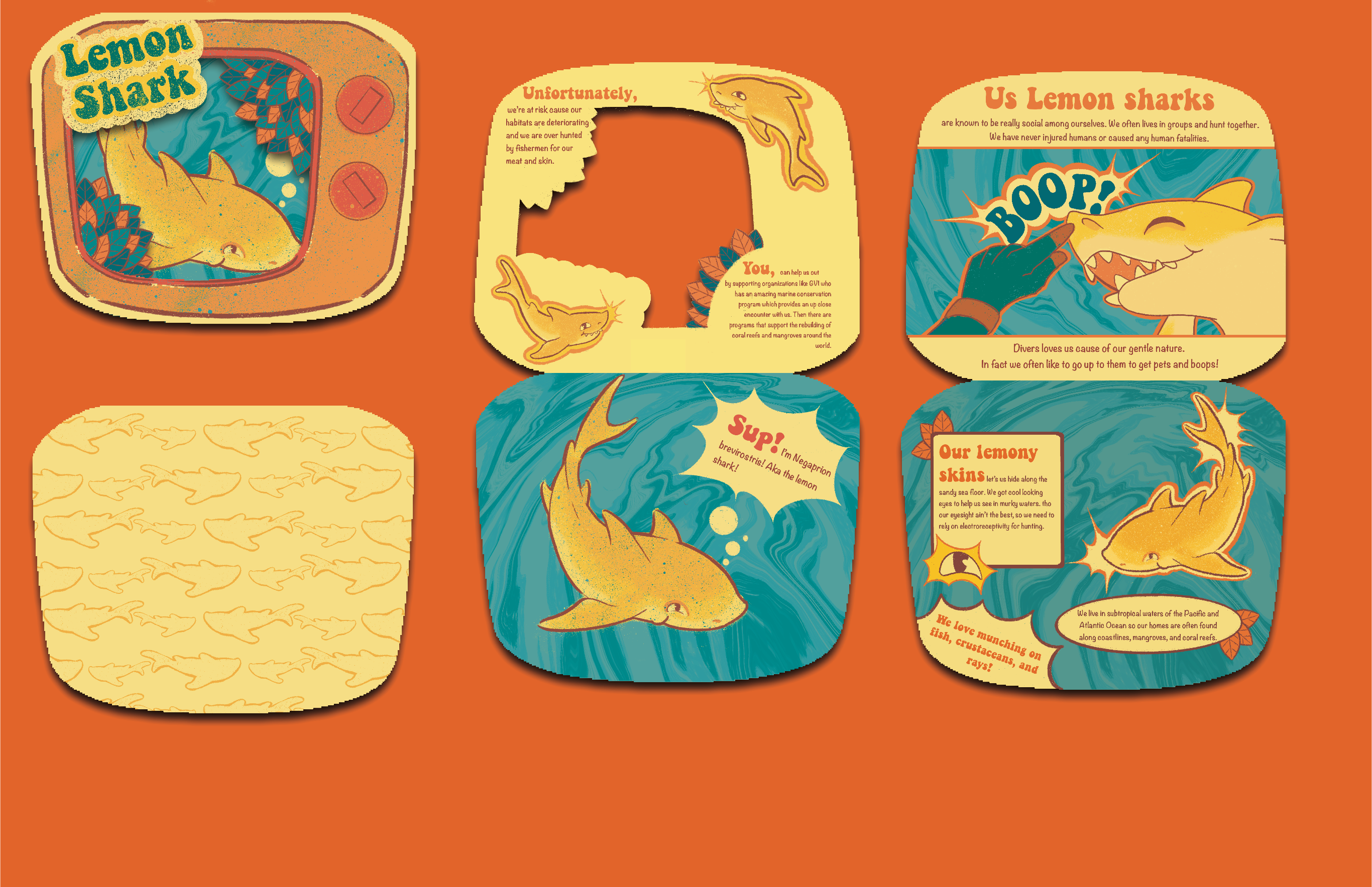 This project helped teach me a lot about how to create digital mockups for a professional presentation. When doing my research I had to ask myself what kind of story am I trying to tell in my editorial, I decided to use 70's design as I wanted to subvert the stigma caused by the 1976 Jaws movie and show the friendly nature of the Lemon Shark.