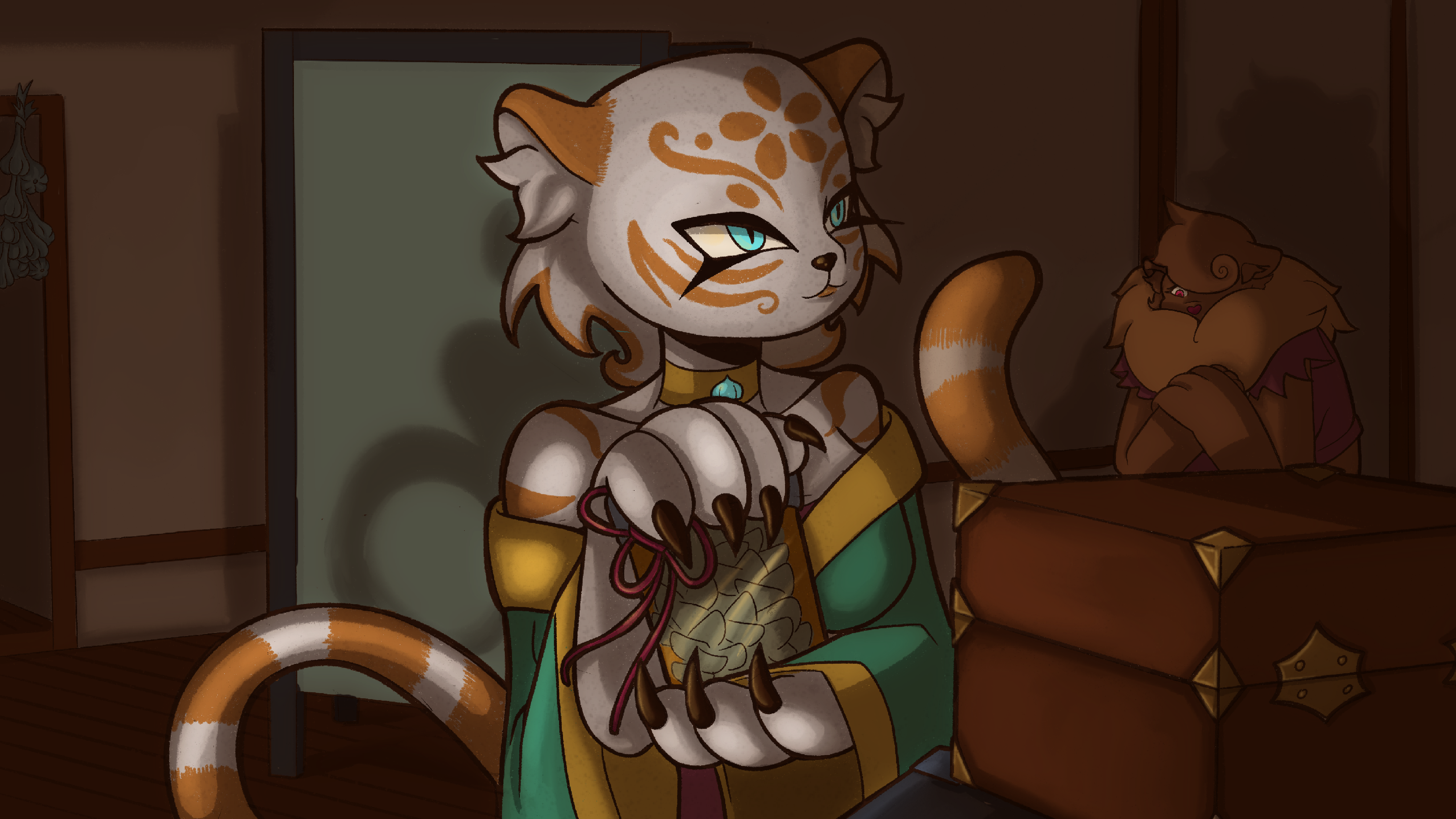 Honey Garlic is a story that asks the question "Is it worth it to hide your true self for the sake of your relationships with others?" The story tells of a bear who falls in love with a small dog but is afraid that her size and strength will scare him off so she goes to a tigress who has the power to make her small.