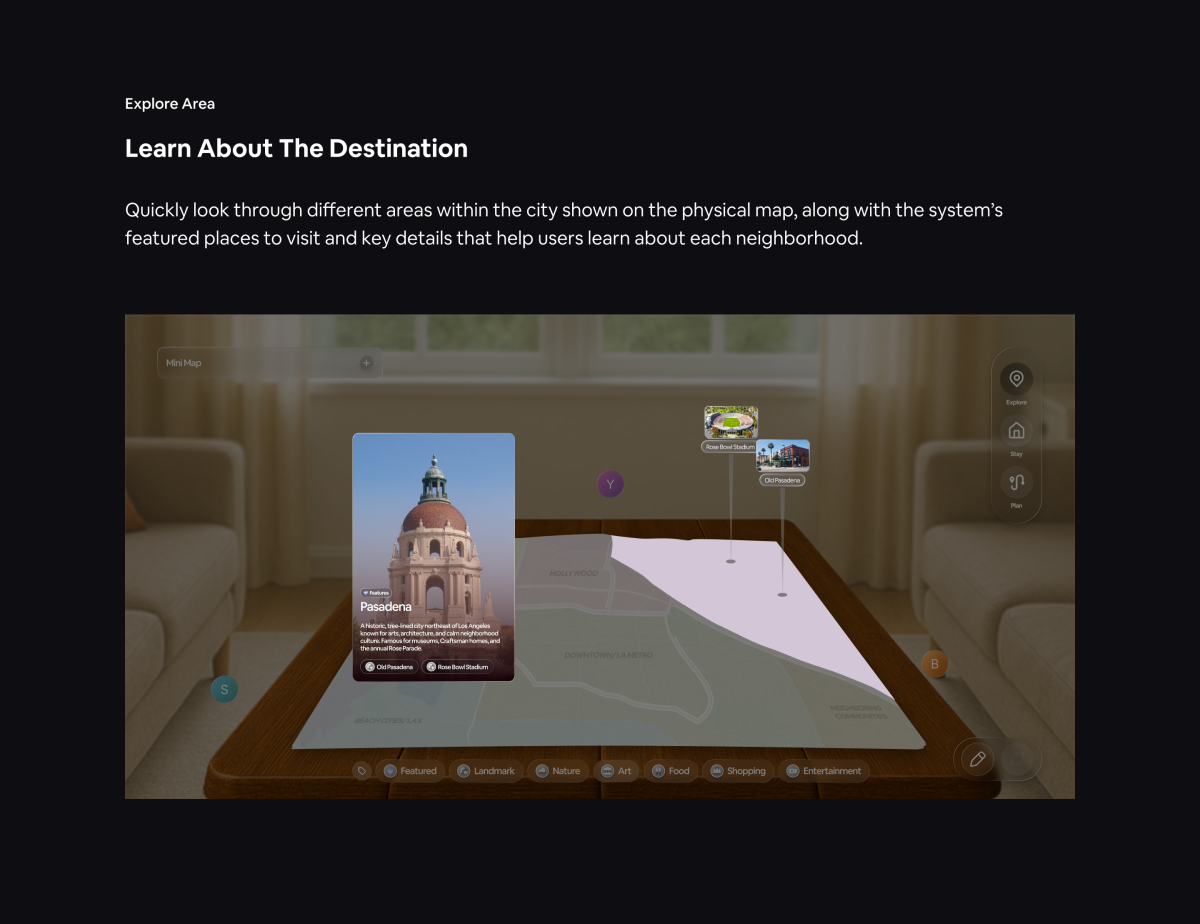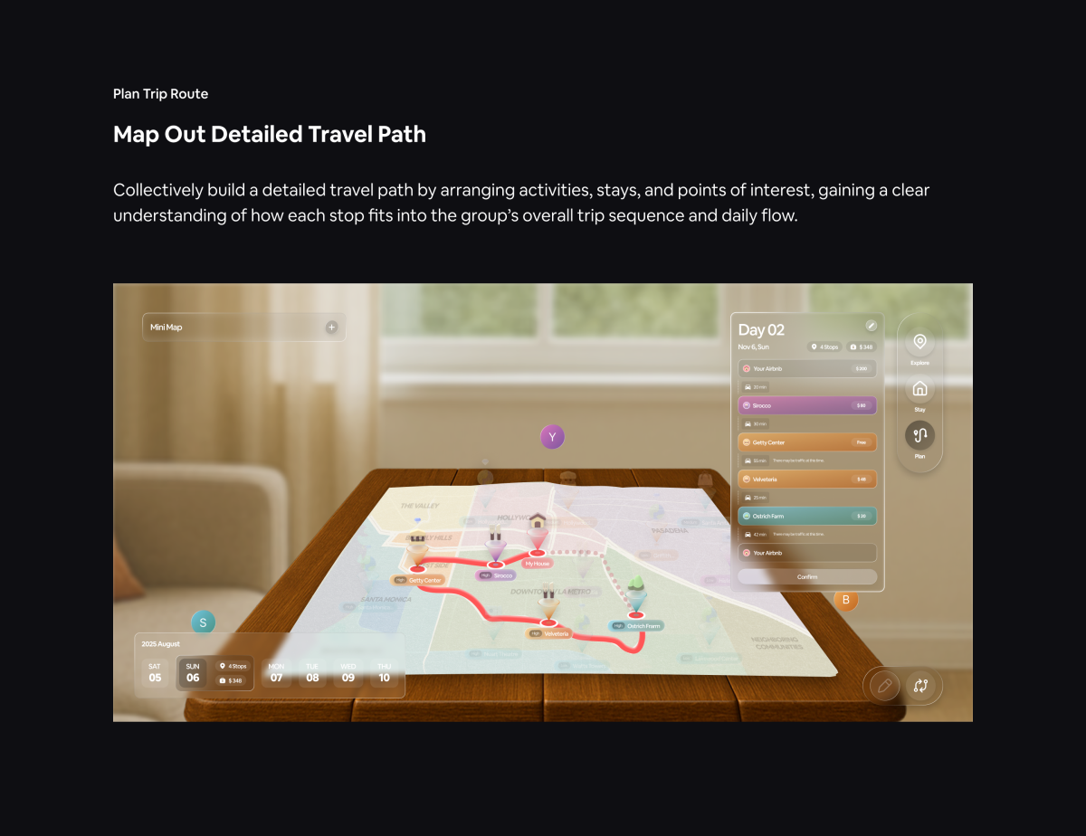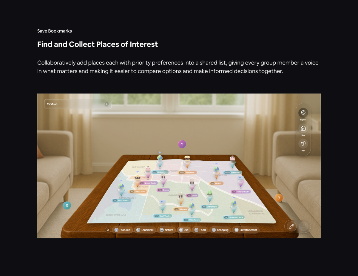 With this question, we saw opportunities to blend physical and digital touch points through immersive augmented reality, making group travel planning more interactive, connected, and human again. We decided to build upon the Airbnb experience and integrate travel planning stages into the platform, utilizing Airbnb’s location datasets to create an engaging spatial format that allows users to explore and understand travel data collaboratively in real time.