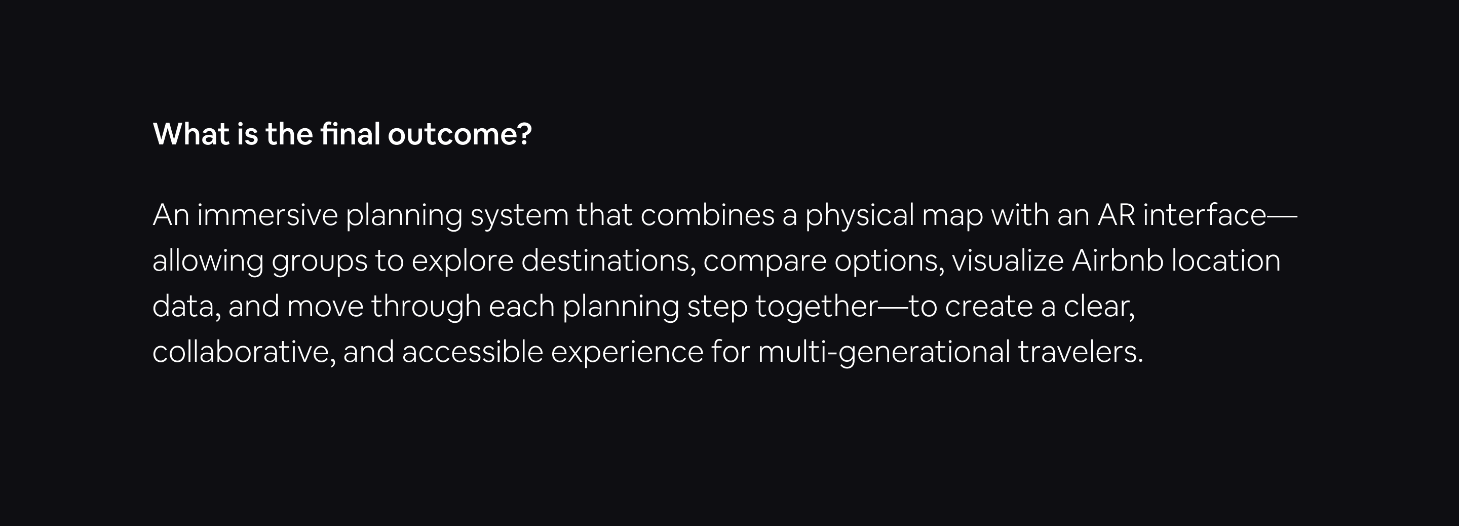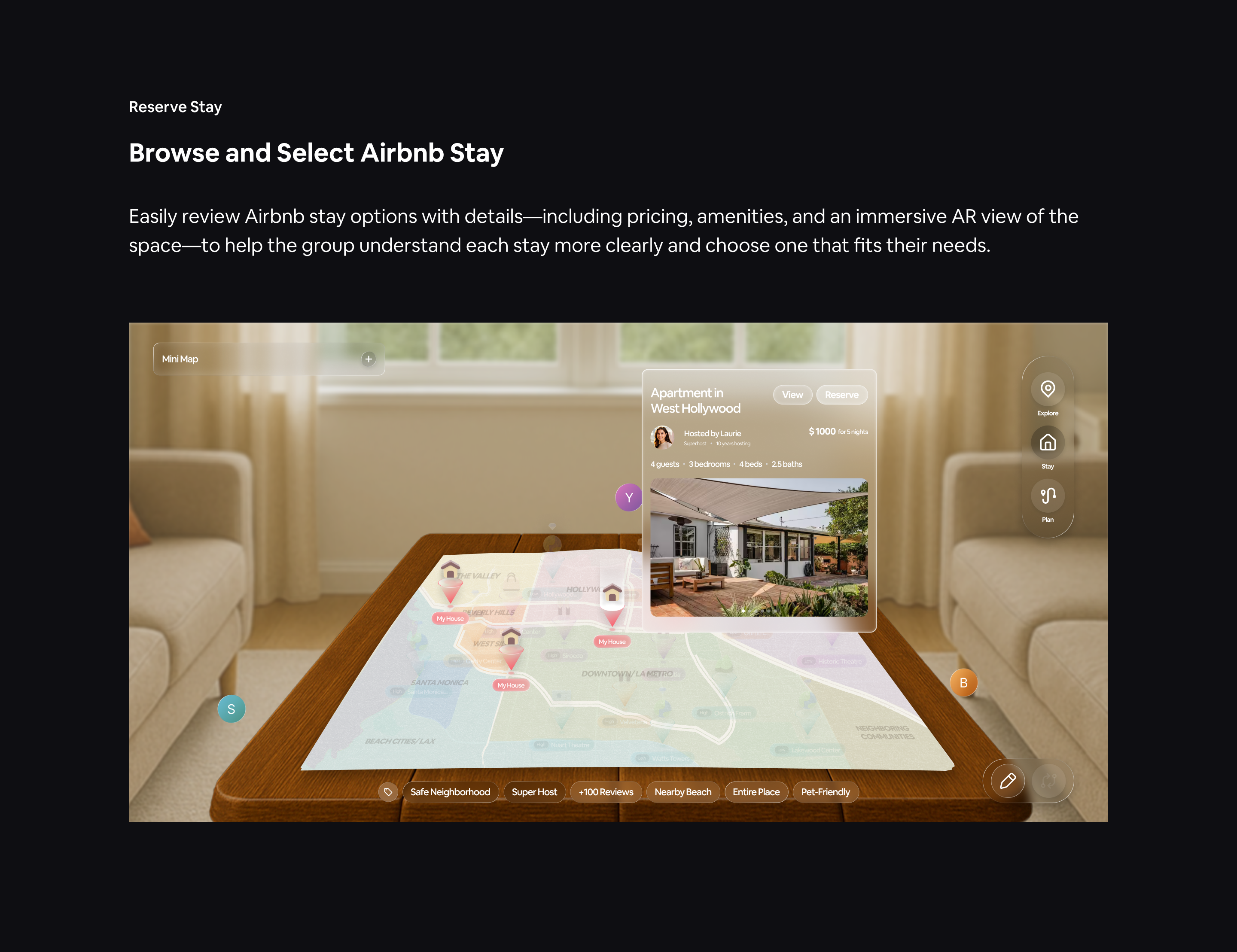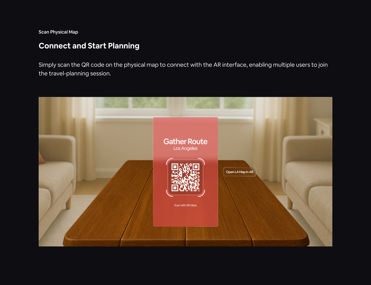 With this question, we saw opportunities to blend physical and digital touch points through immersive augmented reality, making group travel planning more interactive, connected, and human again. We decided to build upon the Airbnb experience and integrate travel planning stages into the platform, utilizing Airbnb’s location datasets to create an engaging spatial format that allows users to explore and understand travel data collaboratively in real time.