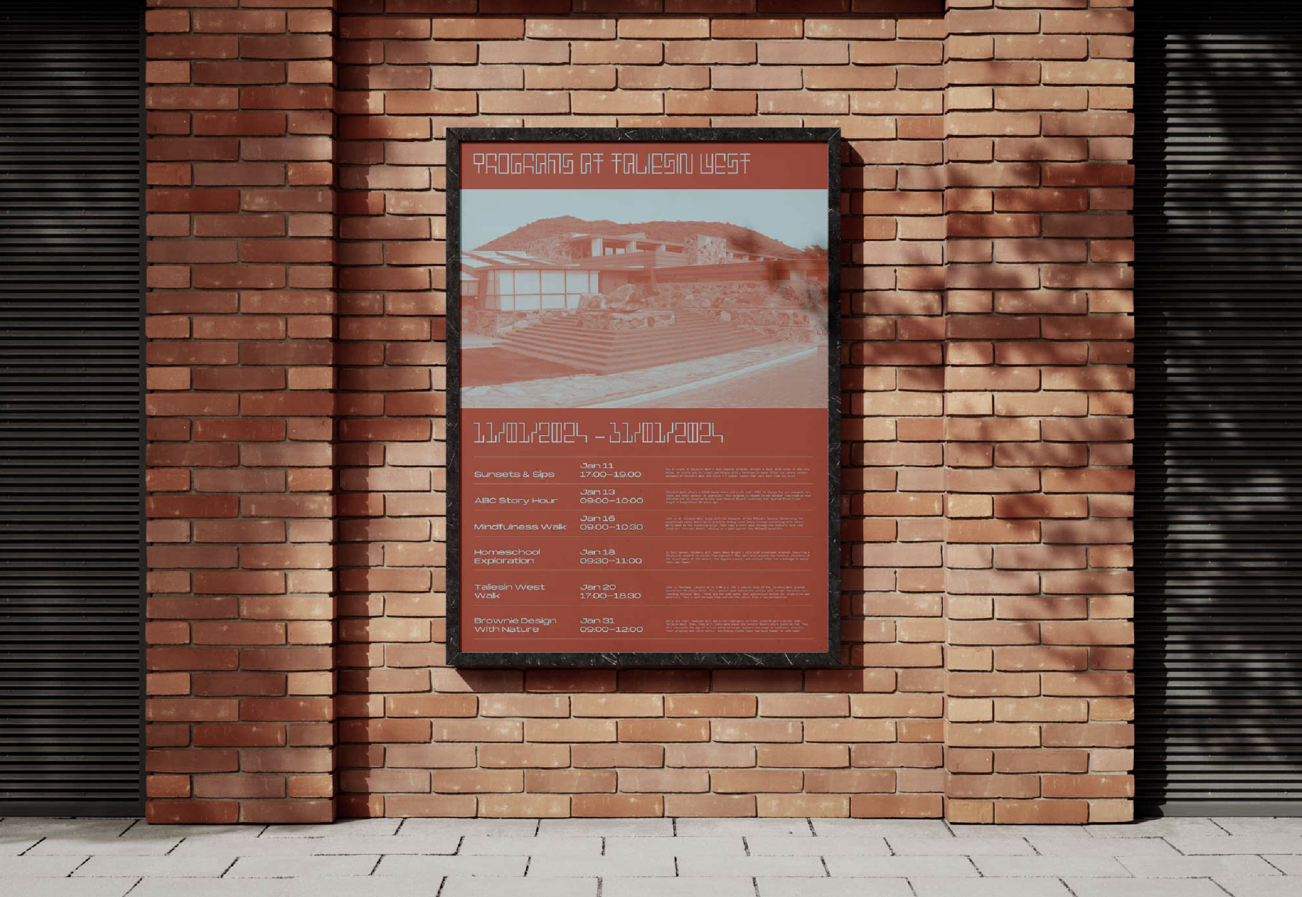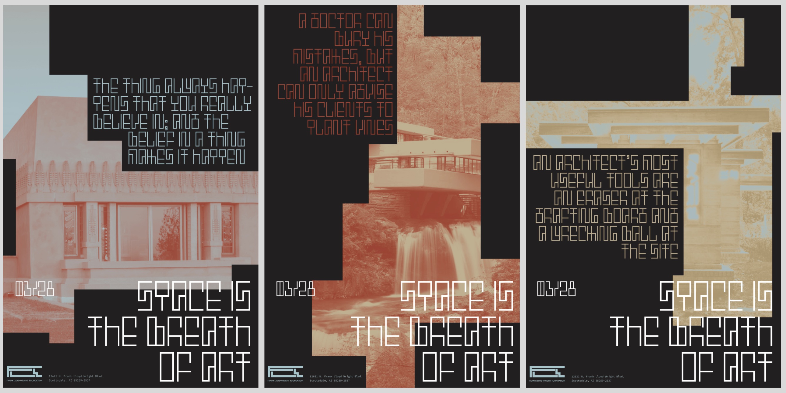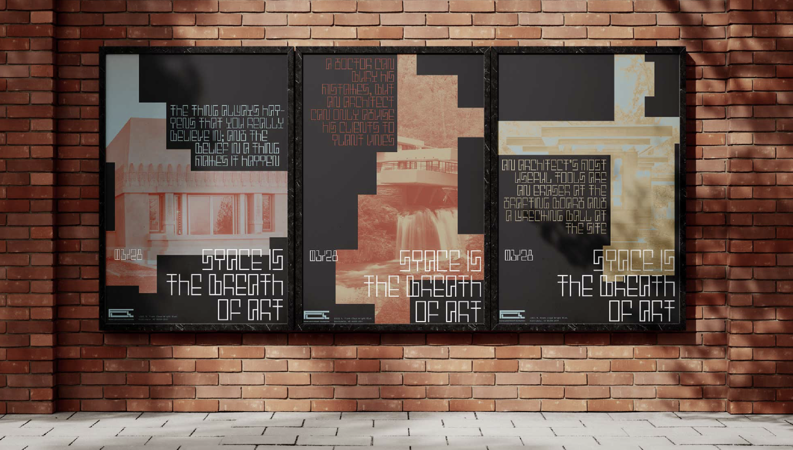 Graduates Select DepartmentBrand Design & StrategyCreative DirectionEntertainment DesignFilmFine ArtFurniture, Lighting and FixturesGraduate ArtGraduate FilmGraduate Graphic DesignGraduate Interaction DesignGraduate Spatial Experience DesignGraphic DesignIllustrationIndustrial DesignInteraction DesignMedia Design PracticesPhotography and ImagingProduct DesignSpatial Experience DesignTransportation DesignTransportation Systems and Design Back to Projects Camille Zhang BFA in Graphic Design — Graphic Design Course: GTRA-303 Type 5: Transmedia Frank Lloyd Wright Rebrand This design project reinterprets Frank Lloyd Wright’s architectural principles, merging modern typography with iconic styles to celebrate his legacy through a series of engaging posters. Project Website: https://www.camillezhangdesign.com/frank-lloyd-wright Image Image Image Image Image Image Image