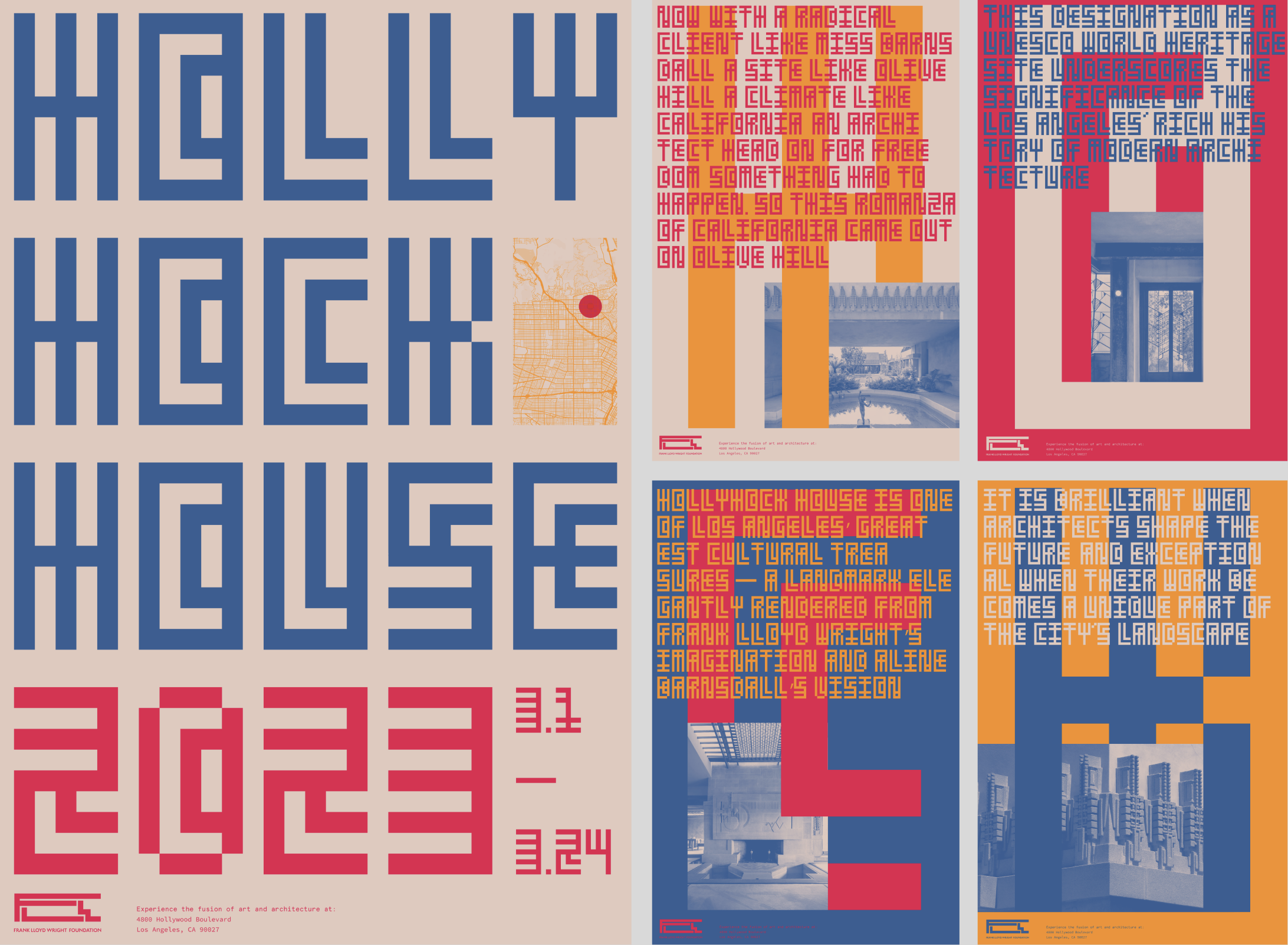 This project highlights Hollyhock House’s unique architecture, employing modular typography and distinct color schemes to showcase its historical and aesthetic significance in a modern light.