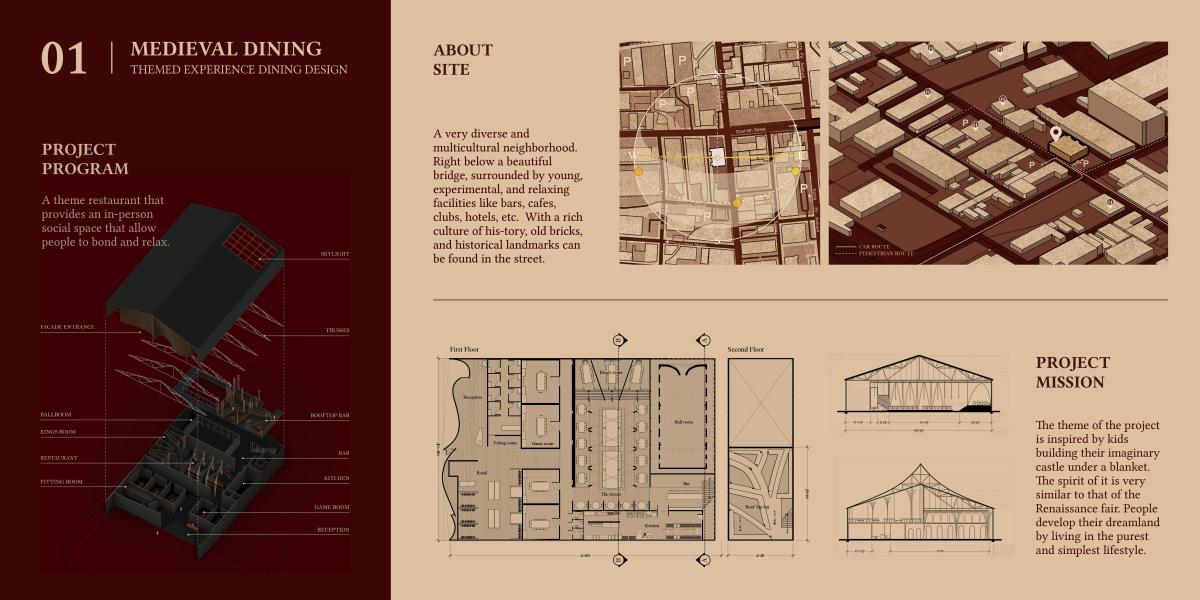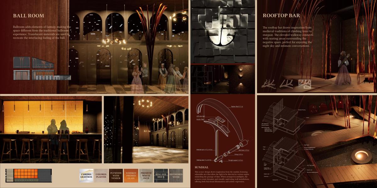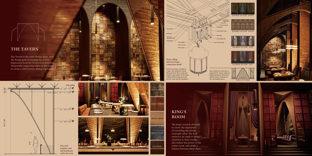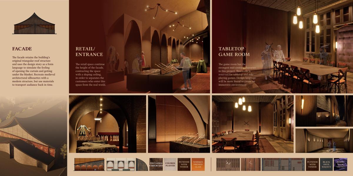 A medieval-themed community venue for Renaissance fair fans, fantasy lovers, and curious newcomers. Combining dining, gaming, retail, ballroom, and rooftop bar, it creates an antique, rustic, and otherworldly setting for connection and self-expression. Through rich materials, immersive layouts, and ties to local events, it offers a safe, welcoming space to bond, explore, and escape into a shared fantasy world.