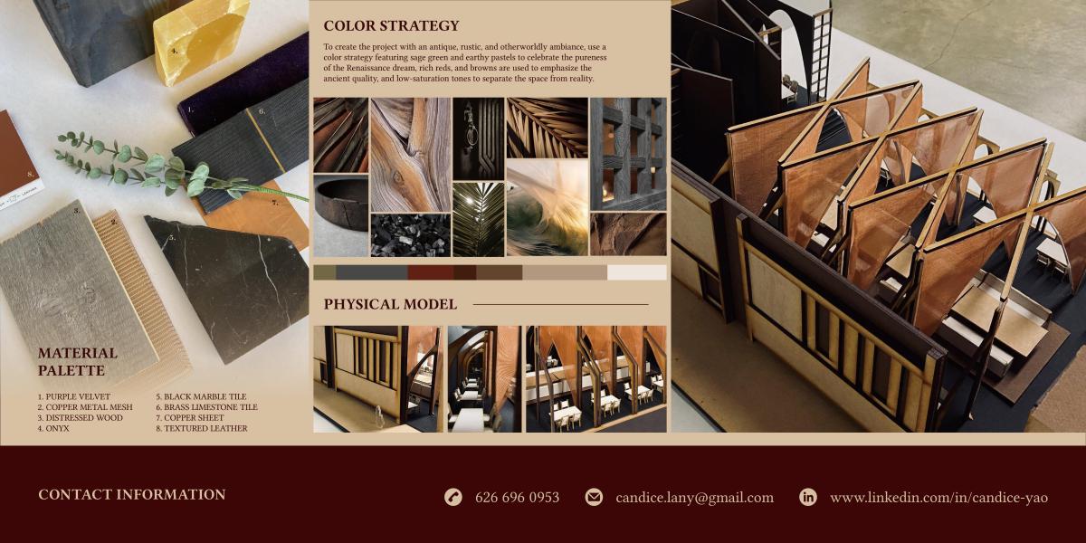 Gained the ability to extract medieval design elements from traditional church structures and reinterpret them with modern materials, creating an impression without direct replication. Learned to design dining and experience spaces by considering varied seating for different roles, contrasting narrow passages with open areas, using layered circulation to evoke exploration, and creating custom lighting to enhance the overall atmosphere.