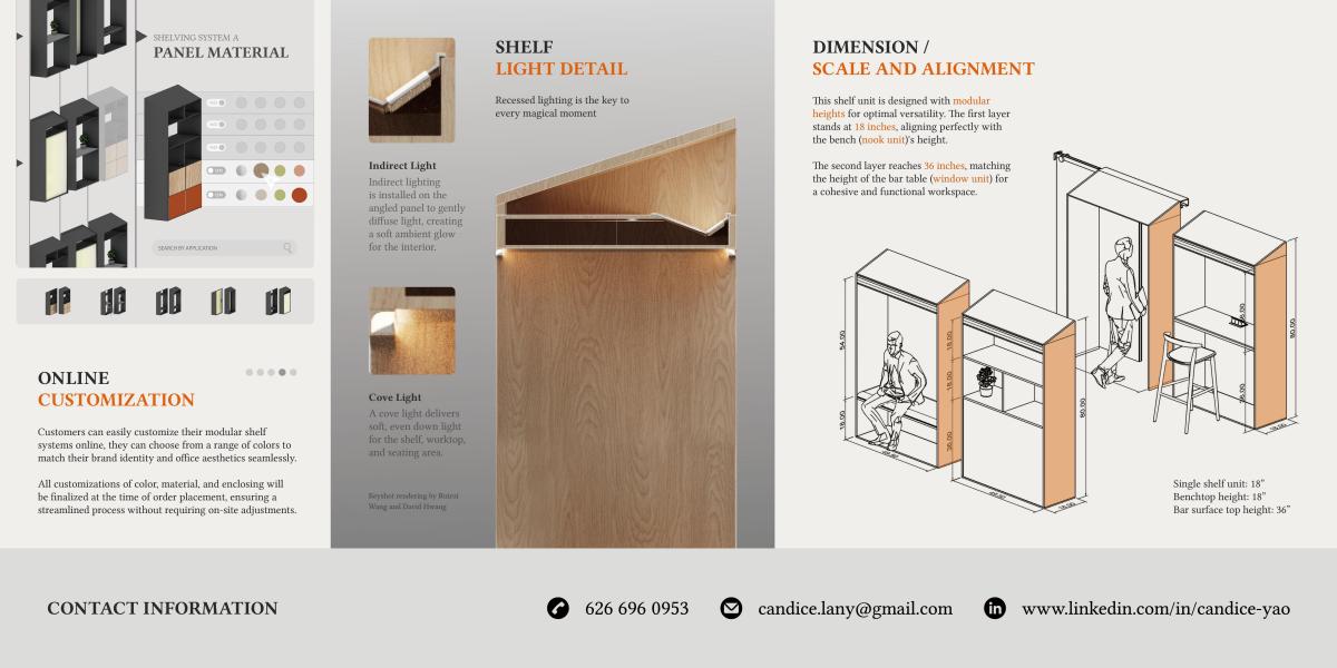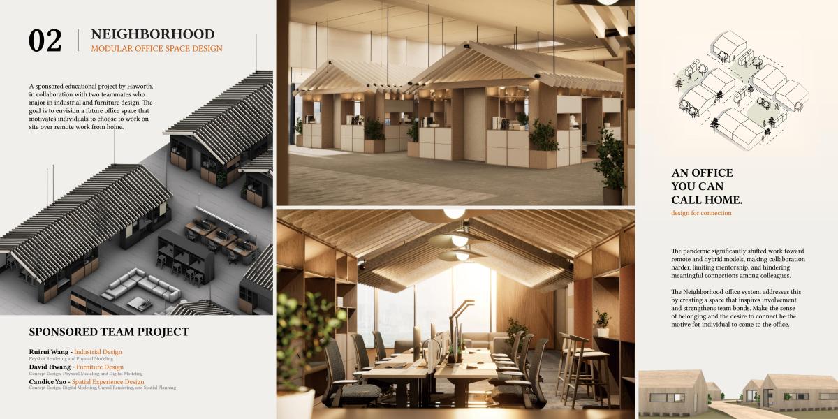 In this project with Industrial Designer Ruirui Wang and Furniture Designer David Hwang, I led design strategy, storytelling, and space planning, using visual communication to convey ideas effectively. I learned to collaborate across disciplines, respect diverse approaches, and understand that successful office design must balance functionality, flexibility, acoustics, lighting, and circulation to support team workflows and collaboration.